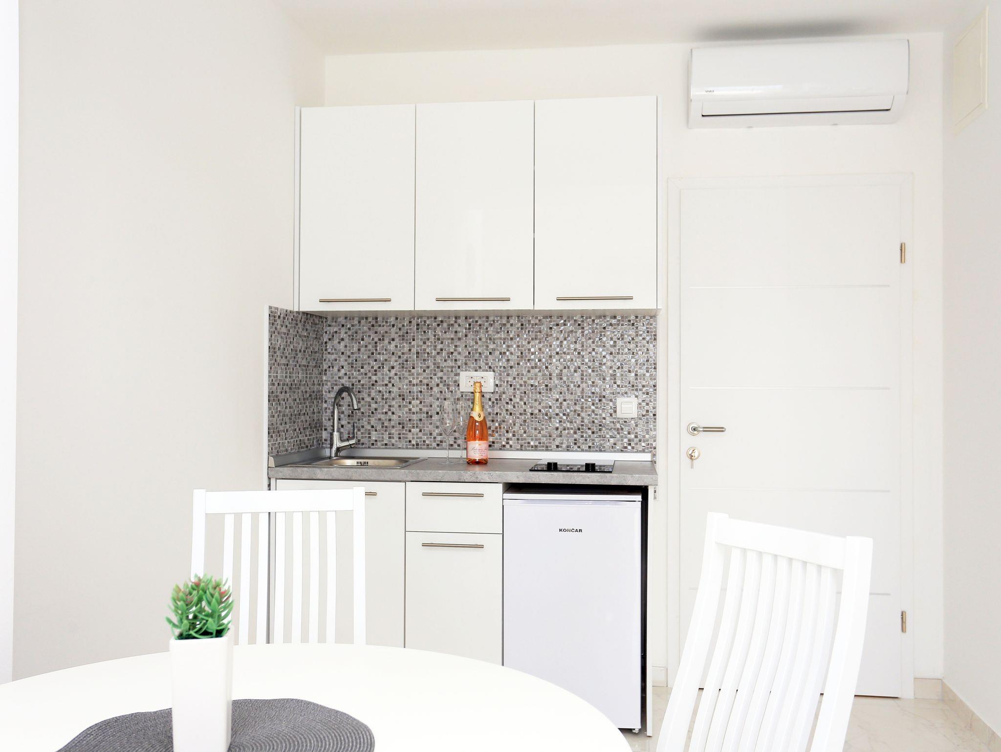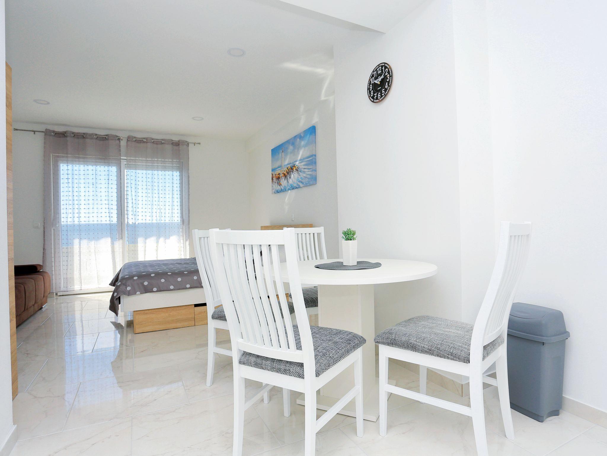 Studio bietet Platz für 3 Gäste. Die Betten sind in Schlafzimmern, die es 1 gibt, innerhalb einer Gesamtfläche von 30m2, angeordnet. Die Gäste haben eine eigene Terrasse zur Verfügung, auf der sie in warmen Sommernächten genießen können. Das Studio-Apartment bietet Meerblick. Während ihres Aufenthalts können Gäste das gemeinsam zur Nutzung stehende Schwimmbad benutzen. IM PREIS INBEGRIFFEN: Kurtaxe, Endreinigung, Klimatisierung, Pool, Parkplatz, Internet, Bügeleisen, Bügelbrett, Föhn. VERBINDLICHE ZUSÄTZLICHE KOSTEN: Aufzahlung für Kurzaufenthalte (prozentualer Zuschlag pro Nächtigungsanzahl: 30% - 1, 20% - 2, 10% - 3). Die Verfügbarkeit zusätzlicher Dienstleistungen in Ihrem reservierten Termin und die Preise derselben (falls nicht aufgeführt) müssen im Voraus überprüft werden. Zusätzliche Dienstleistungen die in der Zahlungsaufforderung nicht aufgeführt sind werden direkt beim Vermieter bezahlt, angenommen der Gast nutzt auch diese. Ermäßigung auf den Grundpreis: Gratistag 21=19 (bei einem Aufenthalt von 21 Tagen oder mehr erhalten Sie 2 Gratistage für den Aufenthalt bis 31.12.26).