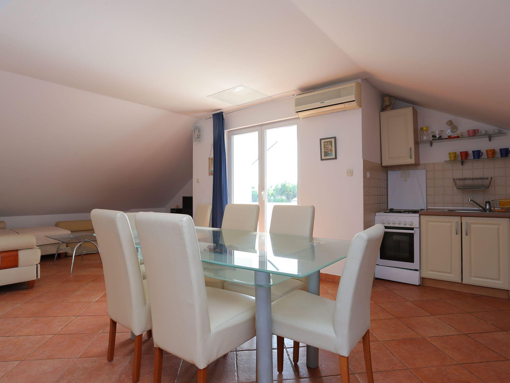 Ferienwohnung bietet Platz für 6 Gäste. Die Betten sind in Schlafzimmern, die es 2 gibt, und in Wohnzimmer, innerhalb einer Gesamtfläche von 65m2, angeordnet. Die Gäste haben eine eigene Terrasse zur Verfügung, auf der sie in warmen Sommernächten genießen können. Das Apartment bietet Meerblick. Es ist erlaubt, Speisen auf dem Gemeinschafts-Grill vorzubereiten. In der Unterkunftseinheit besteht die Möglichkeit des Mitbringens von Haustieren gegen Aufpreis. IM PREIS INBEGRIFFEN: Kurtaxe, Endreinigung, Klimatisierung, Parkplatz, Internet, Wäschewaschen, Kinderbett, Bügeleisen, Föhn, tragbarer Grill. VERBINDLICHE ZUSÄTZLICHE KOSTEN: Aufzahlung für Kurzaufenthalte (prozentualer Zuschlag pro Nächtigungsanzahl: 30% - 1, 20% - 2, 10% - 3). UNVERBINDLICHE ZUSÄTZLICHE KOSTEN: Haustiere (10,00 € pro Nacht). Die Verfügbarkeit zusätzlicher Dienstleistungen in Ihrem reservierten Termin und die Preise derselben (falls nicht aufgeführt) müssen im Voraus überprüft werden. Zusätzliche Dienstleistungen die in der Zahlungsaufforderung nicht aufgeführt sind werden direkt beim Vermieter bezahlt, angenommen der Gast nutzt auch diese.