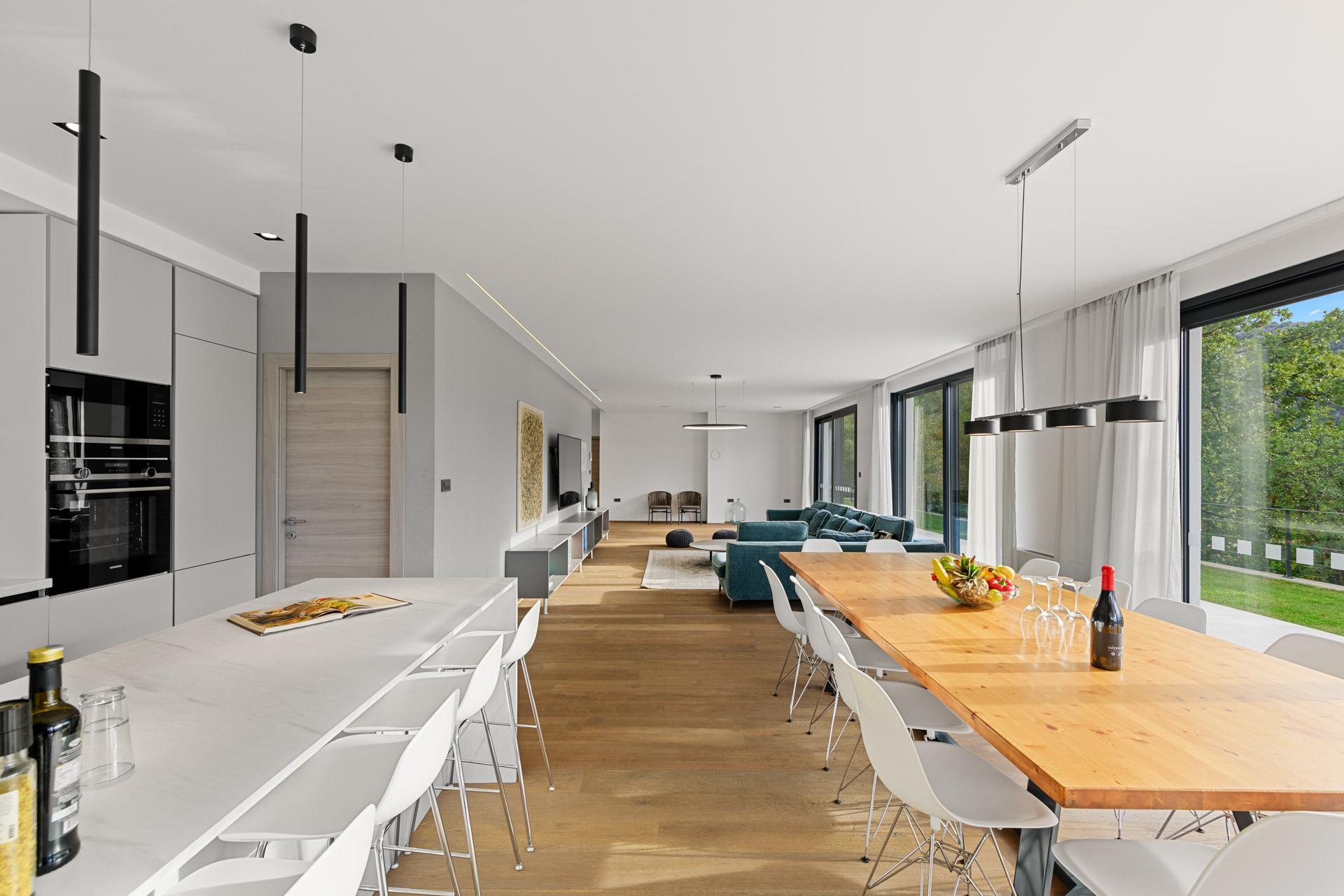 Die Räume sind hell und offen gestaltet. Küche, Essbereich und Wohnzimmer bieten viel Platz für gemeinsame Stunden.