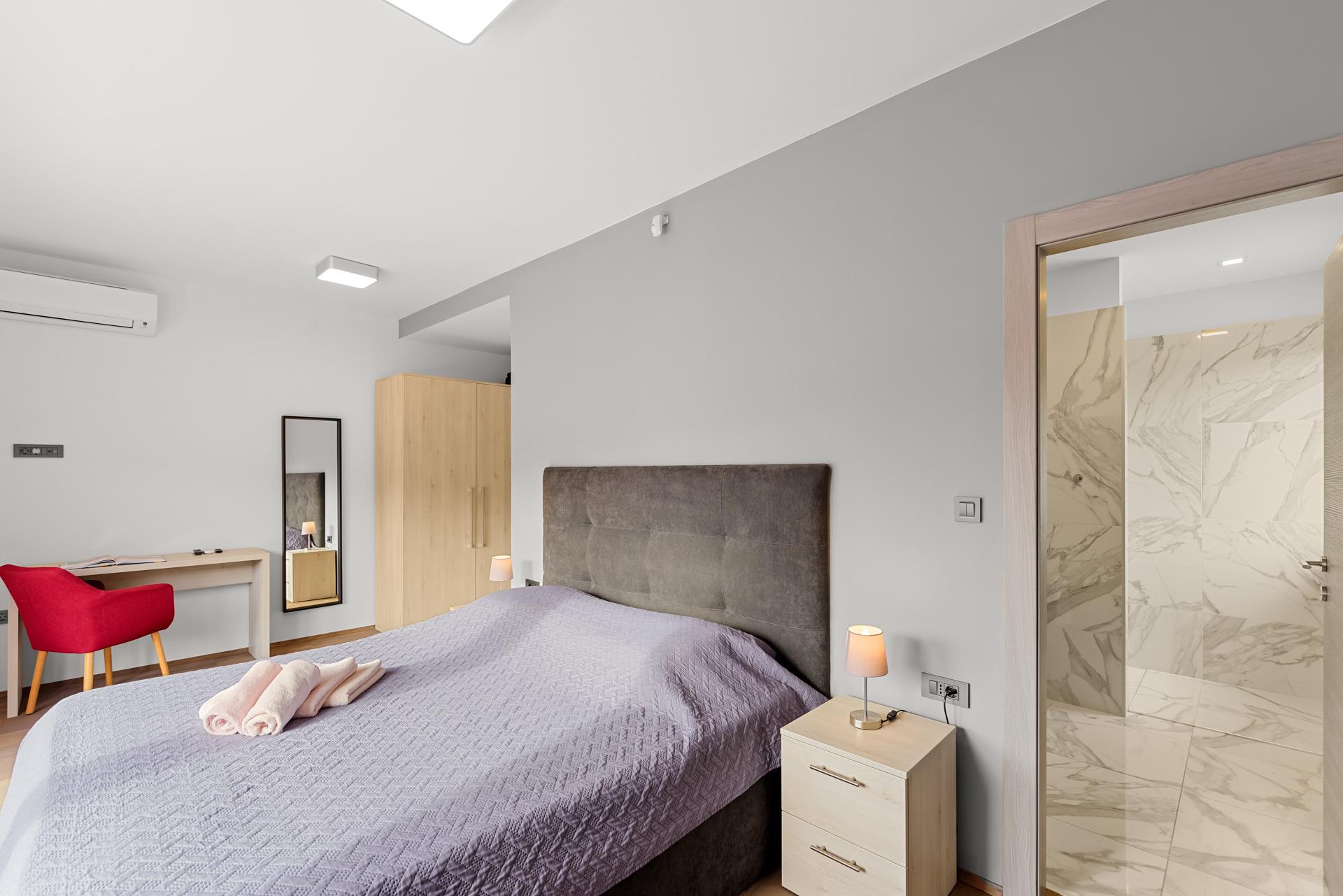 Sechs Schlafzimmer verfügen über ein eigenes Bad, Klimaanlage und Balkonzugang. Dadurch finden bis zu zwölf Gäste bequem Platz. Zudem sorgt die Fußbodenheizung in kühleren Monaten für wohlige Wärme. Dank durchdachter Details wird jeder Aufenthalt besonders angenehm.