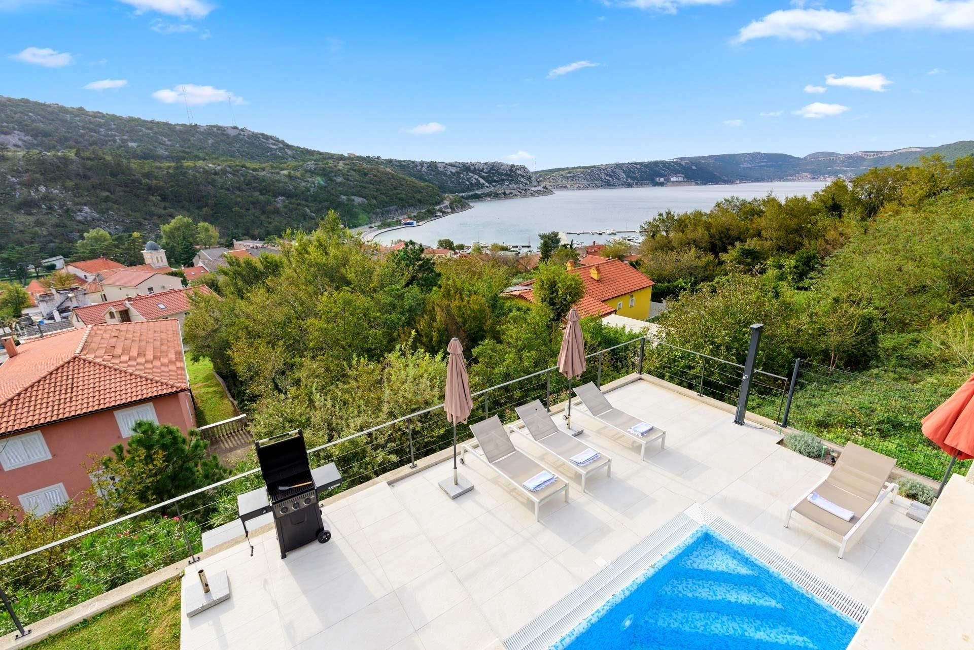 Im Zentrum der Villa liegt ein 34 m² großer Pool. Die Terrasse rundherum lädt zu sonnigen Tagen und geselligen Grillabenden ein. Kinder können auf dem Rasen Volleyball oder Badminton spielen, während Erwachsene den Blick auf die Bucht von Bakarac genießen.