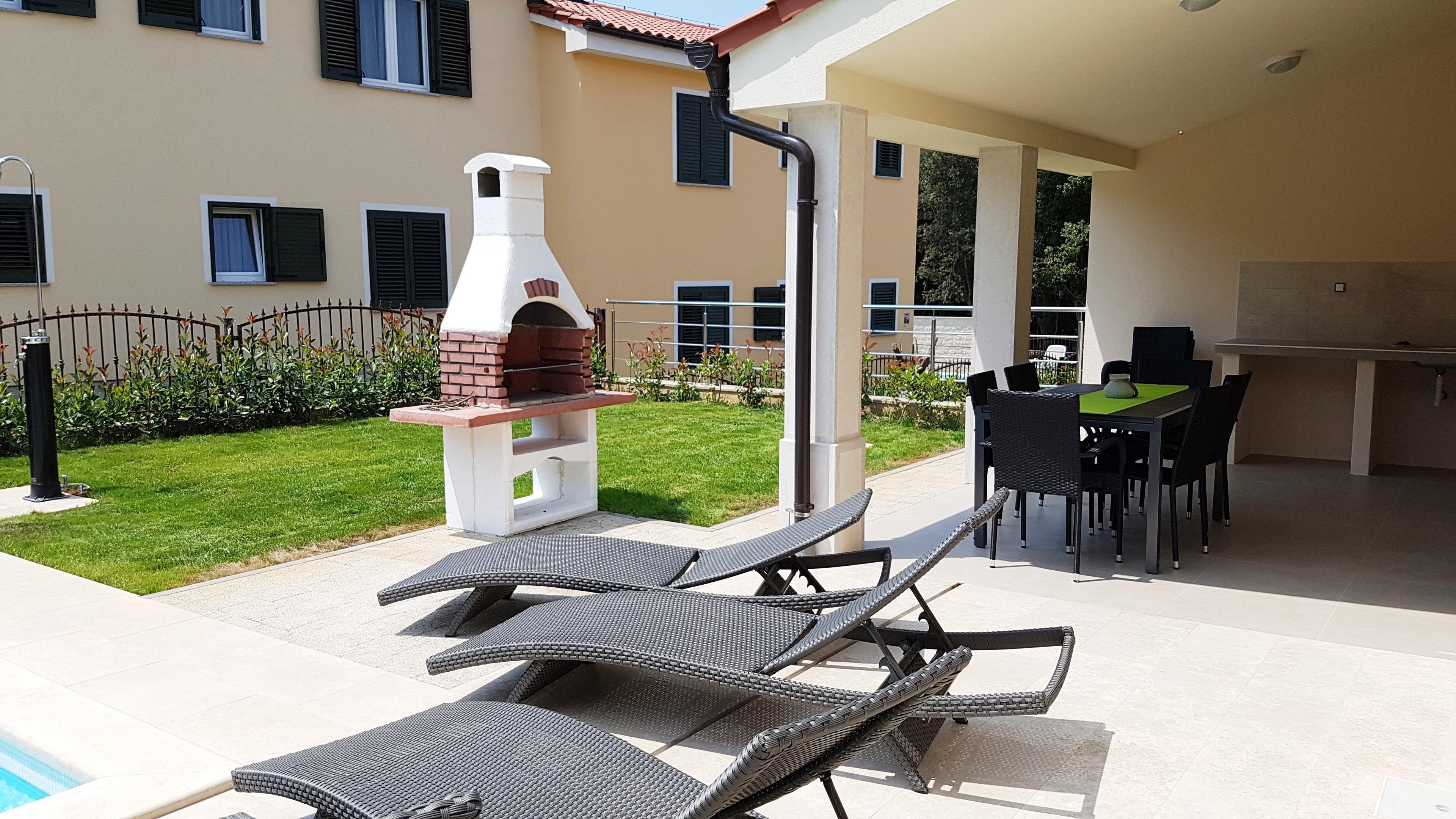 Die Villa bietet Platz für bis zu 8 + 2 Gäste. In der Villa gibt es 4 Schlafzimmer, jedes hat ein eigenes Badezimmer. Entspannen Sie im gemütlichen Wohnzimmer und machen köstliche Mahlzeiten in der voll ausgestatteten Küche mit Essbereich. Sie können sich im grünen Garten mit privatem Pool entspannen, auf Liegestühlen legen und die Sonne genießen. Sie können auch Spezialitäten auf Holzkohle Grill für Ihre Freunde und Familie vorbereiten. Wenn Sie zum Strand gehen wollen, nehmen Sie einfach Ihr Handtuch und in wenigen Minuten zu Fuß sind Sie am Strand, aber auch zu Fuß erreichbar gibt es tolle Restaurants. Die Villa ist klimatisiert, hat WiFi, Privatparkplatz für 3 Autos und bietet alles für einen angenehmen Urlaub.