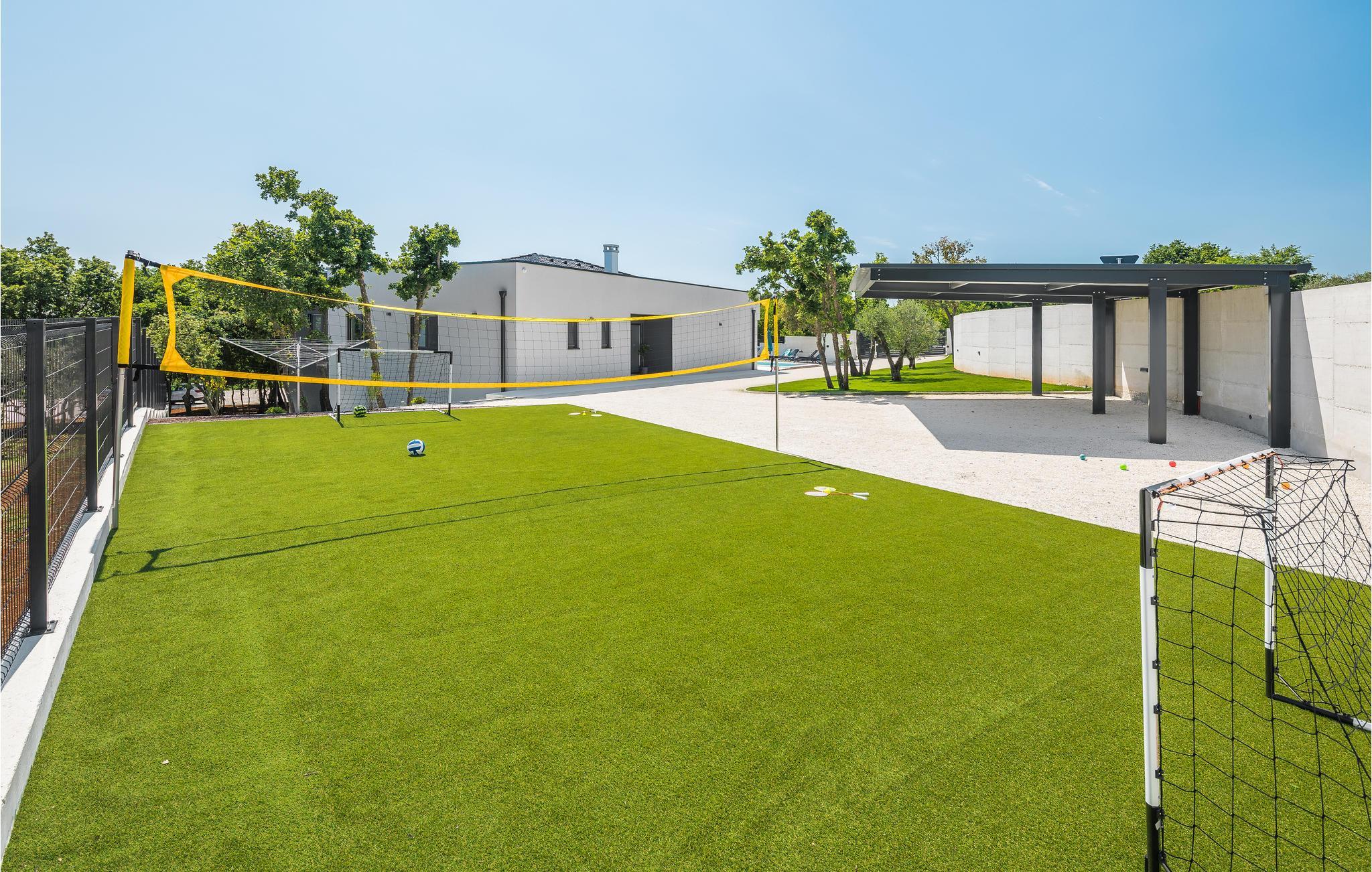 Ved siden af ??huset er der en næsten 100 m² legeplads med kunstgræs og mål til fodbold og et net til badminton og volleyball.