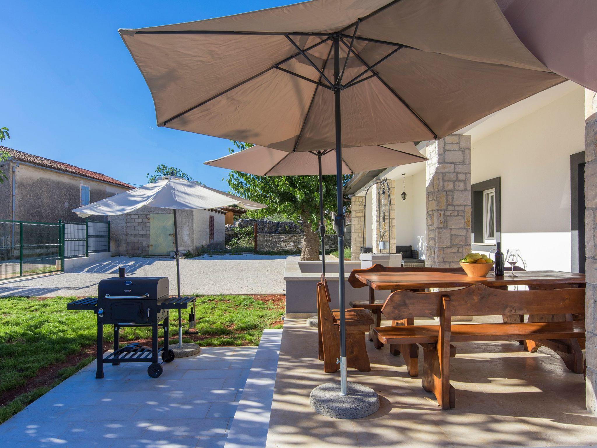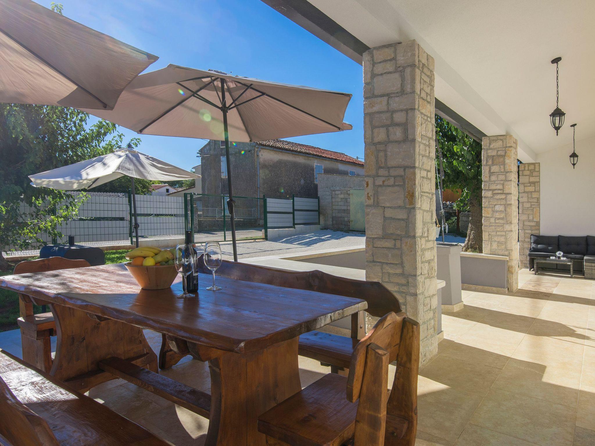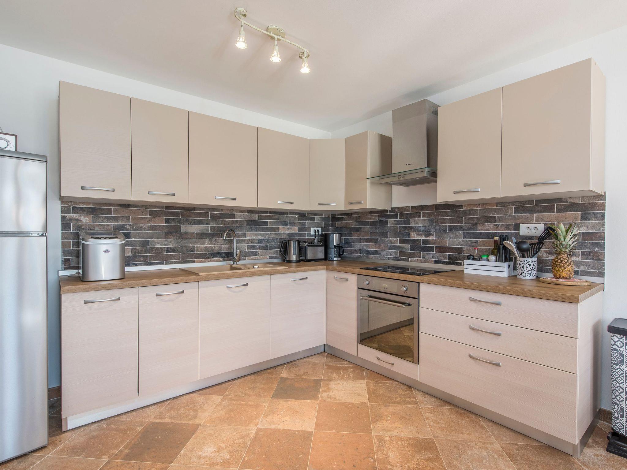 The house, suitable for up to 8 people (7 (+1)), is located on the outskirts of Rebici. The beach of Rebici is 2 km away via a tarmac road. In the courtyard there is a 25 m² pool (optionally heated) with sun loungers, rattan rocking chairs and parasols. In the garden next to the house there is a small children's playground. On the ground floor there is a terrace with barbecue and rustic wooden table with seating for up to 10 people, as well as a cosy rattan seating area. The terrace with sea view on the top floor is equipped with a romantic seating area. On the ground floor there is the living room with Swedish stove, popcorn machine, couch corner and satellite TV, a bathroom, as well as a kitchen (equipped with cooker, oven, refrigerator, dishwasher) with a large dining table.