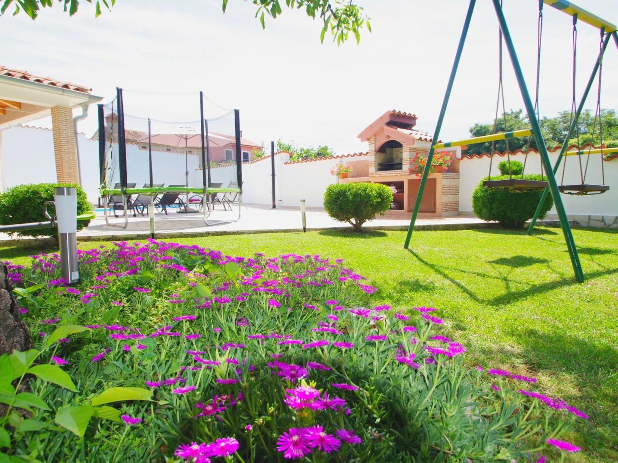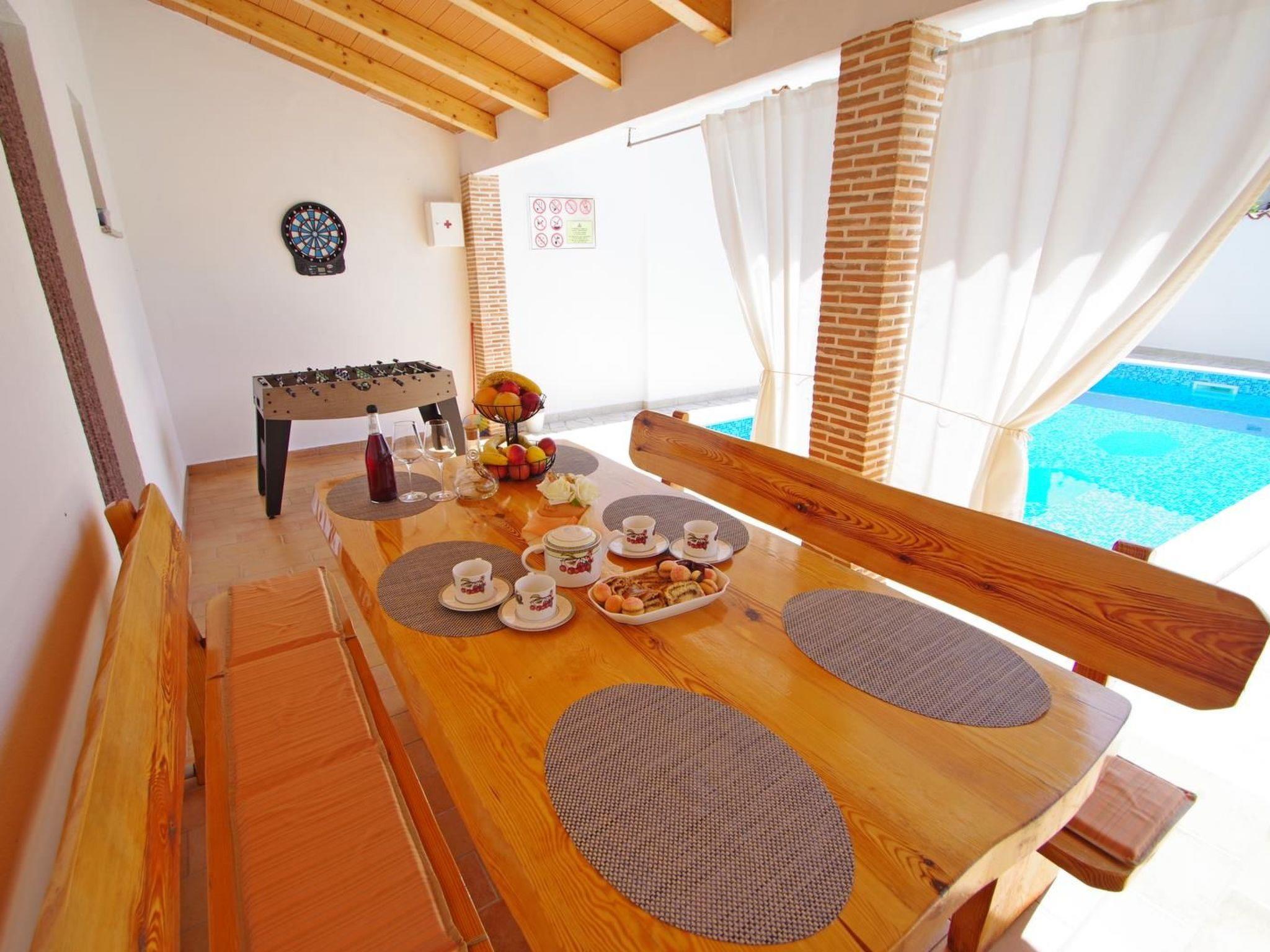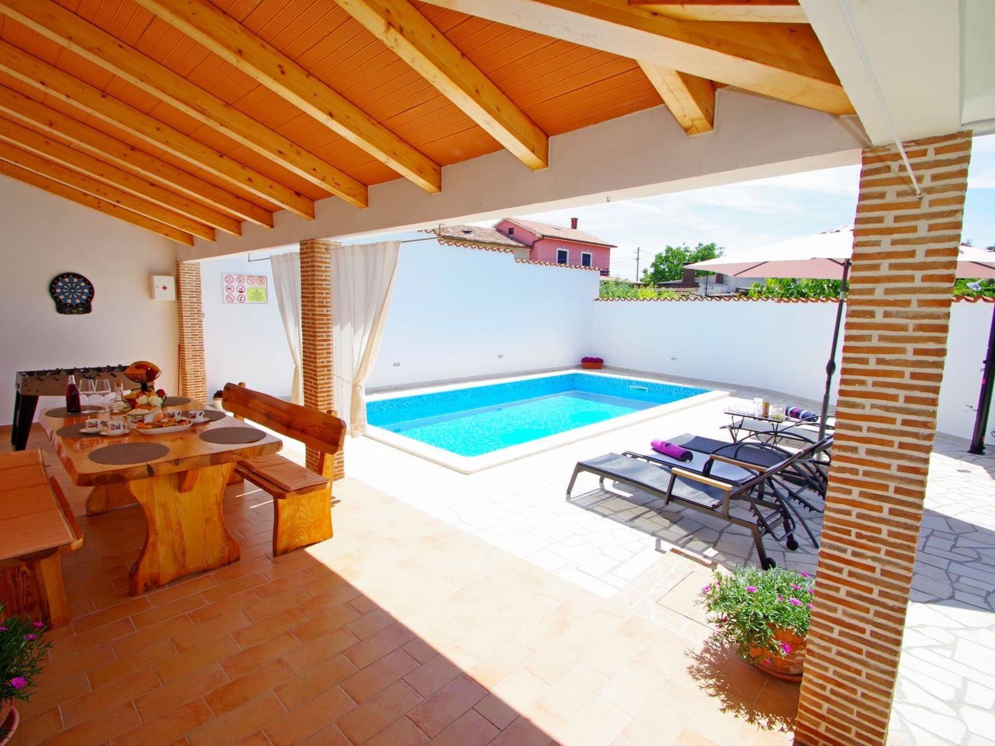 Swimming pool size is 25 m2 and 1,35 m depth, surrounded with 8 sun beds, outside shower, sun umbrella, BBQ.