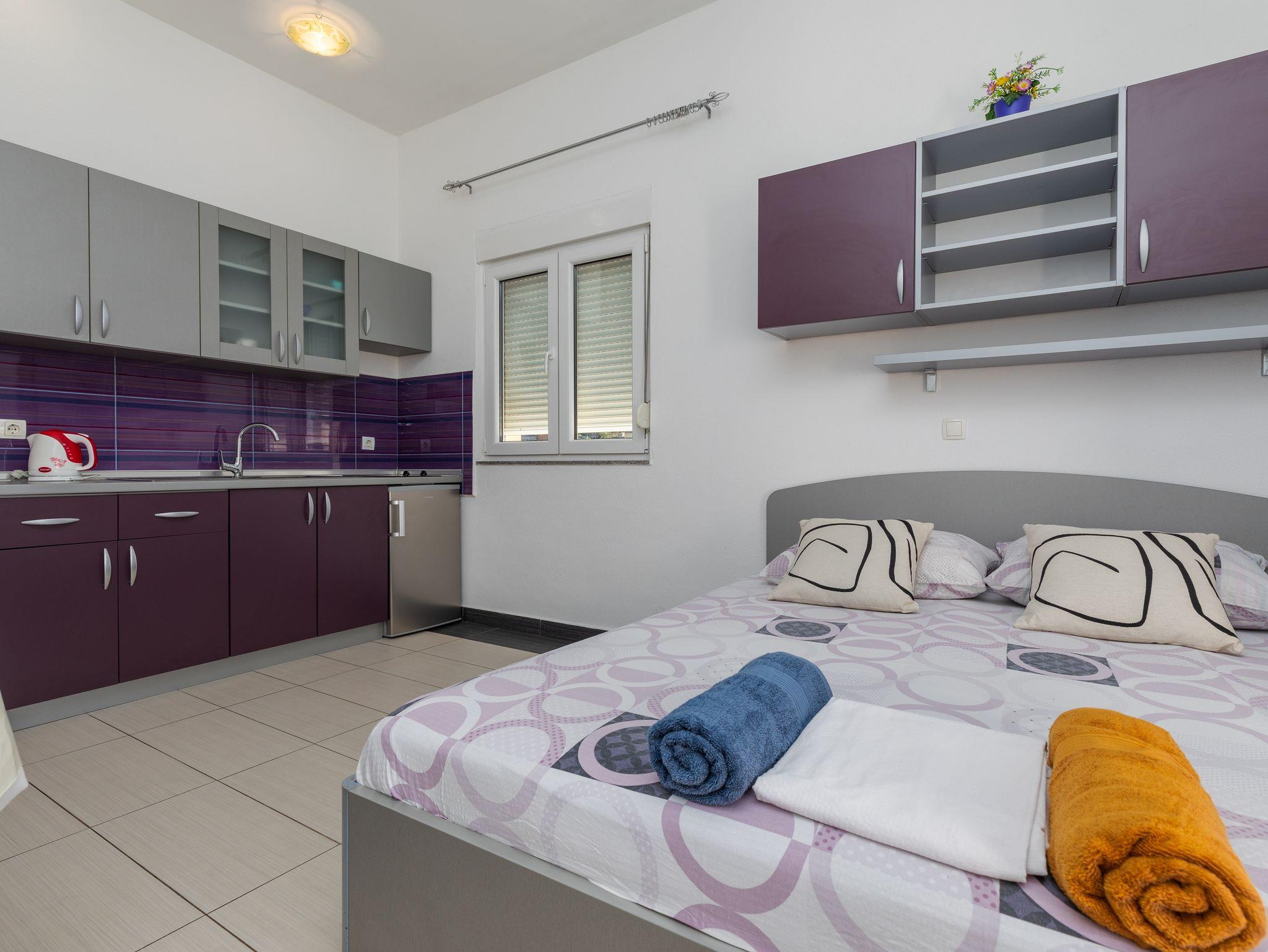 Studio bietet Platz für 2 Gäste. Die Betten sind in Schlafzimmern, die es 1 gibt, innerhalb einer Gesamtfläche von 23m2, angeordnet. Die Gäste haben einen eigenen Balkon zur Verfügung, auf der sie in warmen Sommernächten genießen können. Das Studio-Apartment bietet Meerblick. Es ist erlaubt, Speisen auf dem Gemeinschafts-Grill vorzubereiten. IM PREIS INBEGRIFFEN: Kurtaxe, Endreinigung, Klimatisierung, Parkplatz, Internet, Kinderbett. VERBINDLICHE ZUSÄTZLICHE KOSTEN: Aufzahlung für Kurzaufenthalte (prozentualer Zuschlag pro Nächtigungsanzahl: 30% - 1, 20% - 2, 10% - 3). Die Verfügbarkeit zusätzlicher Dienstleistungen in Ihrem reservierten Termin und die Preise derselben (falls nicht aufgeführt) müssen im Voraus überprüft werden. Zusätzliche Dienstleistungen die in der Zahlungsaufforderung nicht aufgeführt sind werden direkt beim Vermieter bezahlt, angenommen der Gast nutzt auch diese.