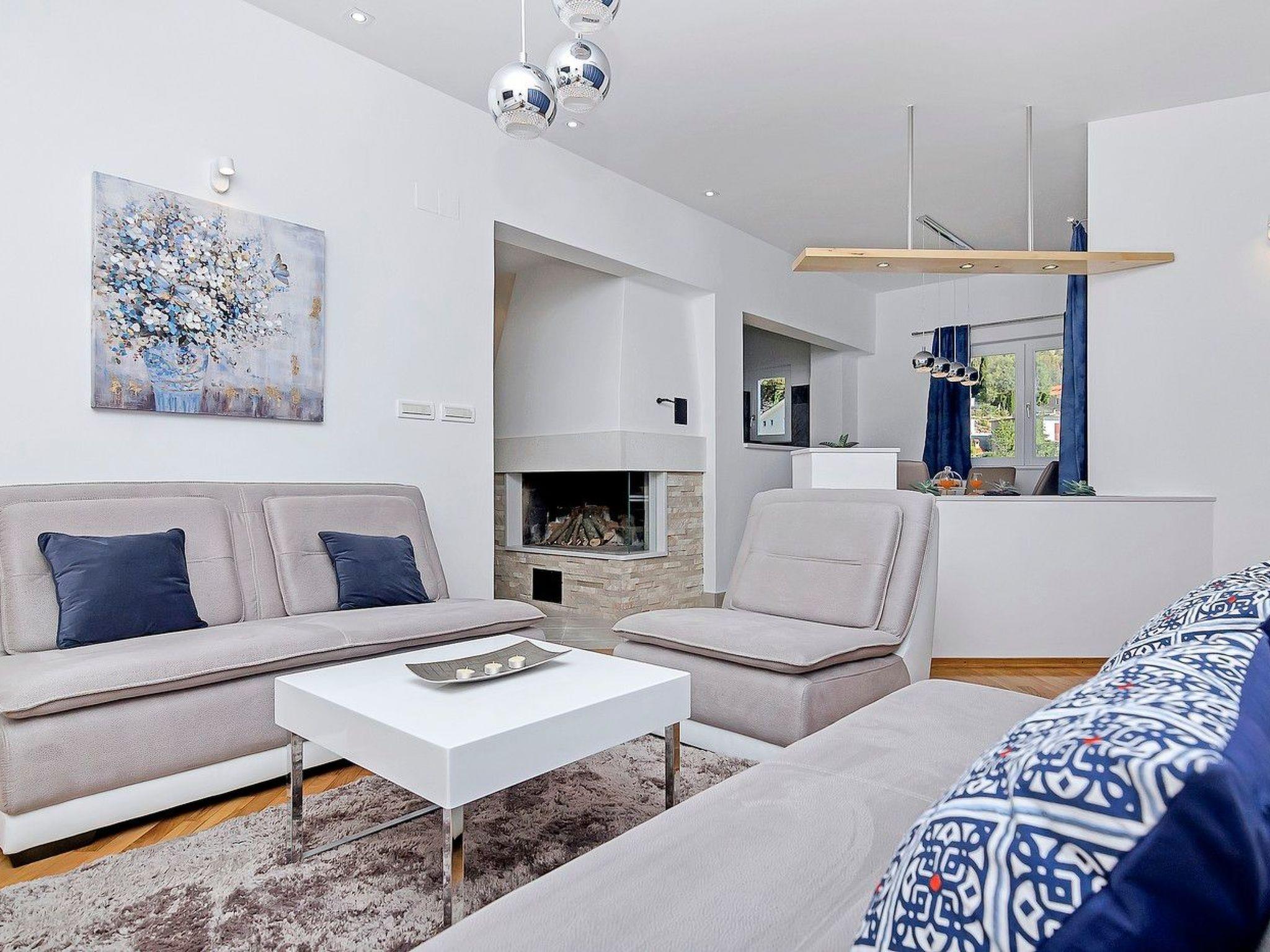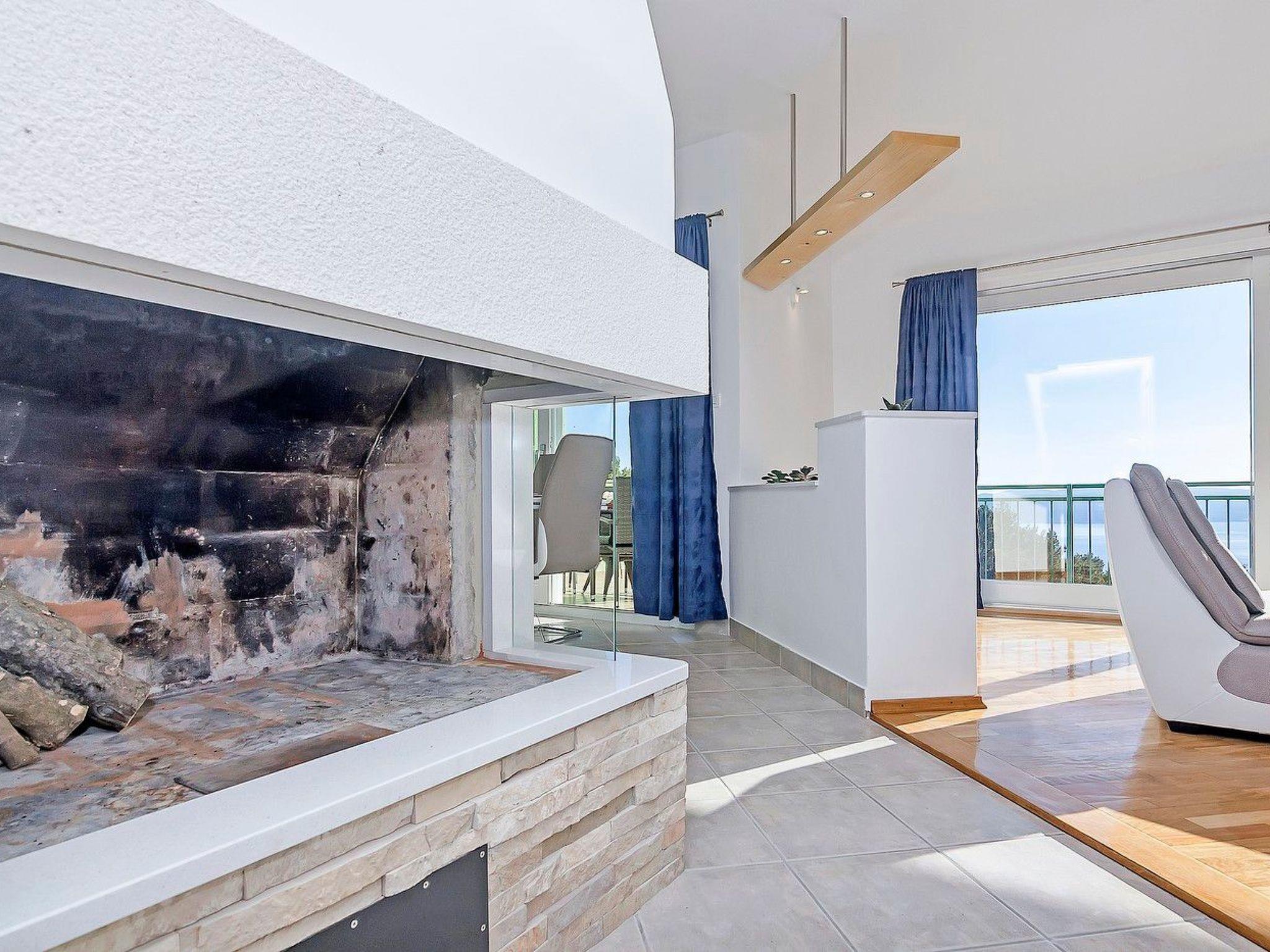 There are a total of three bedrooms with double beds. The holiday home has three floors, two of which are rented out, the first floor is closed and is neither inhabited nor rented out. On the second floor there is a complete flat with two bedrooms, both with double beds and en-suite bathrooms. The spacious living room with fireplace, open kitchen and balcony with beautiful sea views. All rooms are air-conditioned, WLAN, TV/SAT with German programmes. On the ground floor, next to the pool, is the third bedroom with double bed and bathroom. The terrace with heated pool, sun loungers, outdoor shower invites you to relax. The holiday home Sergio is ideal for families with children on holiday in Dalmatia.