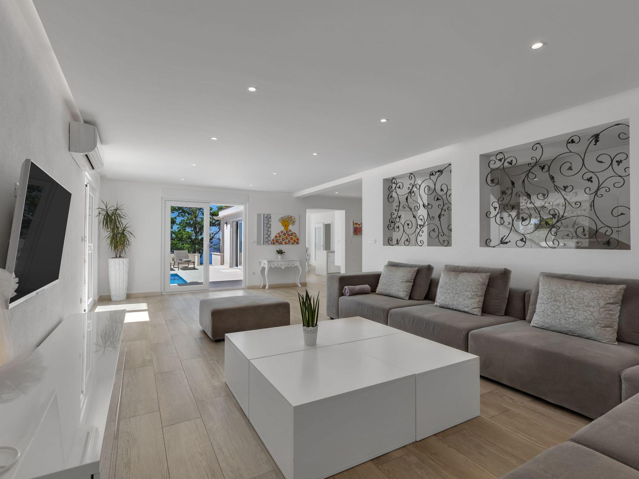 The spacious and modern living room with fully equipped kitchen and dining room for 12 people has a large terrace with swimming pool offering a magnificent view of the sea.