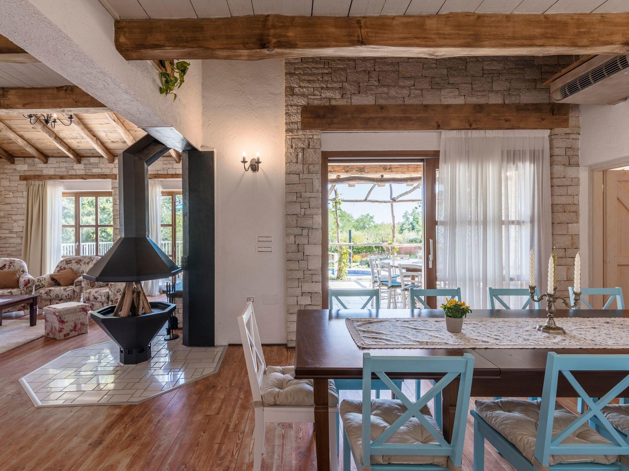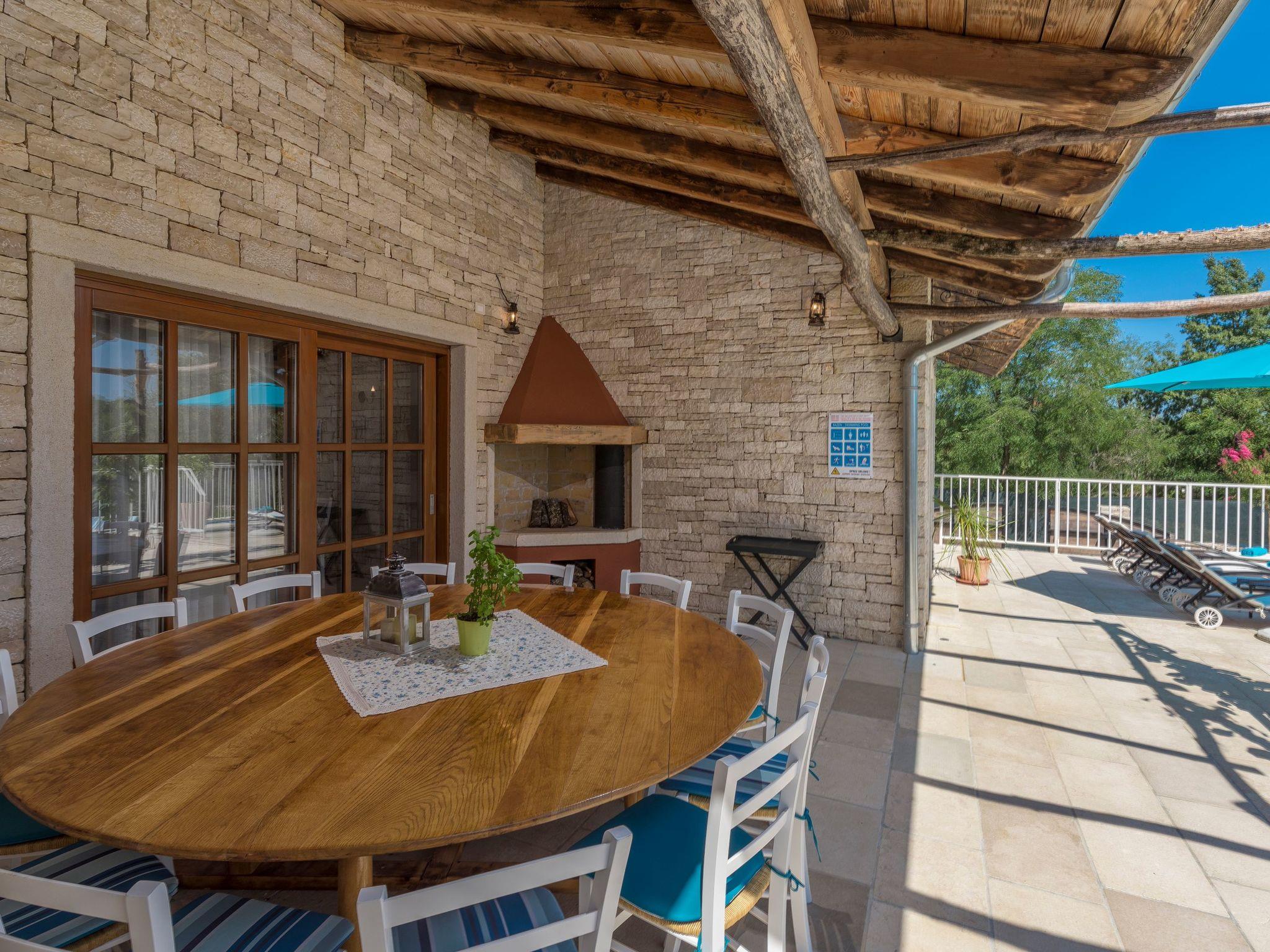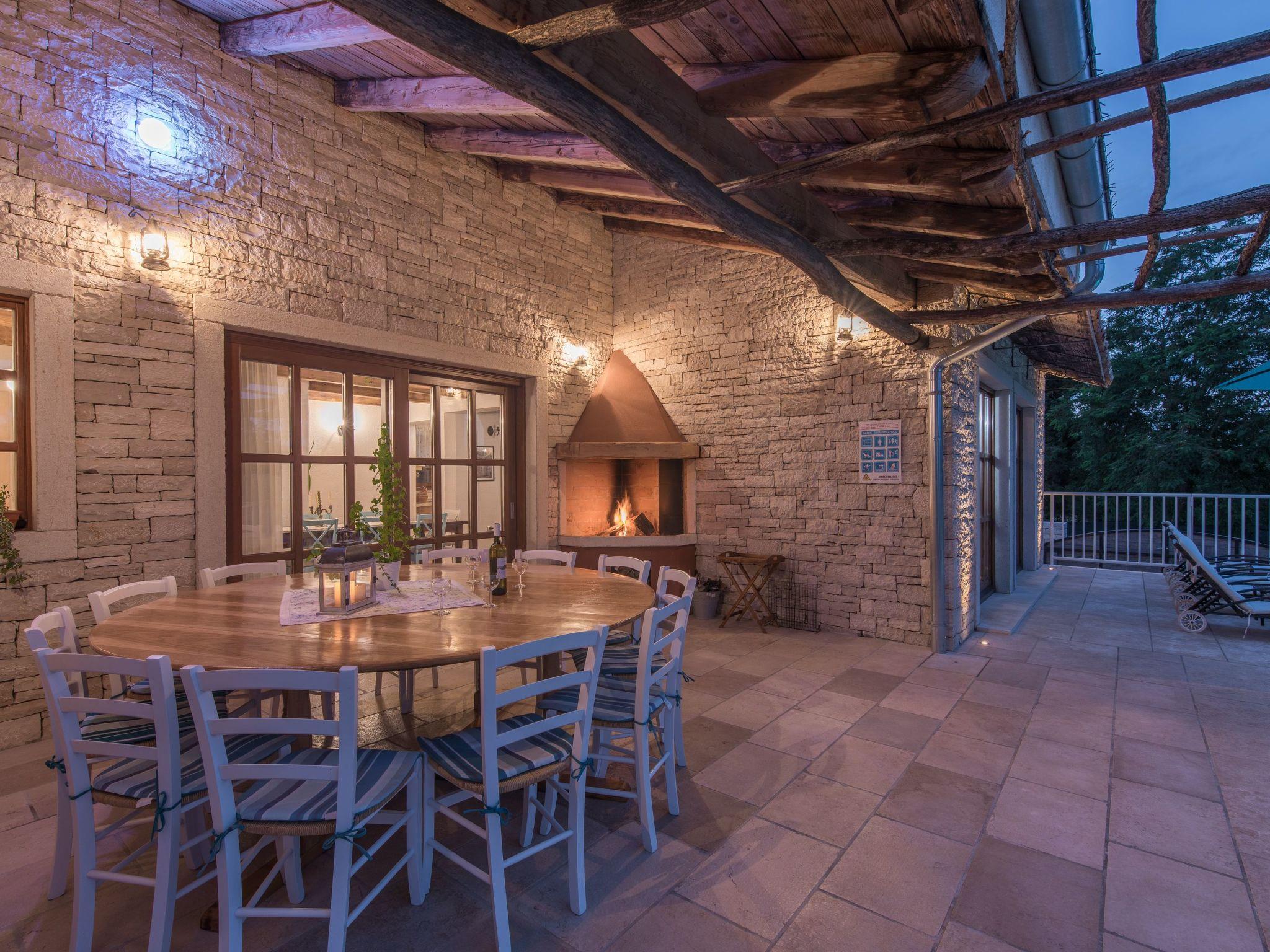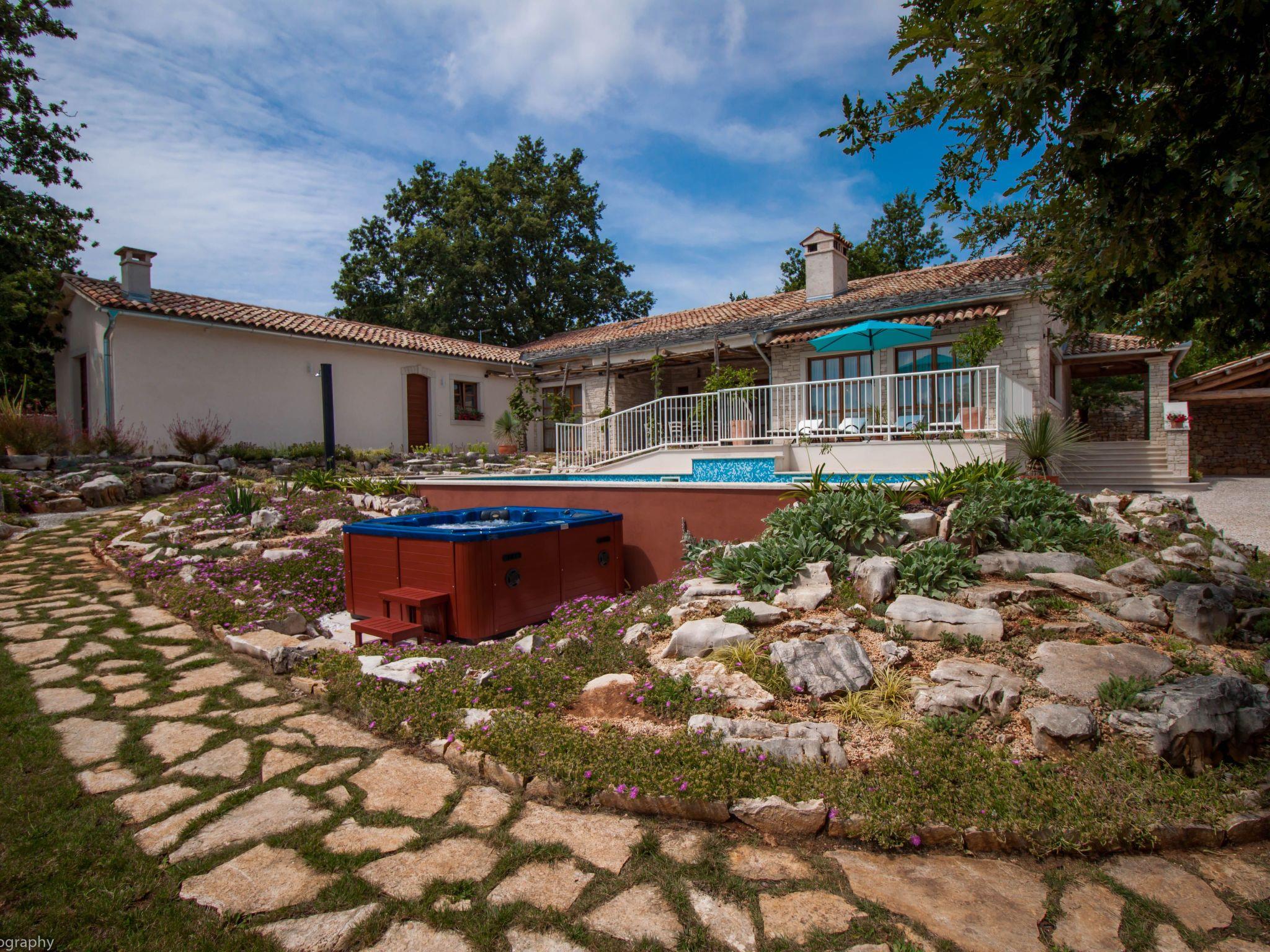 Steping outside the house you have a big terrace with a big round table and a fireplace which is covered and protected from rain. The pool starts out with a small round kids pool and transitions into a big pool where by its side sits a jacuzzi. The whole terrace is surrounded with a traditional Istrian garden decorated with stones. There are deck chairs on terrace or you can choose to relax among vine or olive trees on a big spacious, green lawn.