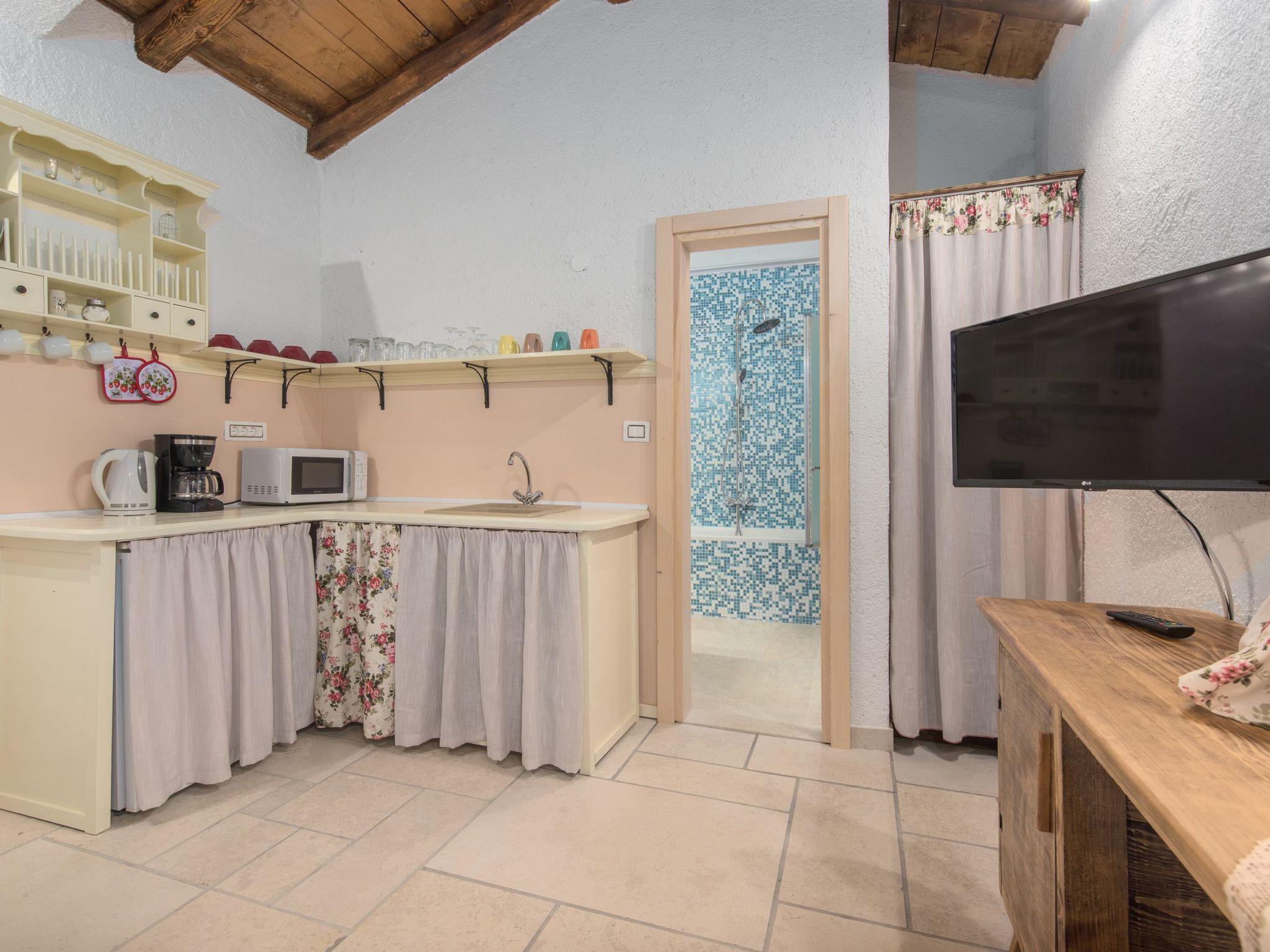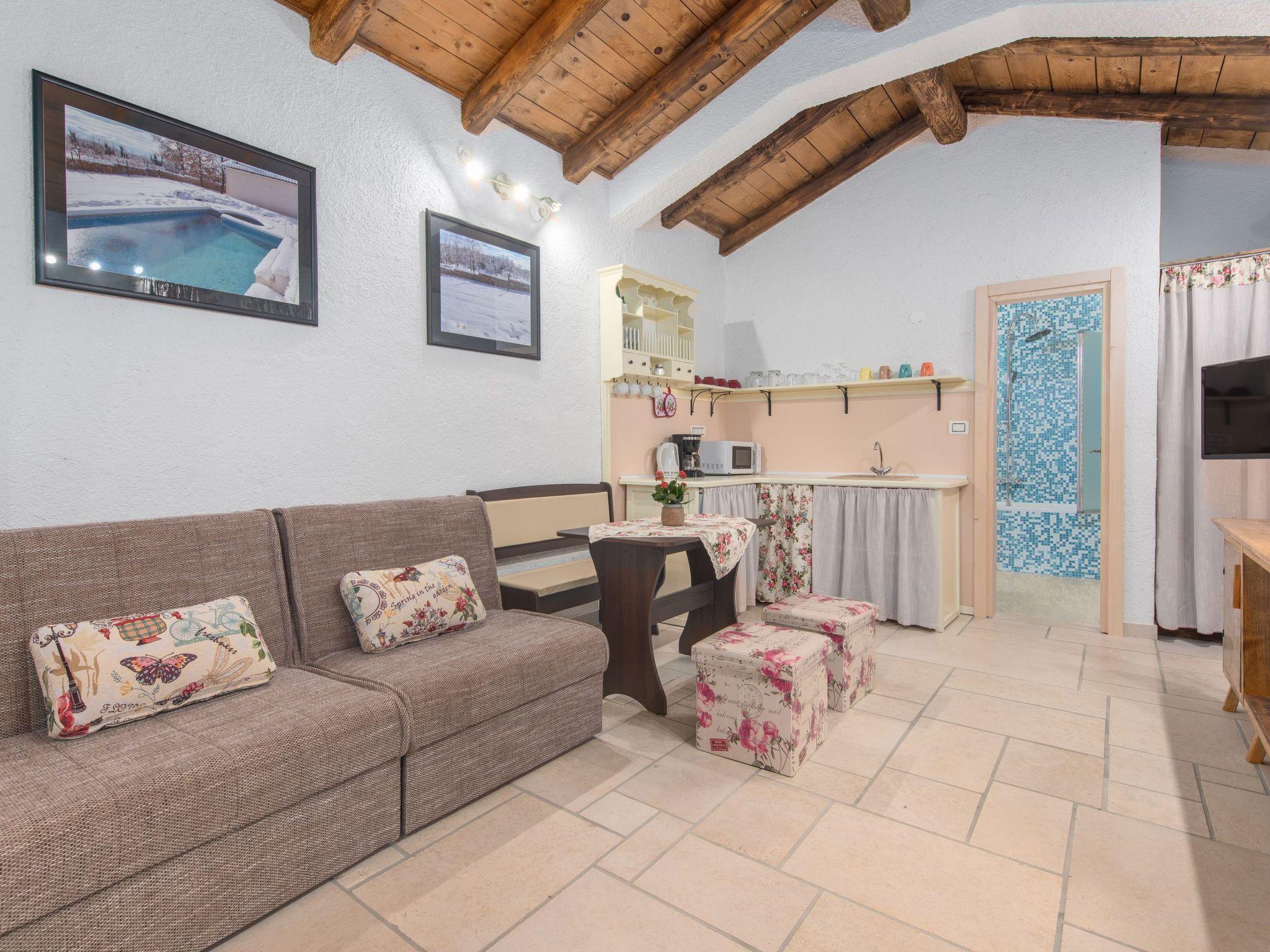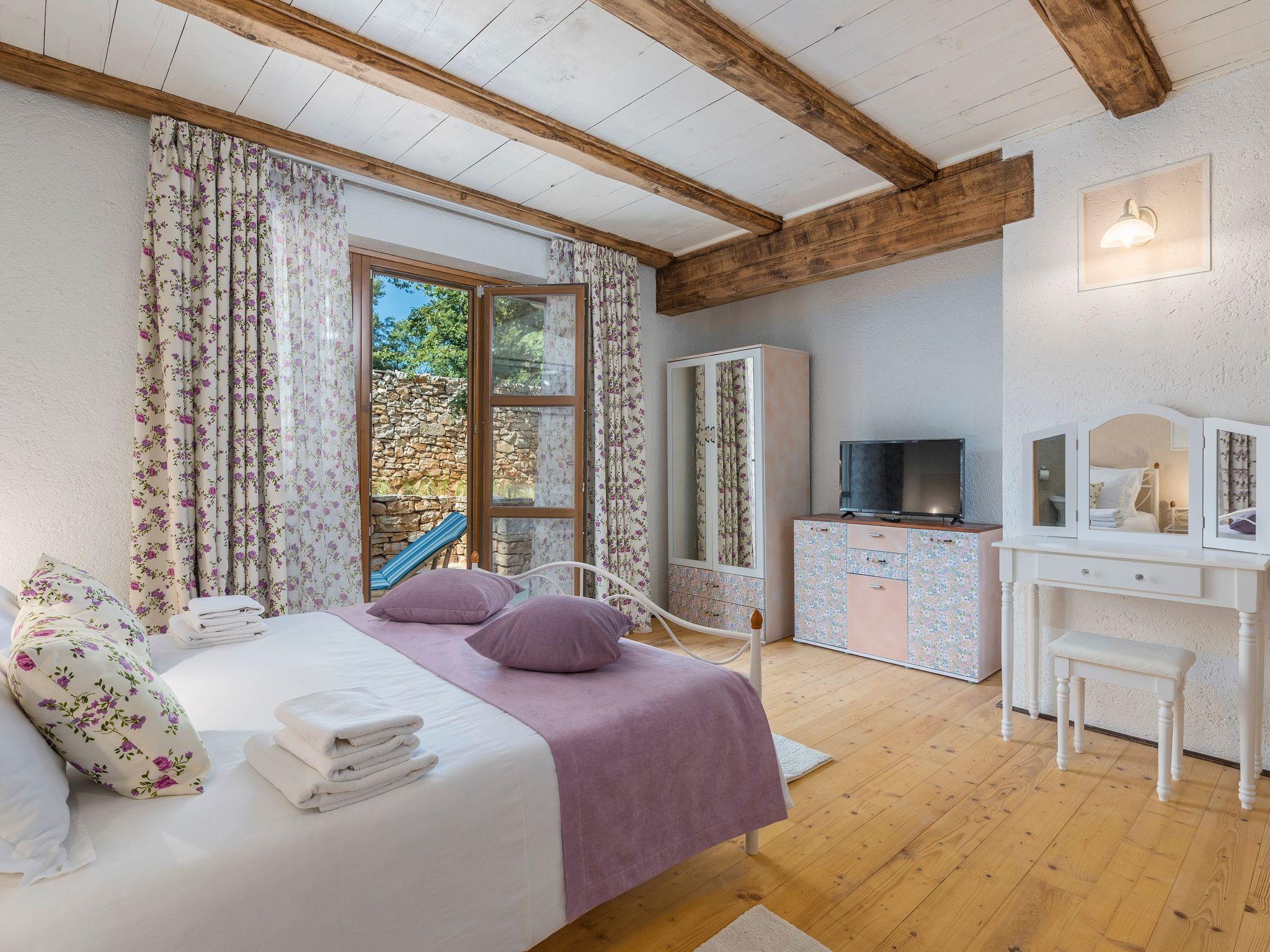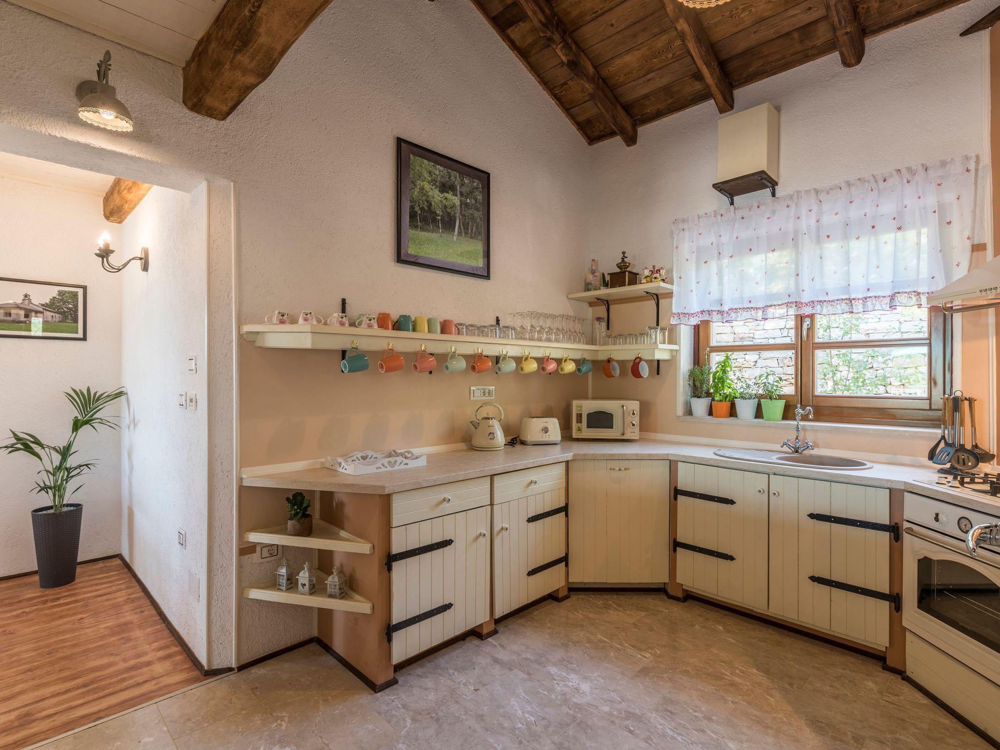 Steping outside the house you have a big terrace with a big round table and a fireplace which is covered and protected from rain. The pool starts out with a small round kids pool and transitions into a big pool where by its side sits a jacuzzi. The whole terrace is surrounded with a traditional Istrian garden decorated with stones. There are deck chairs on terrace or you can choose to relax among vine or olive trees on a big spacious, green lawn.