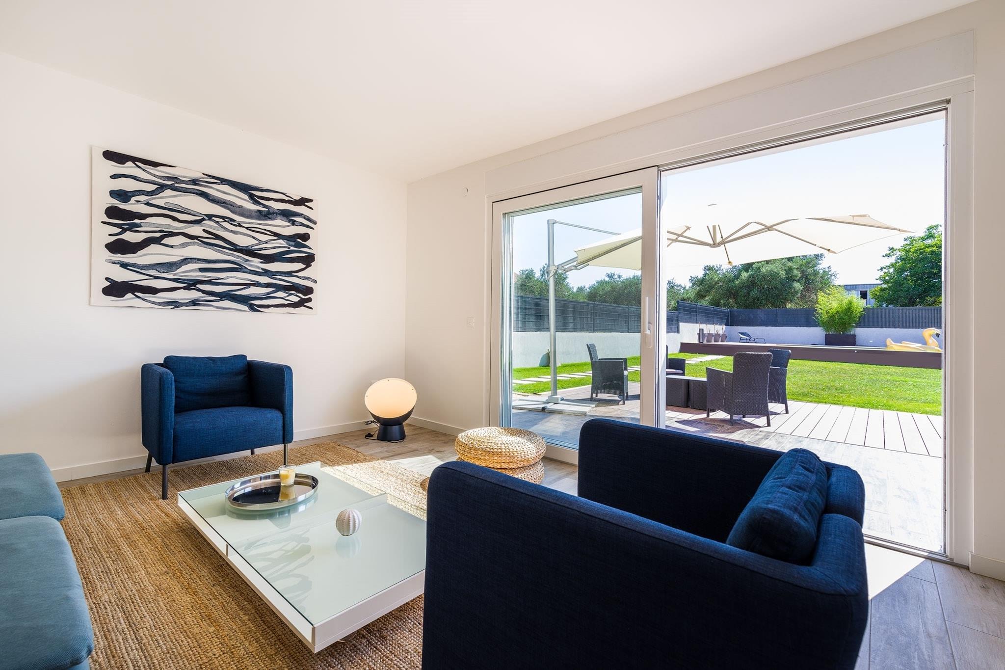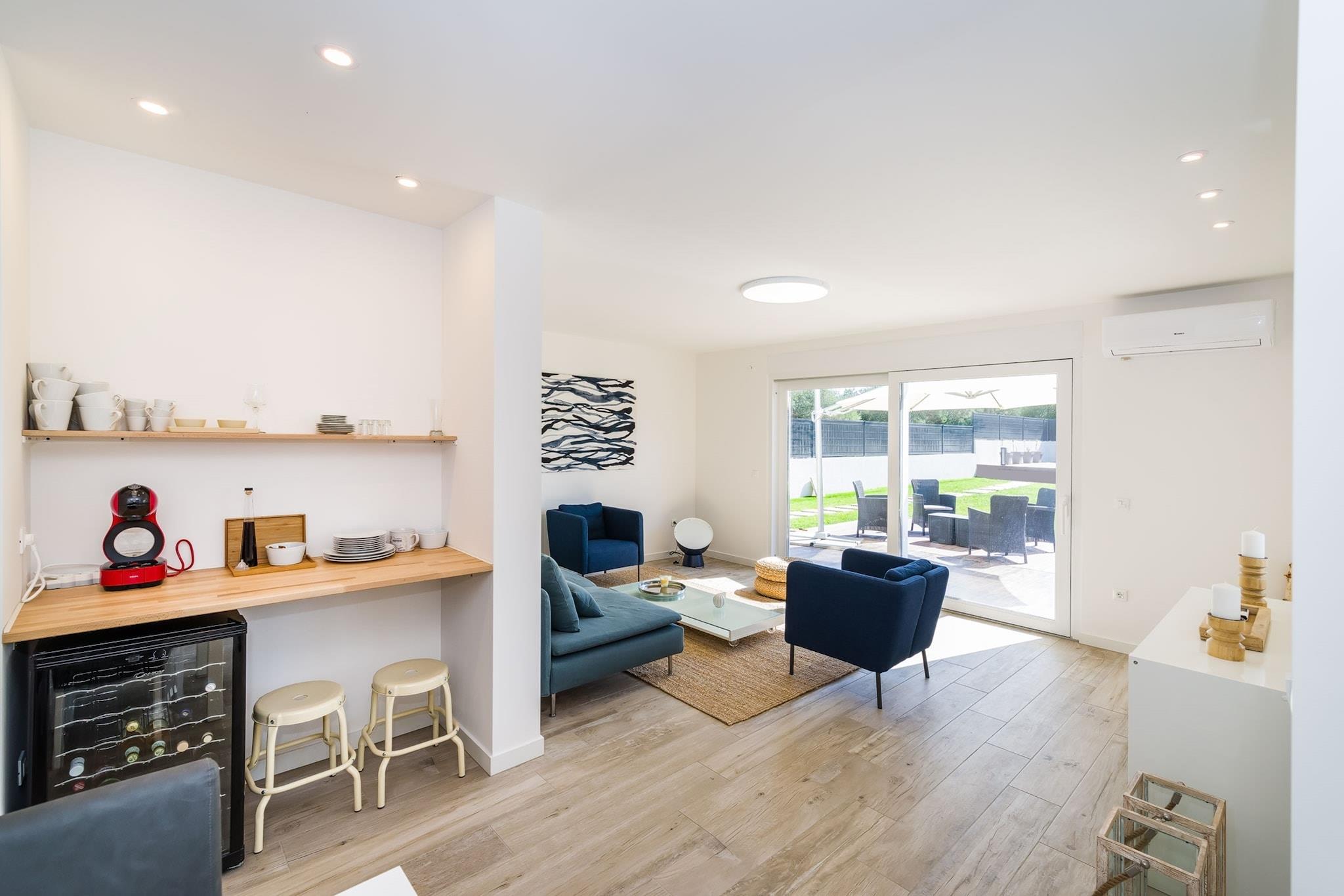 Stueetage: (åbent køkken(elkedel, brødrister, komfur(Komfur med fire kogeplader, induktion), kaffemaskine, mikrobølgeovn, opvaskemaskine , køle-fryseskab), stue / spisestue(spisebord(4 personer), sofahjørne, stereoanlæg, klimaanlæg), Soveværelse med badeværelse(dobbeltseng, bruser, håndvask, toilet), Soveværelse med badeværelse(dobbeltseng eller 2 enkeltsenge Senge, bruser, håndvask, toilet), vaskerum (håndvask, toilet, vaskemaskine, strygebræt, strygejern), terrasse(privat, overdækket)) På 1. etage: (Indgang (adgang udefra), åbent køkken(elkedel, brødrister, komfur(Komfur med fire kogeplader, induktion), kaffemaskine, mikrobølgeovn, opvaskemaskine , køle-fryseskab), stue / spisestue(spisebord(4 personer), sofahjørne, klimaanlæg), Soveværelse med badeværelse(dobbeltseng, bruser, håndvask, toilet), Soveværelse med badeværelse(dobbeltseng eller 2 enkeltsenge Senge, bruser, håndvask, toilet), toilet(håndvask, toilet), balkon eller terrasse) grill, bruser med lysterapi, varme, have(privat, indhegnet, oplyst, 500 m2), havemøbler, solstole, grill, parkering, Parasol, swimmingpool(privat, 8 x 4 m.), loungemøbler