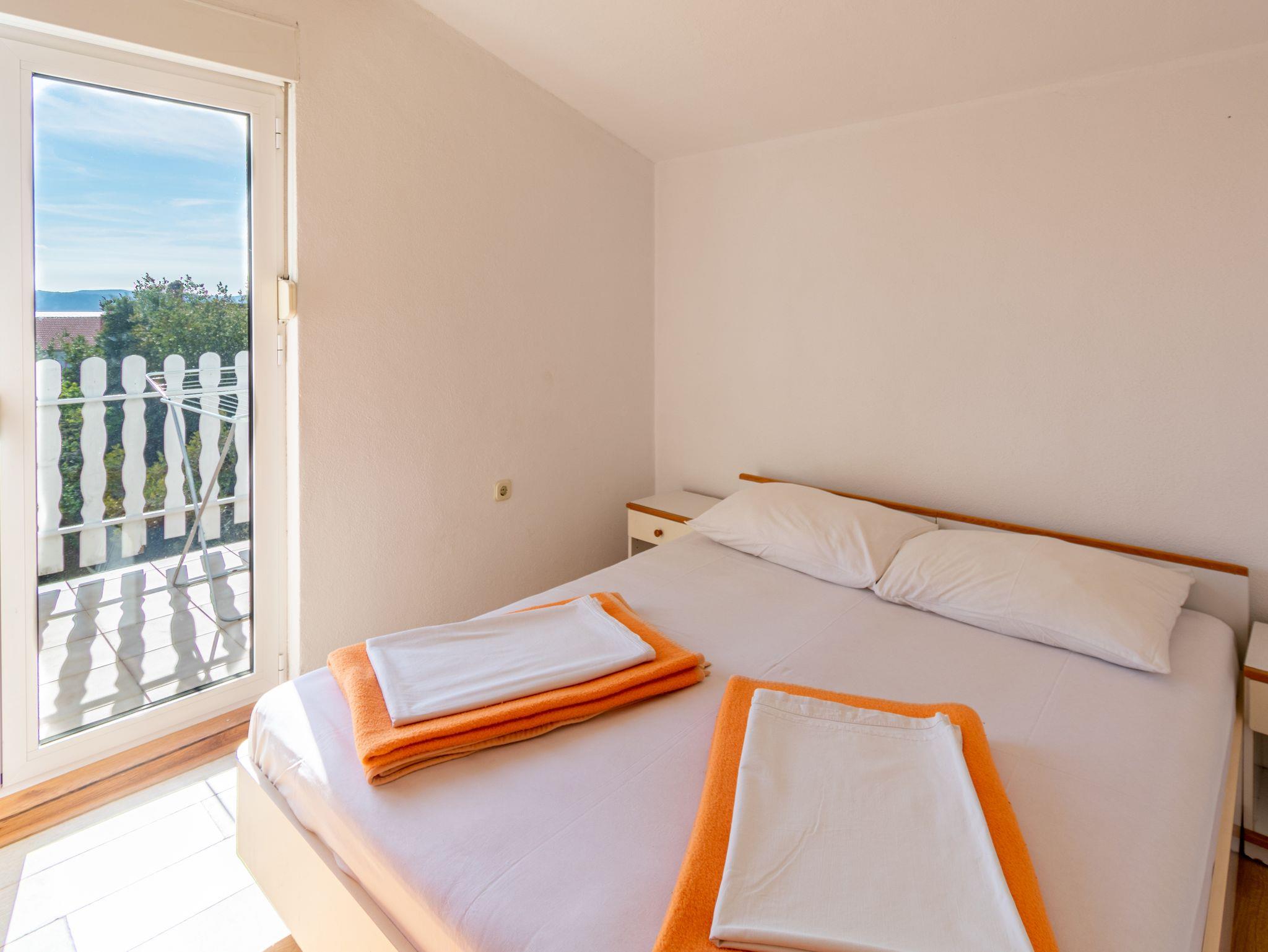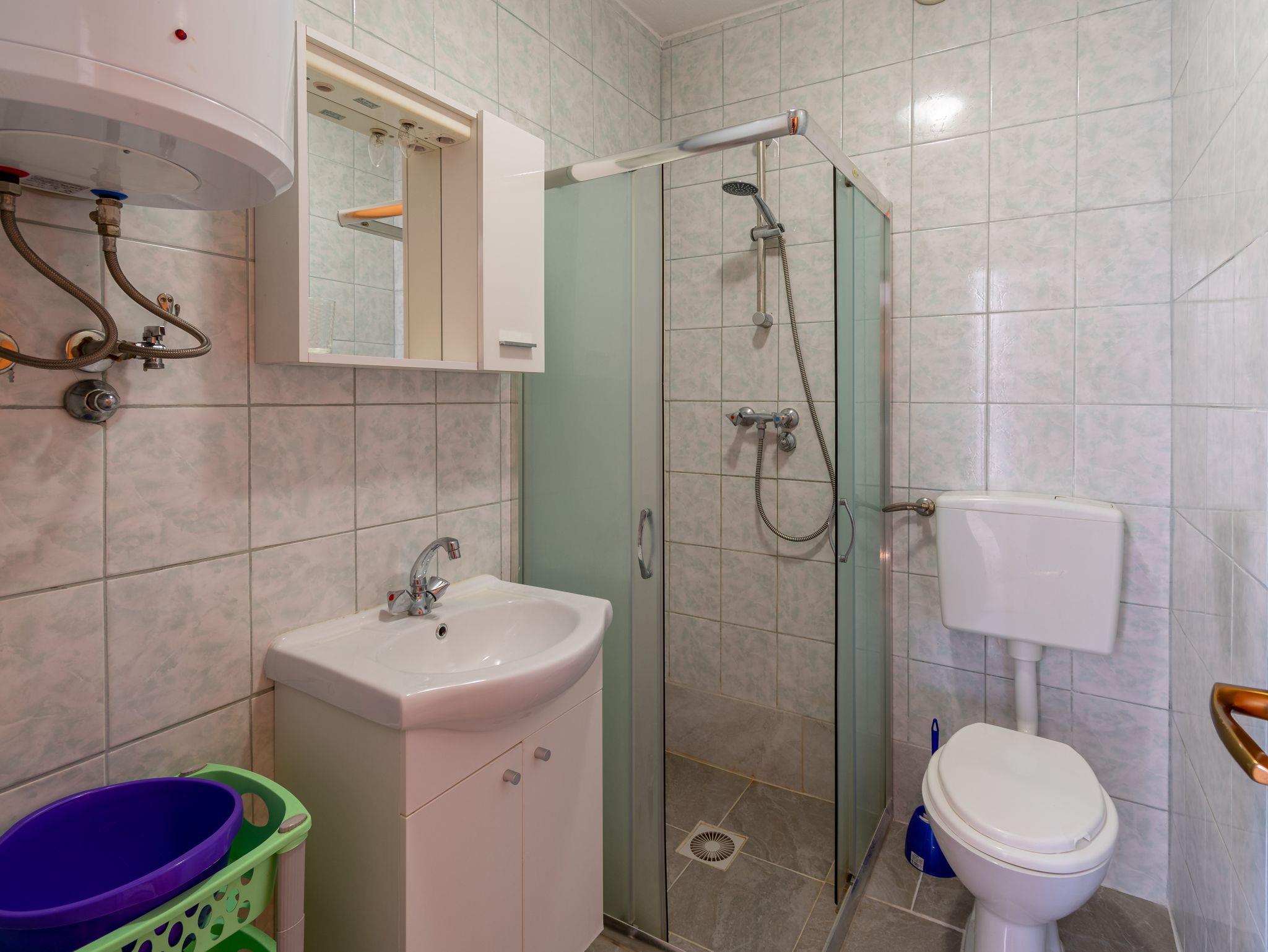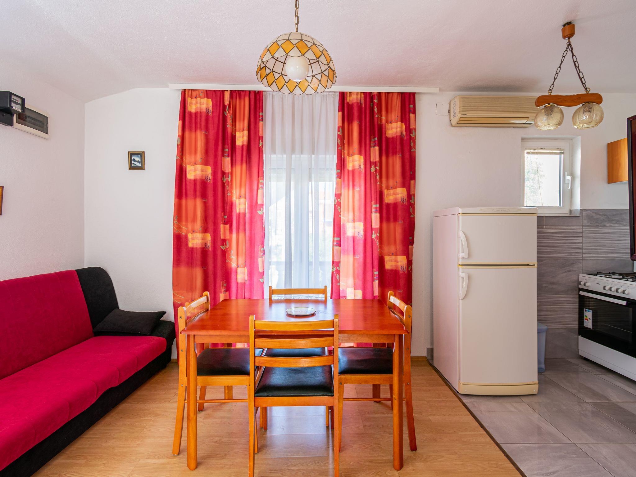 Ferienwohnung bietet Platz für 5 Gäste. Die Betten sind in Schlafzimmern, die es 2 gibt, und in Esszimmer, innerhalb einer Gesamtfläche von 38m2, angeordnet. Die Gäste haben eine eigene Terrasse zur Verfügung, auf der sie in warmen Sommernächten genießen können. Das Apartment bietet Meerblick. Es ist erlaubt, Speisen auf dem Gemeinschafts-Grill vorzubereiten. IM PREIS INBEGRIFFEN: Kurtaxe, Endreinigung, Parkplatz, Internet, Kinderbett, Zusatzbett, Bügeleisen, Bügelbrett, Föhn, tragbarer Grill. VERBINDLICHE ZUSÄTZLICHE KOSTEN: Aufzahlung für Kurzaufenthalte (prozentualer Zuschlag pro Nächtigungsanzahl: 30% - 1, 20% - 2, 10% - 3). UNVERBINDLICHE ZUSÄTZLICHE KOSTEN: Klimatisierung (5,00 € pro Nacht). Die Verfügbarkeit zusätzlicher Dienstleistungen in Ihrem reservierten Termin und die Preise derselben (falls nicht aufgeführt) müssen im Voraus überprüft werden. Zusätzliche Dienstleistungen die in der Zahlungsaufforderung nicht aufgeführt sind werden direkt beim Vermieter bezahlt, angenommen der Gast nutzt auch diese. Ermäßigung auf den Grundpreis: Gratistag 21=19 (bei einem Aufenthalt von 21 Tagen oder mehr erhalten Sie 2 Gratistage für den Aufenthalt bis 31.12.26).