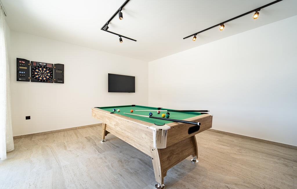 Hvis I er på udkig efter en ferie med sus, dus og masser af god komfort, er denne vidunderlige villa det helt rigtige valg for jer. Her venter jer, udover de mange kvadratmeter, en flot og stilsikker indretning og mange moderne faciliteter, der gør det nemt at sænke skuldrene og glemme hverdagens bekymringer med det samme, I ankommer. Køkkenet er stort og veludstyret, så lad blot familiens kokke tage sig god tid til madlavningen, mens andre duellerer i pool eller dart eller træner igennem i fitness-lokalet. Efter en aktiv feriedag er der få ting, der slår en ordentlig svedetur i den infrarøde sauna.