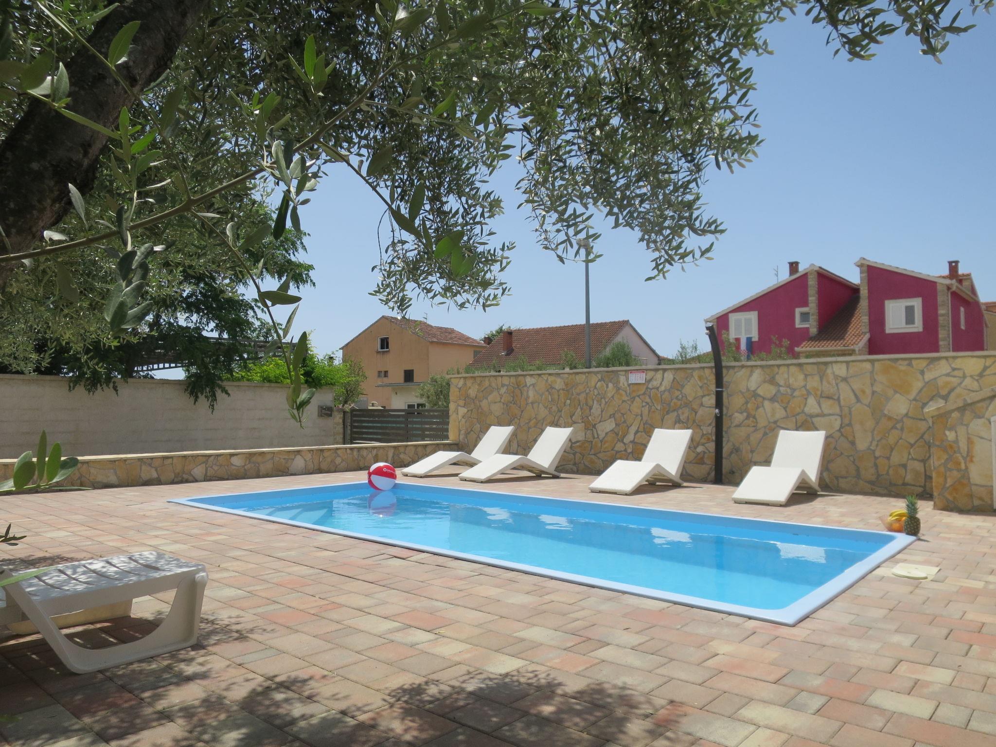 Single-family house "Tina". In the district of Meterize 1 km from the centre of Biograd na Moru, 27 km from the centre of Zadar, 1.6 km from the sea, 1.6 km from the beach. Private: property 410 m2 (fenced), garden, swimming pool angular (6 x 3 m, depth 150 cm, seasonal availability: 27.May. - 01.Oct.) with internal staircase. Outdoor shower, arbour, terrace, barbecue. In the house: internet access, washing machine. Parking (for 2 cars) at the house on the premises. Supermarket 450 m, restaurant 2 km, bus stop 1.4 km, pebble beach 1.6 km. Nearby attractions: adventure park 850 m.