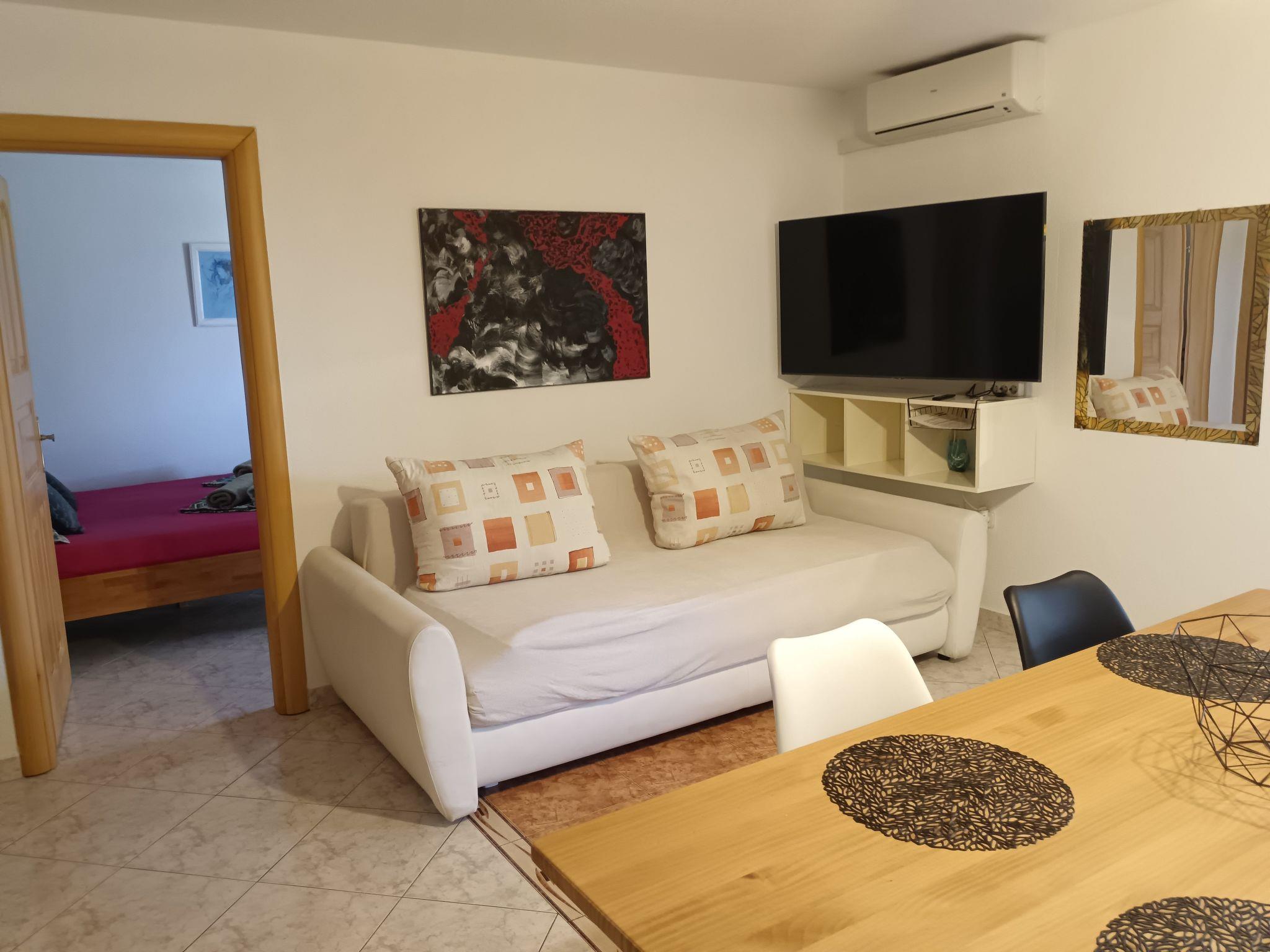 Inside, the apartment spans over a generous 50m2, providing ample space for relaxation and leisure. Designed to cater to your every need, the interior boasts a well-equipped kitchen, ensuring meal preparation is both effortless and enjoyable. The dining area, complete with a cozy sofa bed, invites guests to unwind in a comfortable setting. Additionally, the apartment is fitted with essential amenities including Sat-TV, WIFI, and air conditioning in part of the space, all designed to enhance your stay. A fan is also provided to ensure your comfort during warmer days.