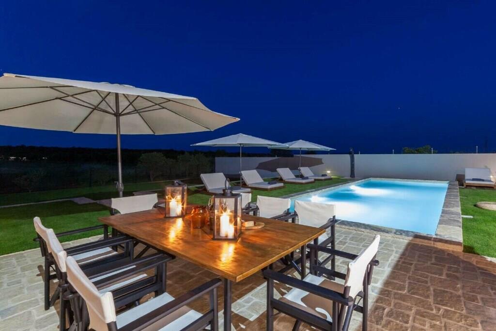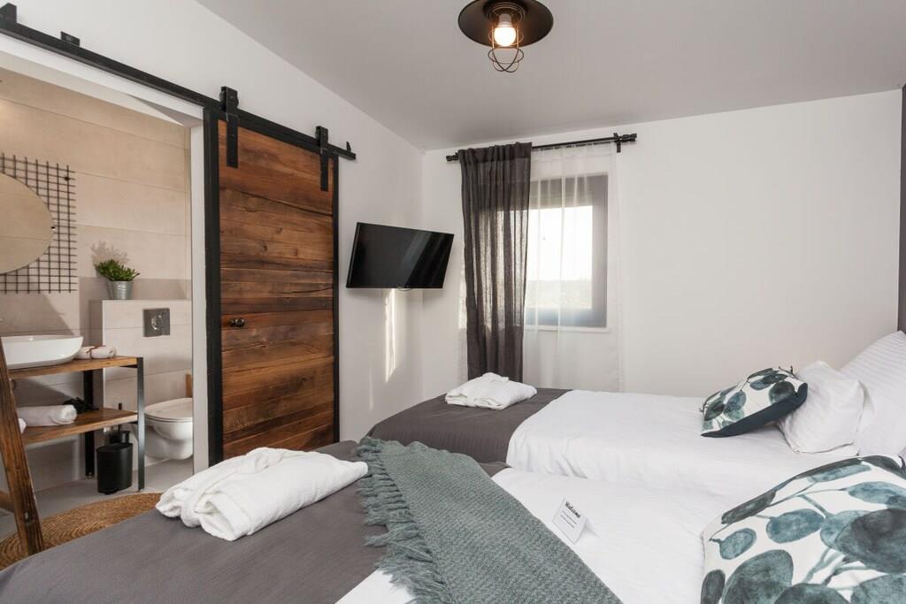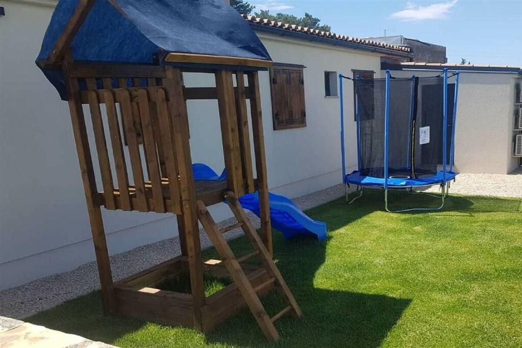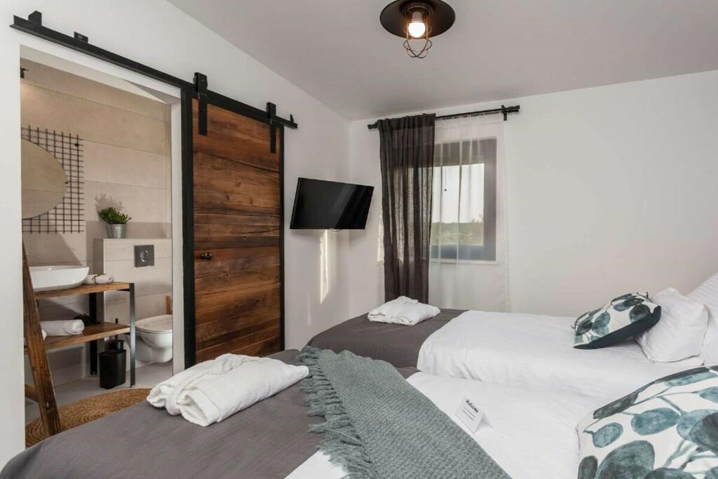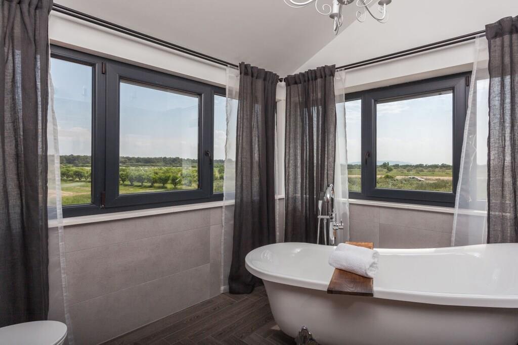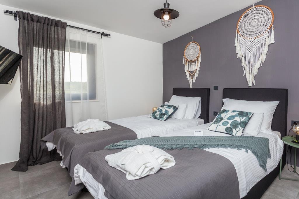 Jedes der vier Schlafzimmer, wobei drei Schlafzimmer mit einem Doppelbett und eines mit zwei organisierbaren Einzelbetten ausgestattet sind, verfügt über ein eigenes Badezimmer, Klimaanlage und Fernseher. Außerdem steht noch eine Gästetoilette zur Verfügung, besonders praktisch während des Sonnenbads. Die Küche ist modern und komplett ausgestattet, ein Innenkamin steht ebenfalls zur Verfügung.
