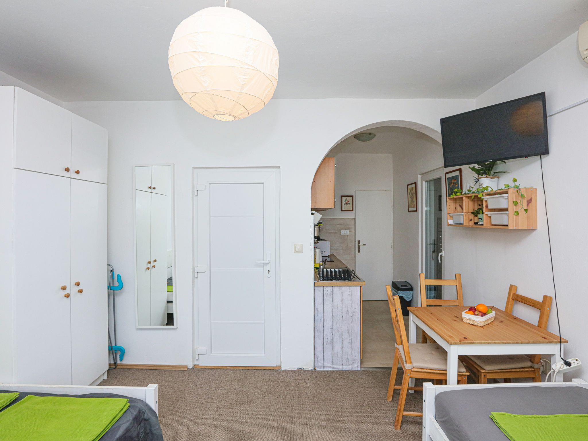 Studio bietet Platz für 3 Gäste. Die Betten sind in Schlafzimmern, die es 1 gibt, innerhalb einer Gesamtfläche von 22m2, angeordnet. Die Gäste haben einen eigenen Balkon zur Verfügung, auf der sie in warmen Sommernächten genießen können. Es ist erlaubt, Speisen auf dem Gemeinschafts-Grill vorzubereiten. IM PREIS INBEGRIFFEN: Kurtaxe, Endreinigung, Klimatisierung, Parkplatz, Internet, Bügeleisen, Bügelbrett, Föhn. VERBINDLICHE ZUSÄTZLICHE KOSTEN: Aufzahlung für Kurzaufenthalte (prozentualer Zuschlag pro Nächtigungsanzahl: 30% - 1, 20% - 2, 10% - 3). Die Verfügbarkeit zusätzlicher Dienstleistungen in Ihrem reservierten Termin und die Preise derselben (falls nicht aufgeführt) müssen im Voraus überprüft werden. Zusätzliche Dienstleistungen die in der Zahlungsaufforderung nicht aufgeführt sind werden direkt beim Vermieter bezahlt, angenommen der Gast nutzt auch diese. Ermäßigung auf den Grundpreis: Gratistag 14=13 (bei einem Aufenthalt von 14 Tagen oder mehr erhalten Sie einen Gratistag für den Aufenthalt bis 31.12.26).