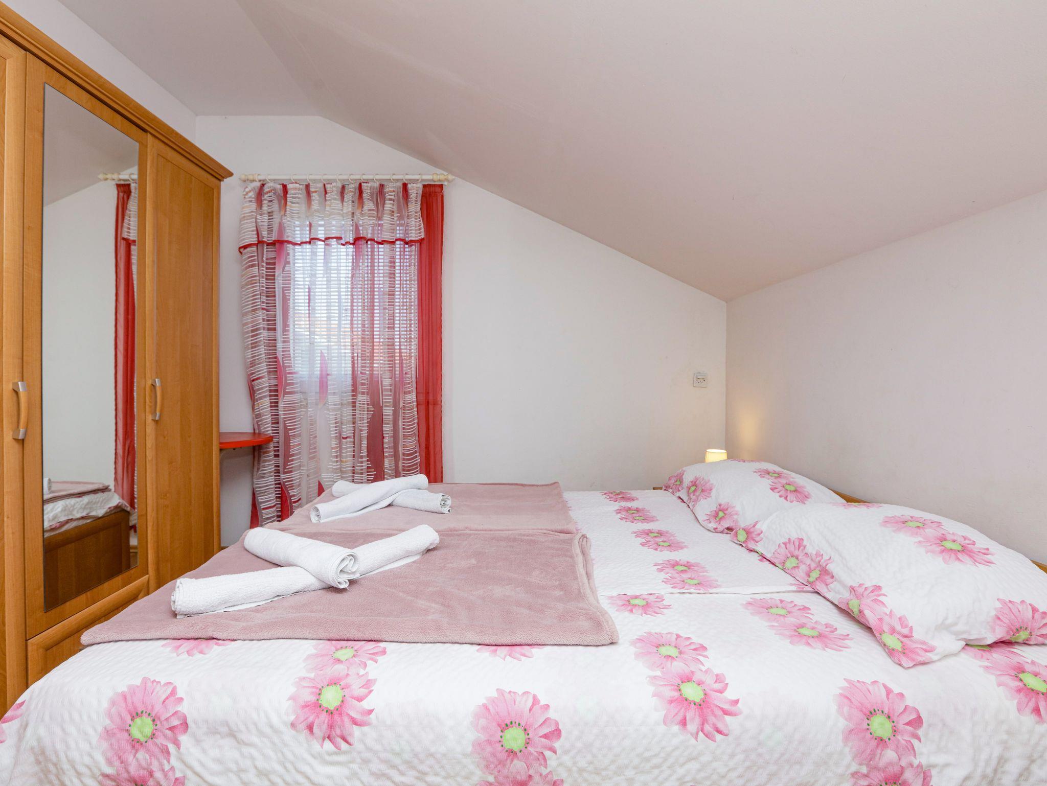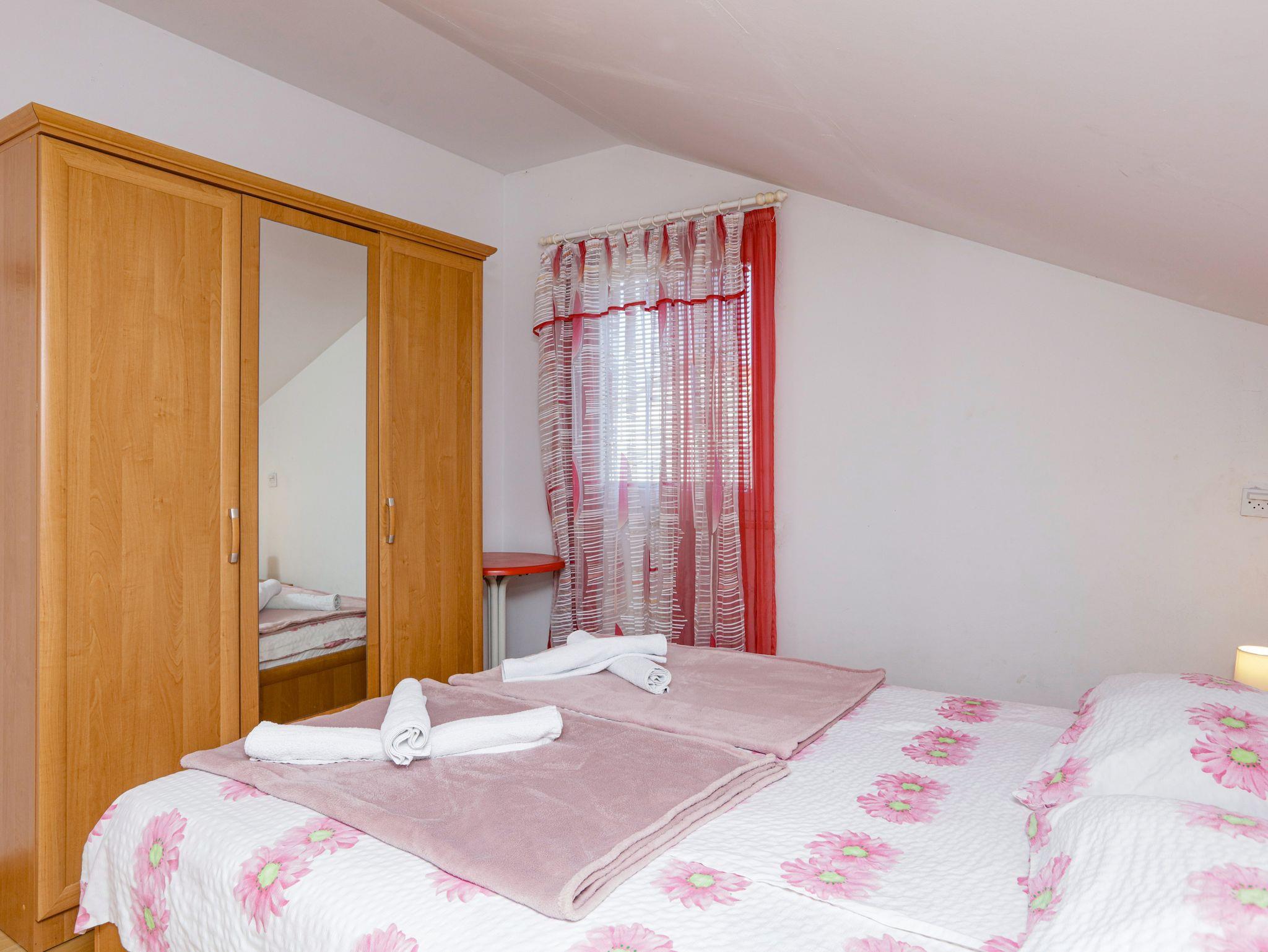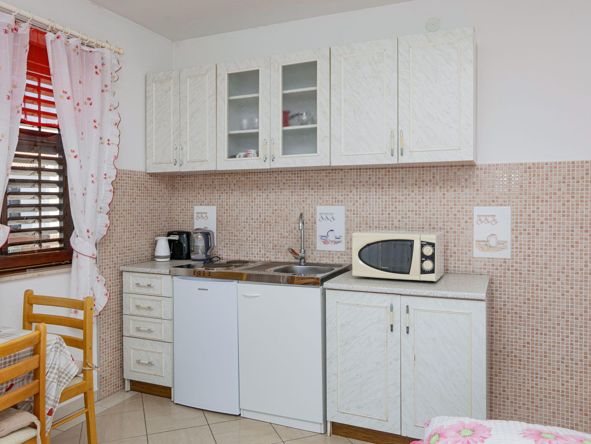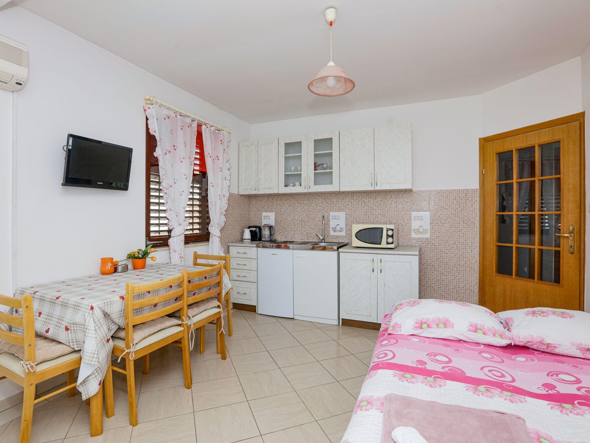Ferienwohnung bietet Platz für 4 Gäste. Die Betten sind in Schlafzimmern, die es 1 gibt, und in Wohnzimmer, innerhalb einer Gesamtfläche von 35m2, angeordnet. Die Gäste haben eine eigene Terrasse zur Verfügung, auf der sie in warmen Sommernächten genießen können. Das Apartment bietet Meerblick. Es ist erlaubt, Speisen auf dem Gemeinschafts-Grill vorzubereiten. IM PREIS INBEGRIFFEN: Kurtaxe, Endreinigung, Klimatisierung, Parkplatz, Internet, Kinderbett, Bügeleisen, Bügelbrett, Föhn. VERBINDLICHE ZUSÄTZLICHE KOSTEN: Aufzahlung für Kurzaufenthalte (prozentualer Zuschlag pro Nächtigungsanzahl: 30% - 1, 20% - 2, 10% - 3). UNVERBINDLICHE ZUSÄTZLICHE KOSTEN: Zusatzbett (5,00 € pro Nacht). Die Verfügbarkeit zusätzlicher Dienstleistungen in Ihrem reservierten Termin und die Preise derselben (falls nicht aufgeführt) müssen im Voraus überprüft werden. Zusätzliche Dienstleistungen die in der Zahlungsaufforderung nicht aufgeführt sind werden direkt beim Vermieter bezahlt, angenommen der Gast nutzt auch diese.