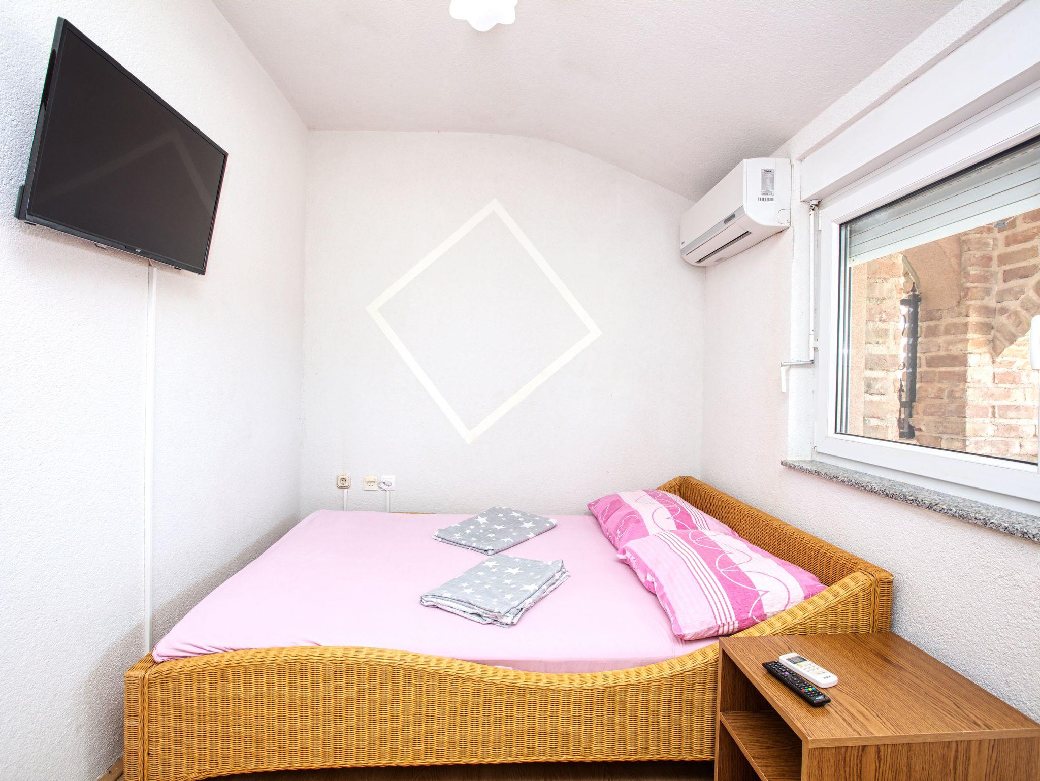 Zimmer bietet Platz für 3 Gäste. Die Betten sind in Schlafzimmern, die es 1 gibt, innerhalb einer Gesamtfläche von 18m2, angeordnet. Es ist erlaubt, Speisen auf dem Gemeinschafts-Grill vorzubereiten. In der Unterkunftseinheit besteht die Möglichkeit des Mitbringens von Haustieren gegen Aufpreis. Die reservierte Unterkunftseinheit ist ein Zimmer mit eigenem Badezimmer ohne die Möglichkeit der Nutzung einer Küche. Die reservierte Unterkunftseinheit verfügt über einen gemeinsamen Balkon. Unterkunftseinheit hat Räume, die von dem Rest der Einheit abgetrennt werden. IM PREIS INBEGRIFFEN: Kurtaxe, Endreinigung, Klimatisierung, Parkplatz, Internet. VERBINDLICHE ZUSÄTZLICHE KOSTEN: Aufzahlung für Kurzaufenthalte (prozentualer Zuschlag pro Nächtigungsanzahl: 30% - 1, 20% - 2, 10% - 3). UNVERBINDLICHE ZUSÄTZLICHE KOSTEN: Halbpension (15,00 €, 50% Nachlass für Kinder zwischen 4 und 12 Jahren, Kinder bis 4 Jahre sind frei.), Wäschewaschen (5,00 € Waschen), Haustiere (10,00 € pro Nacht), Fahrrad (10,00 € täglich (pro Stück)). Die Verfügbarkeit zusätzlicher Dienstleistungen in Ihrem reservierten Termin und die Preise derselben (falls nicht aufgeführt) müssen im Voraus überprüft werden. Zusätzliche Dienstleistungen die in der Zahlungsaufforderung nicht aufgeführt sind werden direkt beim Vermieter bezahlt, angenommen der Gast nutzt auch diese. Ermäßigung auf den Grundpreis: Gratistag 14=13 (bei einem Aufenthalt von 14 Tagen oder mehr erhalten Sie einen Gratistag für den Aufenthalt bis 31.12.26).