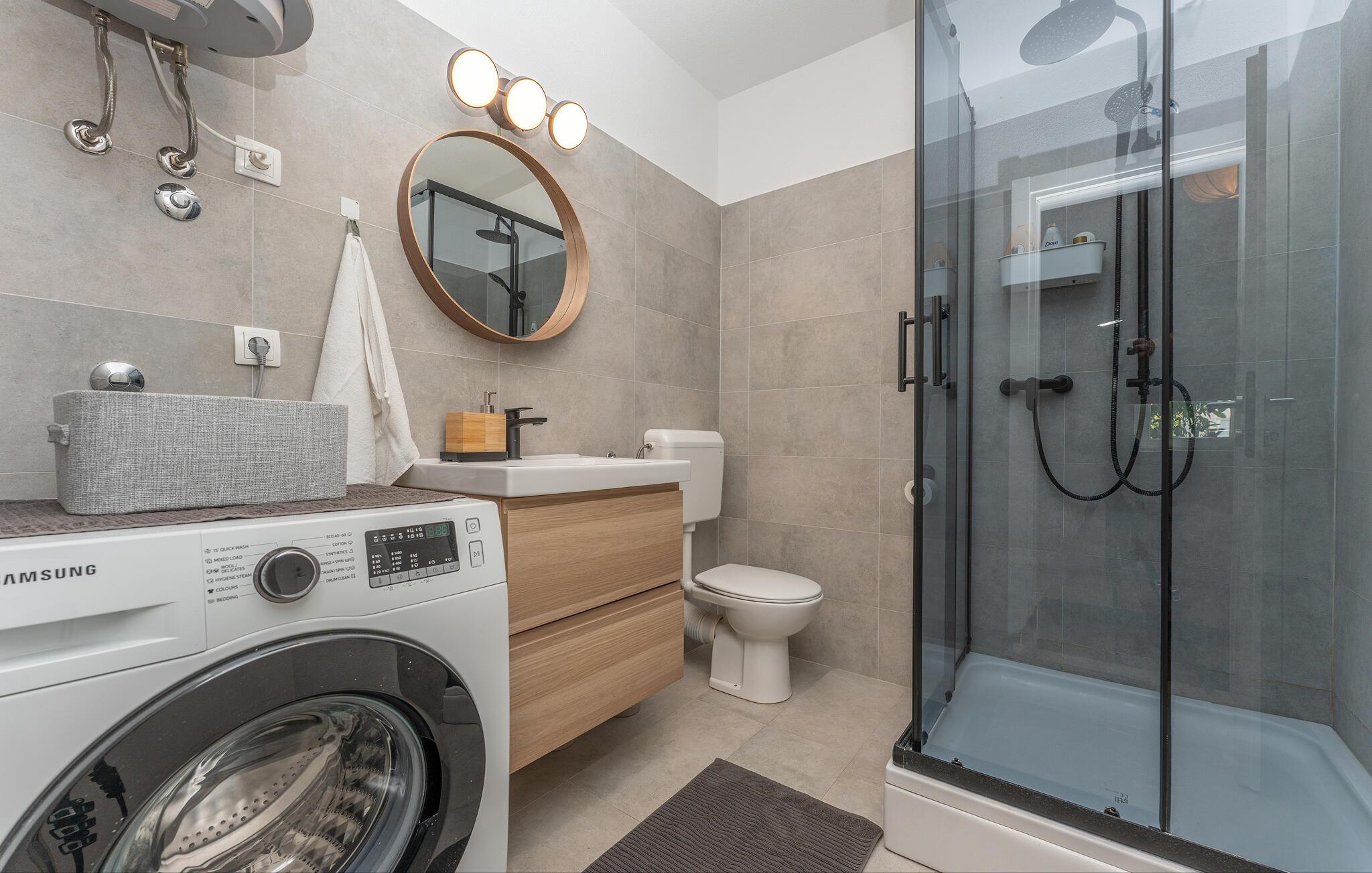 Udenfor venter der en rummelig terrasse med komfortable siddepladser, perfekt til hyggelige aftener eller stille stunder med et glas kroatisk vin. Nyd udsigten over omgivelserne og den milde havbrise. Brug fællesgrillen til at tilberede en lækker barbecue under åben himmel.