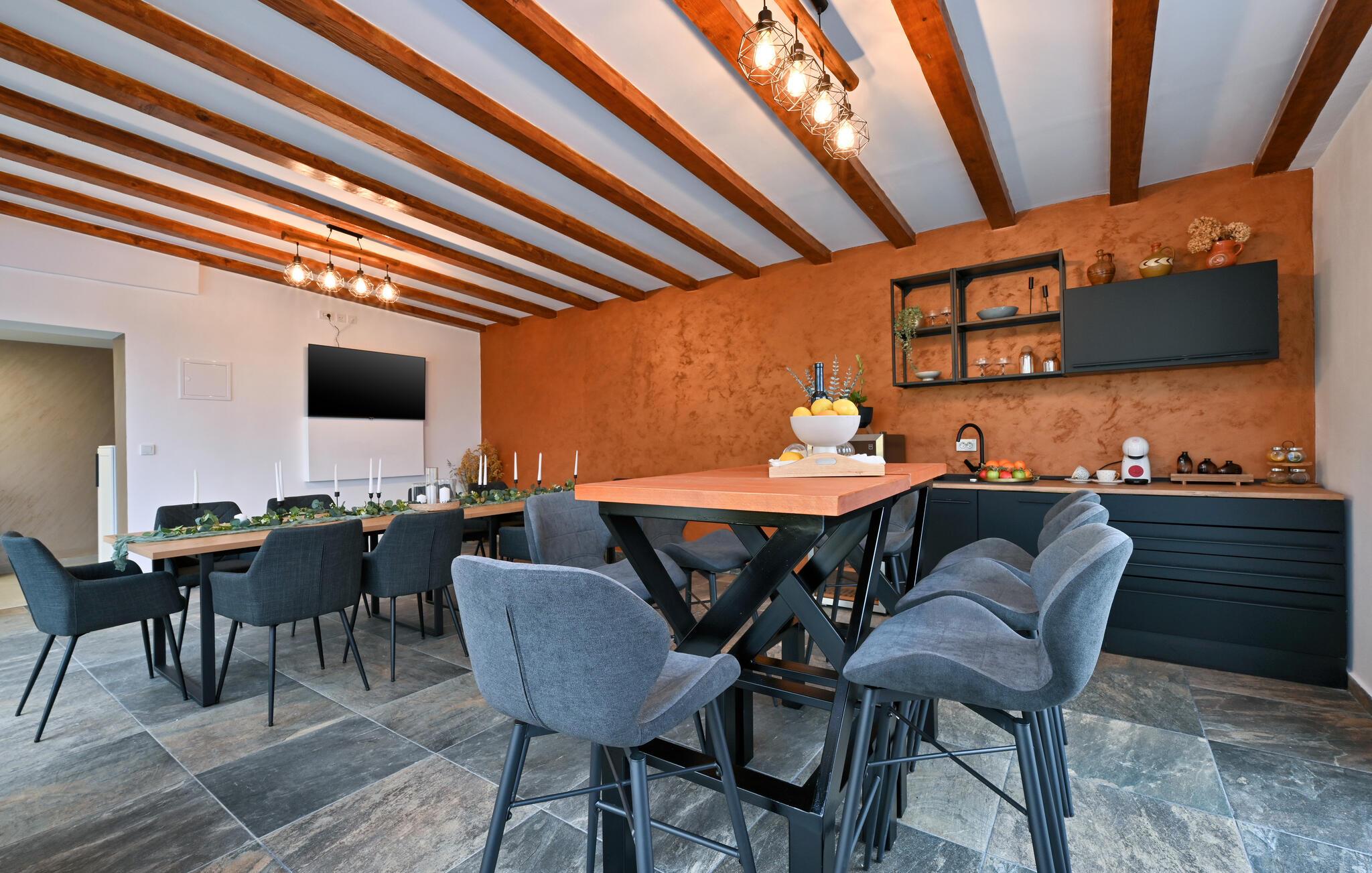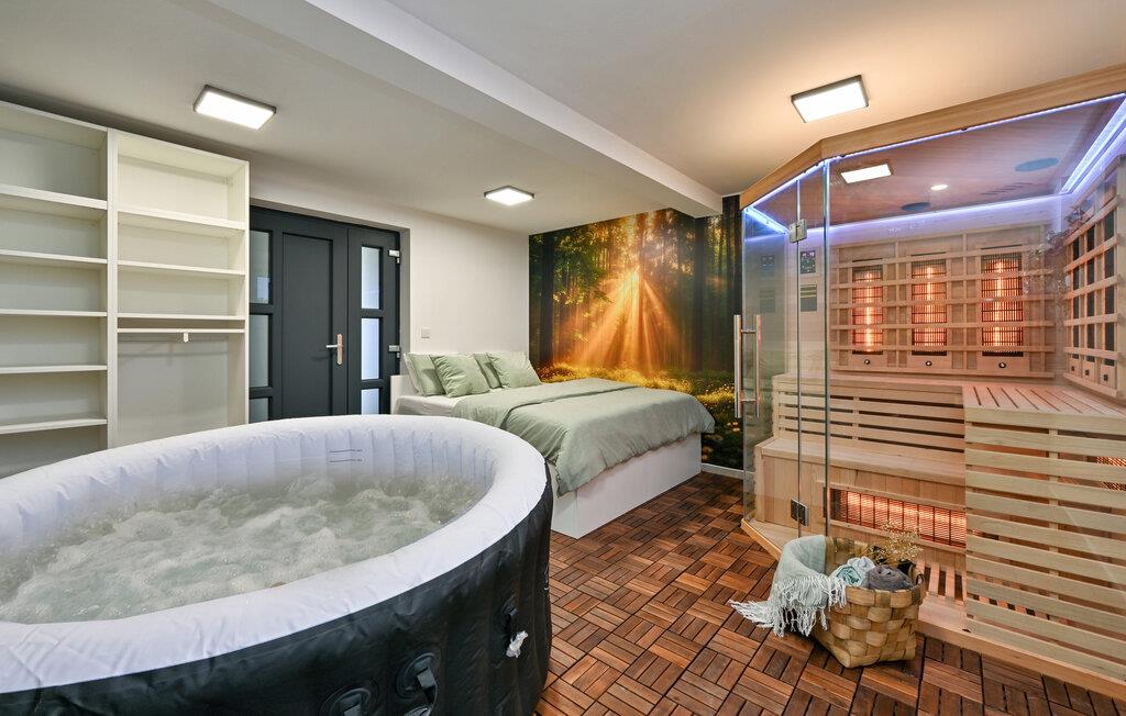 Dette moderne, komfortabelt indrettede feriehus er rettet mod en afslappende ferie. Forkæl jer selv med hyggelige stunder i saunaen eller spabadet, træne i fitnessrummet, spil bordfodbold eller Playstation 5 eller stream jeres yndlingsserie om aftenen, mens I finder jer godt tilpas i det indbydende sofaområde. Pisk lækre måltider sammen i det moderne køkken og planlæg næste dag i den stilfulde spiseplads.