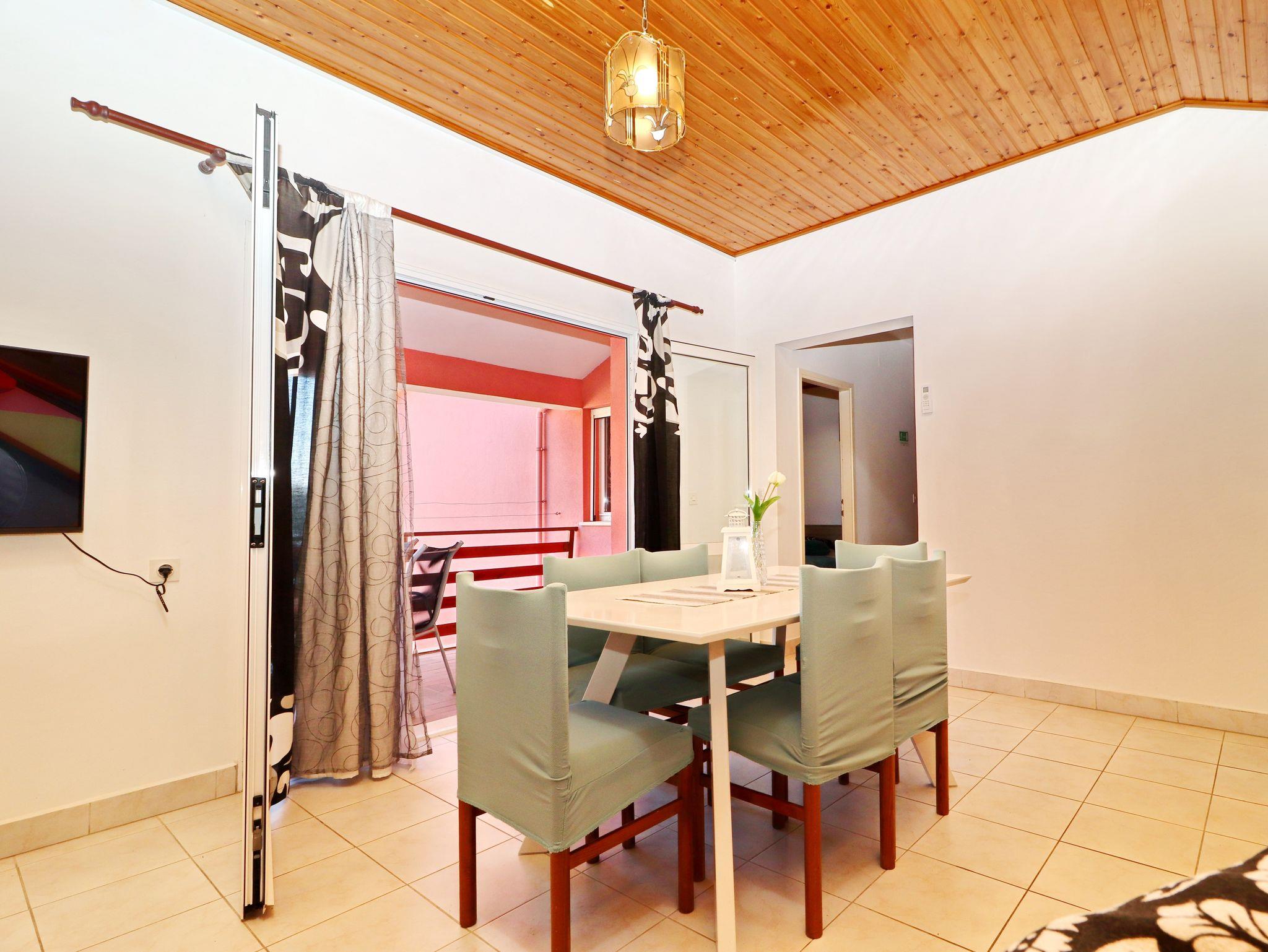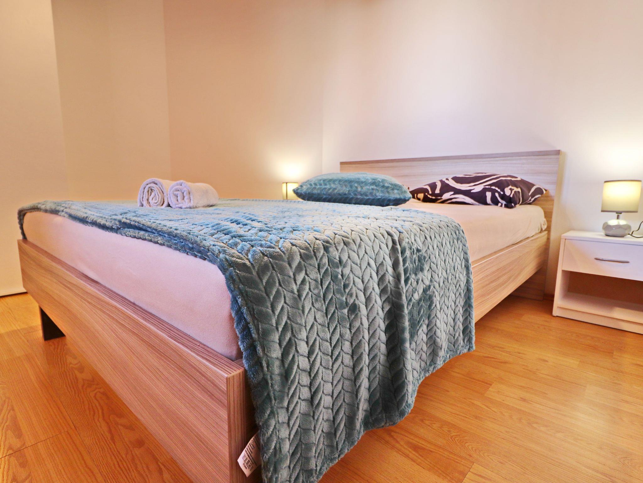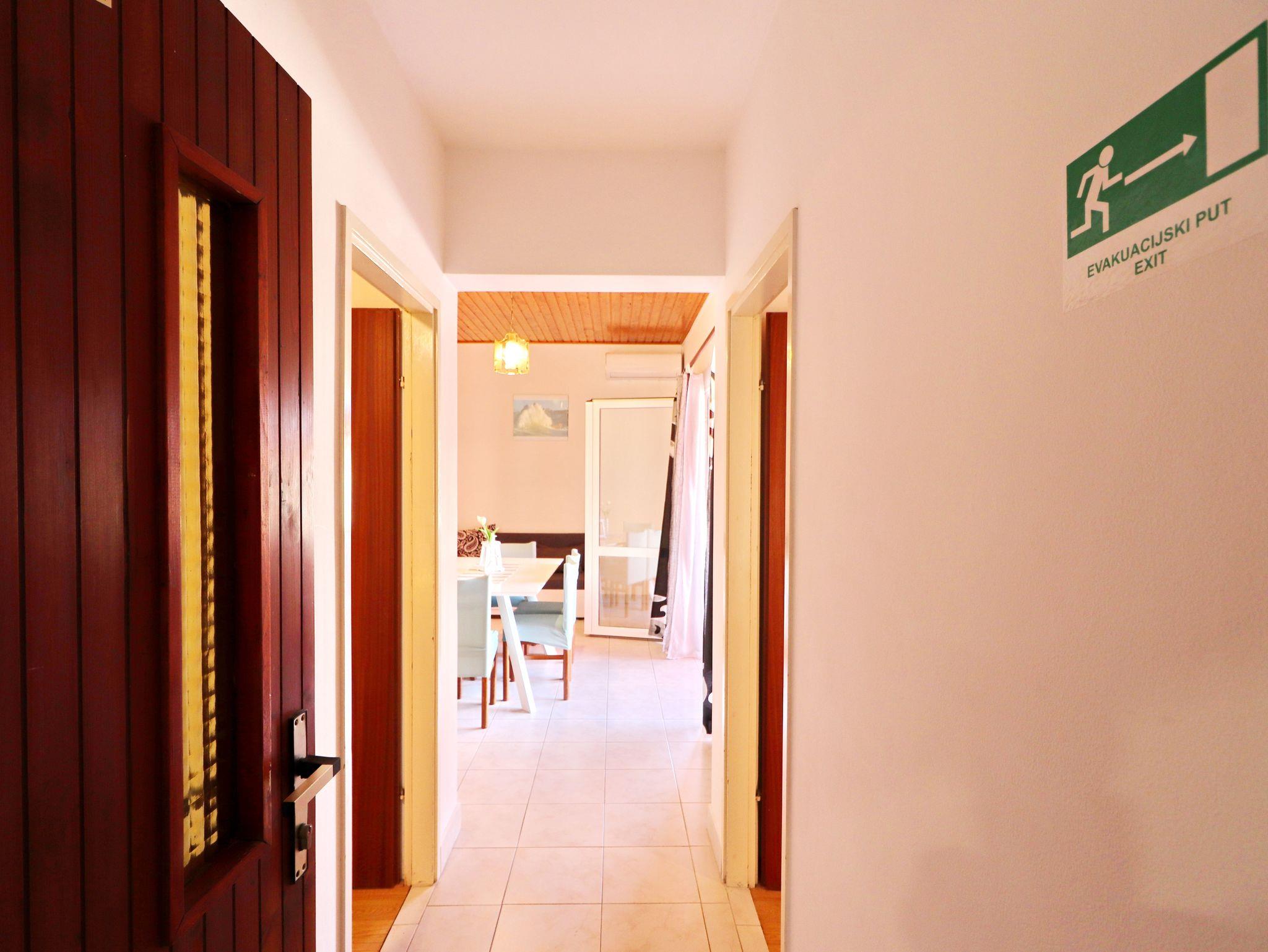 Ferienwohnung bietet Platz für 4 Gäste. Die Betten sind in Schlafzimmern, die es 2 gibt, innerhalb einer Gesamtfläche von 45m2, angeordnet. Die Gäste haben eine eigene Terrasse zur Verfügung, auf der sie in warmen Sommernächten genießen können. Das Apartment bietet Meerblick. Es ist erlaubt, Speisen auf dem Gemeinschafts-Grill vorzubereiten. IM PREIS INBEGRIFFEN: Kurtaxe, Endreinigung, Klimatisierung, Parkplatz, Internet, Kinderbett, Bügeleisen, Bügelbrett, Föhn, Sonnenschirm. VERBINDLICHE ZUSÄTZLICHE KOSTEN: Aufzahlung für Kurzaufenthalte (prozentualer Zuschlag pro Nächtigungsanzahl: 30% - 1, 20% - 2, 10% - 3). Die Verfügbarkeit zusätzlicher Dienstleistungen in Ihrem reservierten Termin und die Preise derselben (falls nicht aufgeführt) müssen im Voraus überprüft werden. Zusätzliche Dienstleistungen die in der Zahlungsaufforderung nicht aufgeführt sind werden direkt beim Vermieter bezahlt, angenommen der Gast nutzt auch diese. Ermäßigung auf den Grundpreis: Gratistag 21=19 (bei einem Aufenthalt von 21 Tagen oder mehr erhalten Sie 2 Gratistage für den Aufenthalt bis 31.12.26).