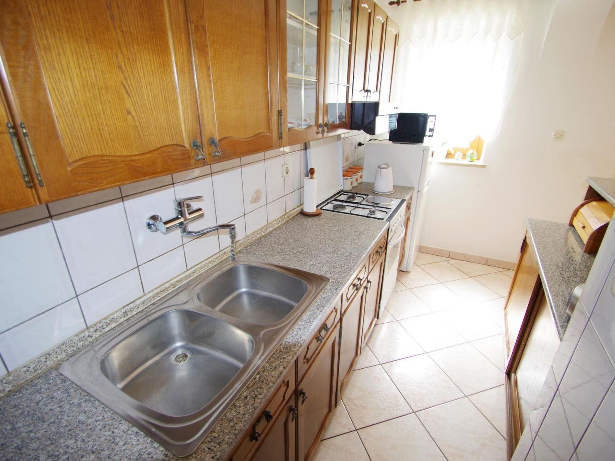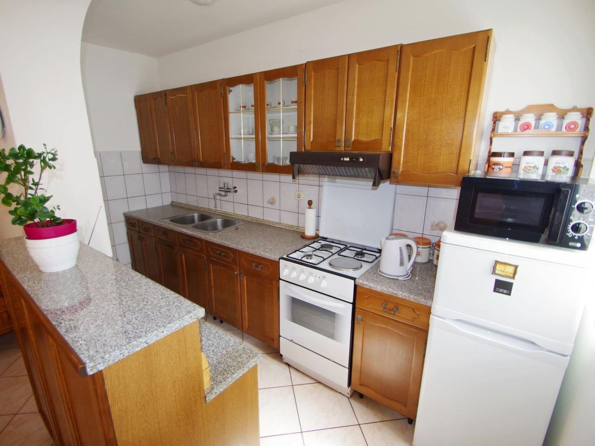 - kitchen (gas stove with 4 cooking rings, refrigerator with freezing section, kettle, dishwasher, microwave, filter coffee machine, oven, hood and utensils for cooking and eating) with dining area exit to terrace