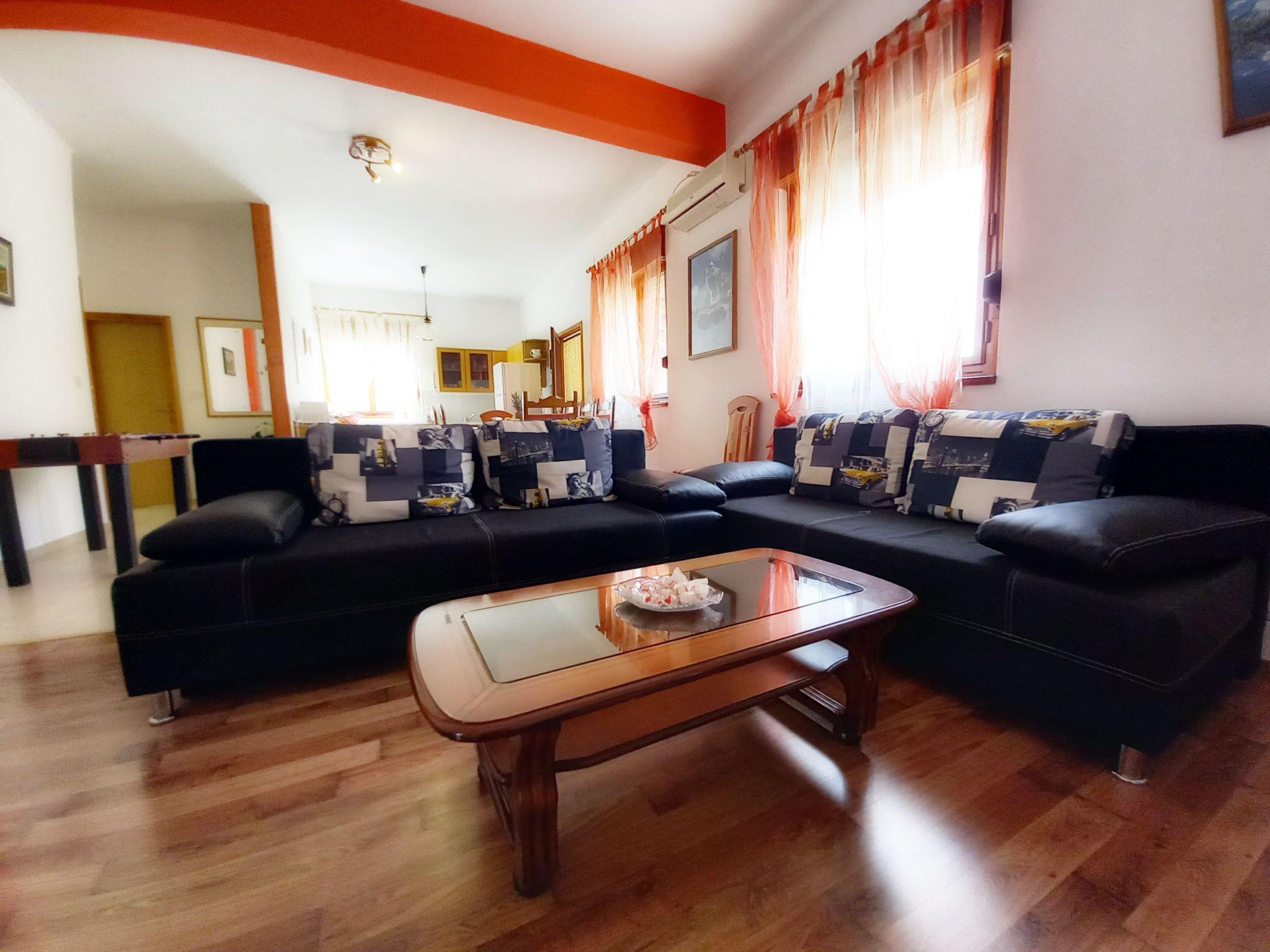 The interior of the house spans 100m2, accompanied by an ample yard of 150m2, making it spacious enough to comfortably accommodate up to 10 guests. The house is well-equipped with modern amenities including a washing machine, dishwasher, satellite TV, air conditioning, Wi-Fi, microwave oven, a four-ring oven, coffee machine, BBQ, and garden furniture. A baby cot is available for families traveling with little ones. The living area integrates a cozy open kitchen with a dining space, leading to three bedrooms featuring double beds, one bedroom with two single beds, and additional sitting/sleeping couch for two persons in the living room. There are two bathrooms, each with a toilet, washstand, and shower, plus one separate toilet equipped with a washing machine and washstand.