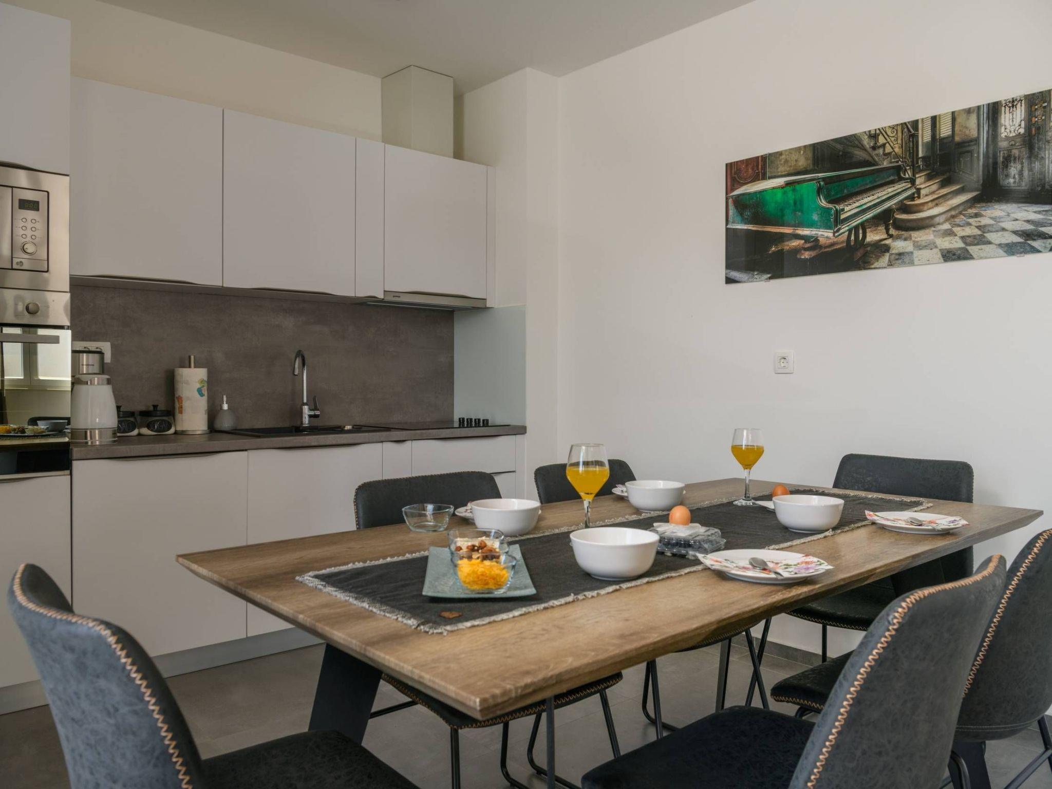 Each apartment has a fully equipped kitchen with a dishwasher, oven, and microwave.