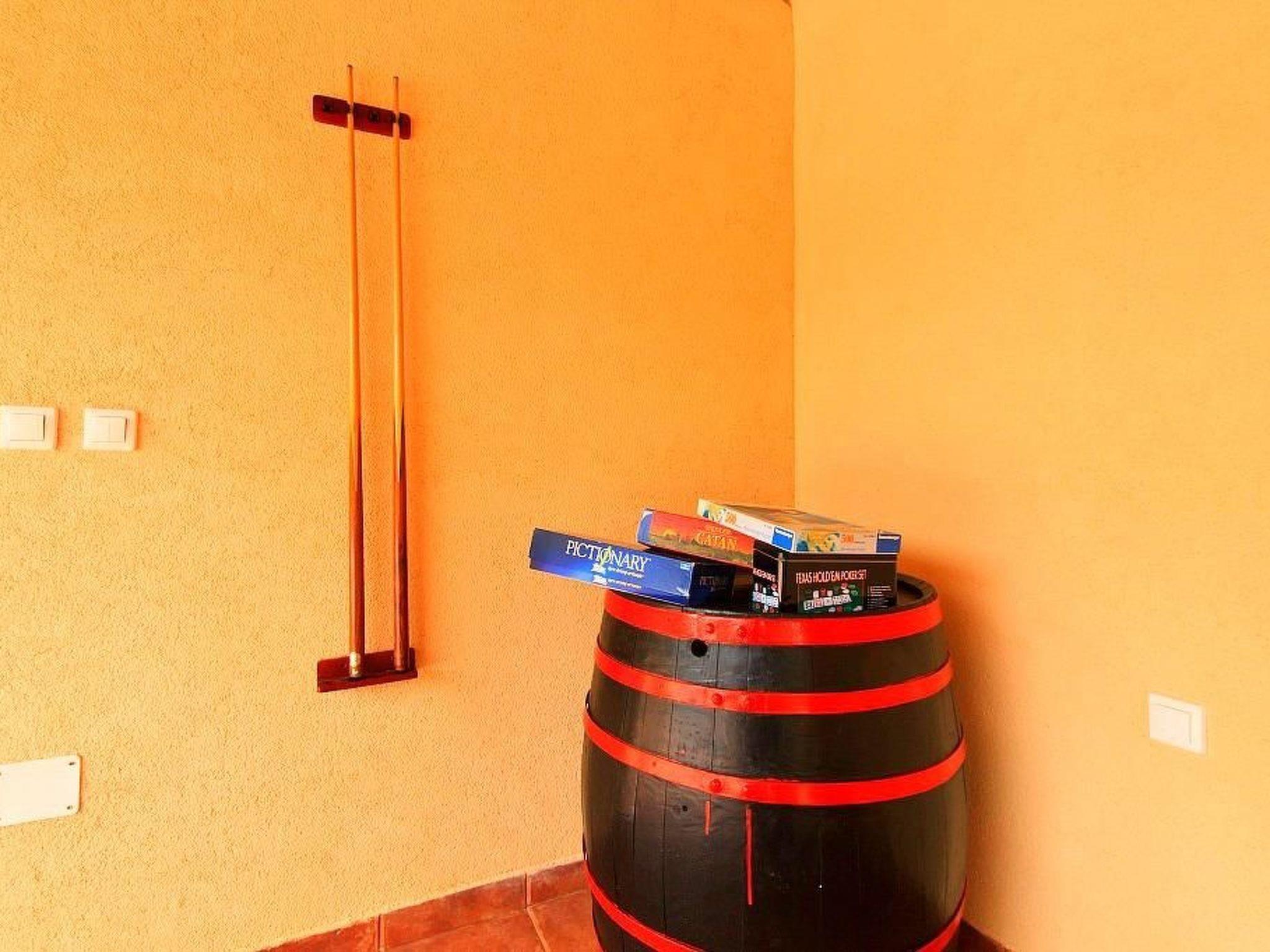 You will also be delighted with the outdoor area. The roofed terrace, to the side of the house, has an outdoor kitchen with a grill, washbasin, small electric stove and fridge, lined up next to each other. In front of it there are two tables and ten chairs. Behind the terrace there is the 28m² pool with an outdoor shower, a relaxation area with four deckchairs, a trampoline and a pool table, which is under a roof. The whole 600m² site is surrounded by a stone wall, ensuring the privacy of guests. There are three parking spaces available on site.