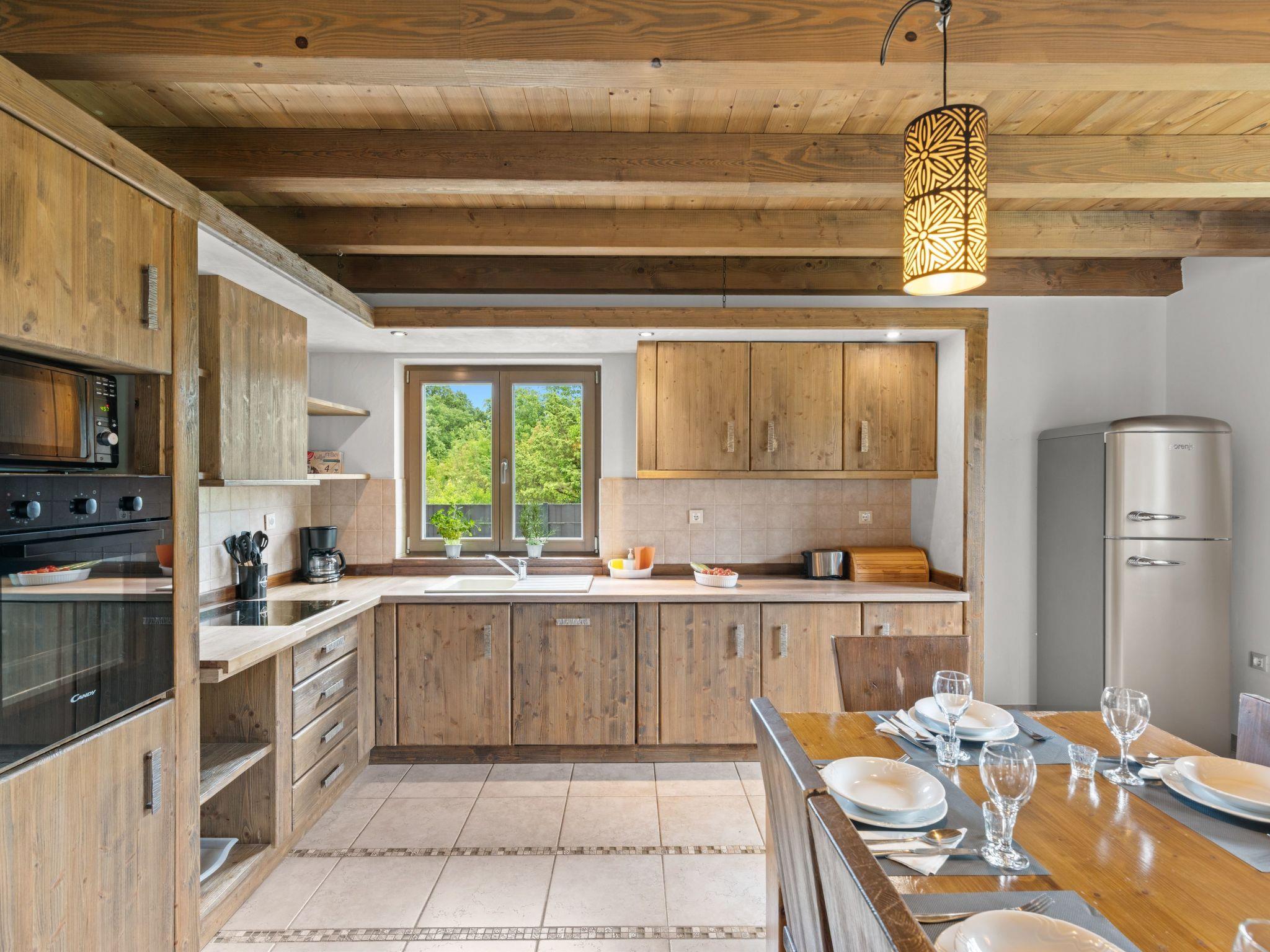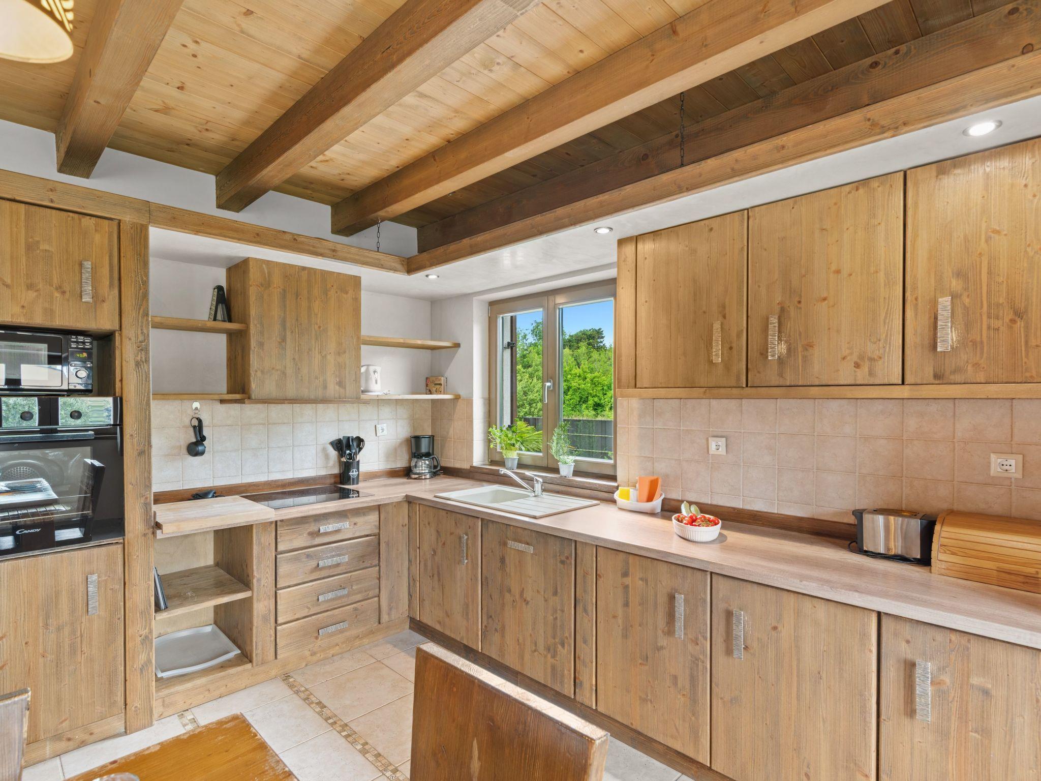 Inside, you will be greeted by a bright and friendly atmosphere characterised by the open-plan living, dining and kitchen area. A rustic wood-burning stove, beige-coloured sofa beds, a spacious dining area for 14 people and an exclusive corner kitchen with high-quality equipment, including a raised oven, microwave, dishwasher and much more, invite you to linger. The interior design, characterised by cream-coloured tiled floors with brown mosaic ornaments, brown roof beams and rustic, dark furniture, creates a warm and cosy country house atmosphere, which is rounded off by tasteful details and decorations.
