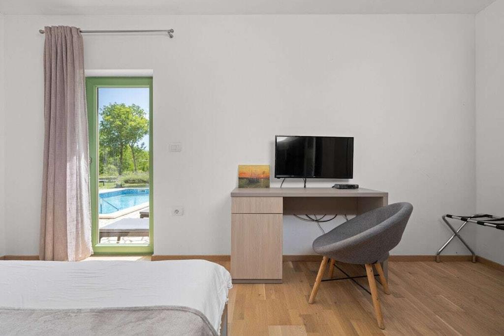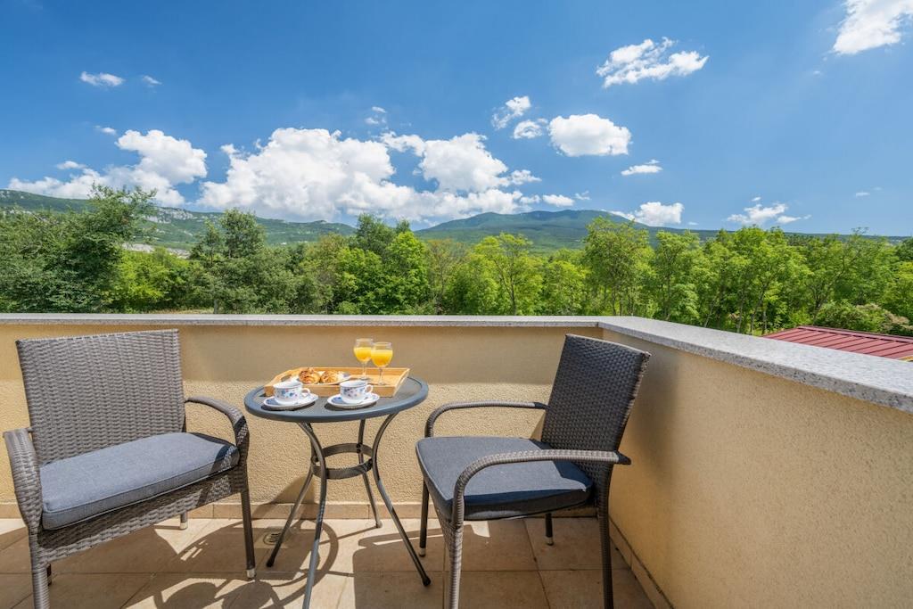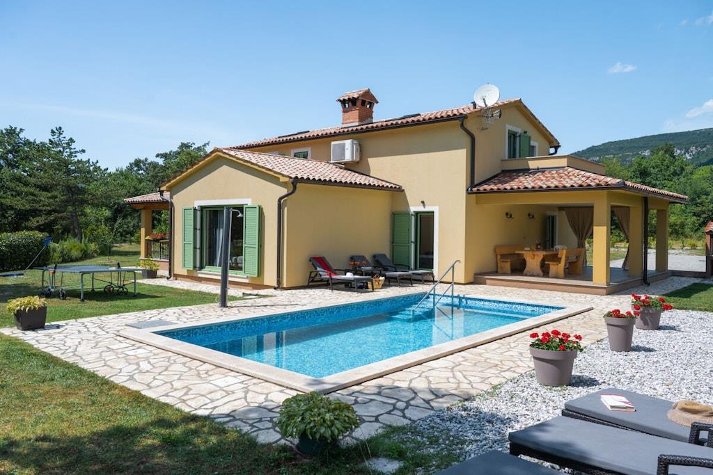 Denne nybyggede, smukke istriske villa med privat pool har plads til 6-8 personer. Den blev færdiggjort i august 2016 og er ideel til familier eller vennegrupper. Villaen ligger på en stor privat grund på 40.000 m² ved indgangen til naturparken Ucka og har aircondition. Nyd gratis Wi-Fi og privat parkering. Håndklæder og sengelinned er inkluderet i denne selvforplejningsbolig. Villaen har 3 soveværelser, 2 badeværelser, et separat toilet, et fuldt udstyret køkken og en rummelig stue og spisestue, der åbner ud til terrassen og poolområdet. En stor have med trampolin, legeplads, cykler og legetøj er også tilgængelig.