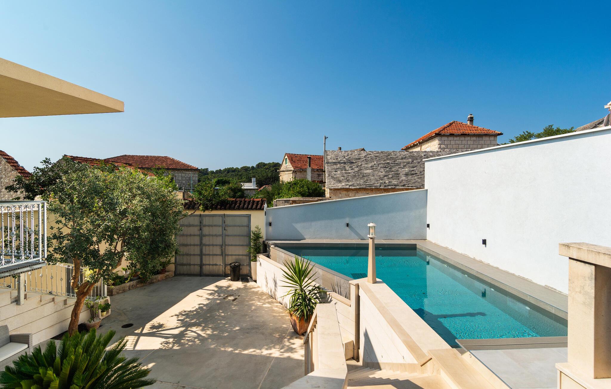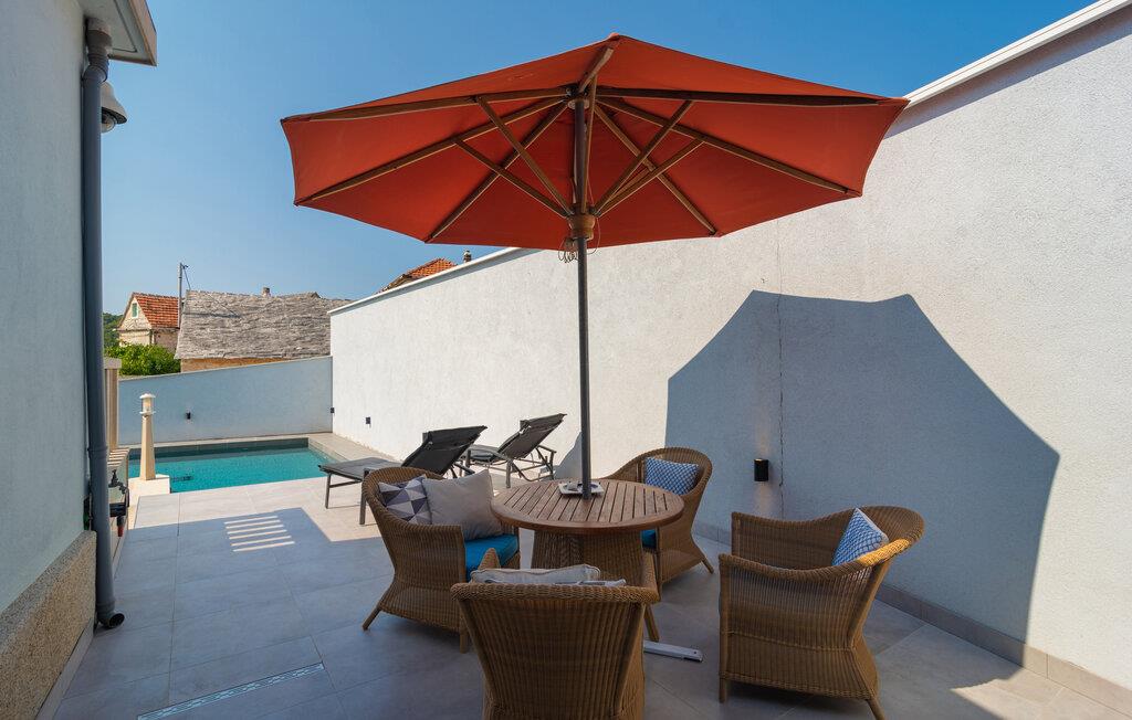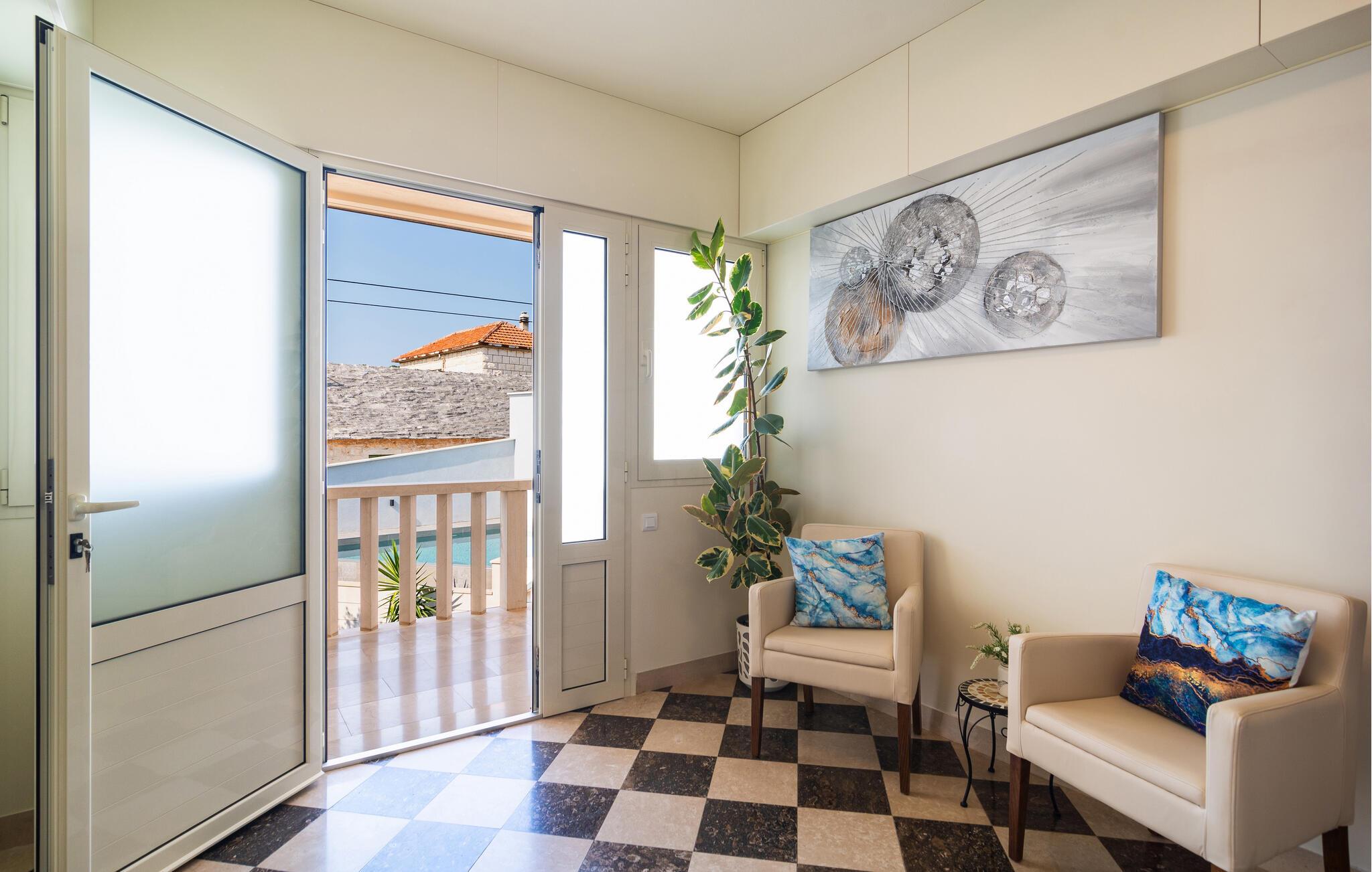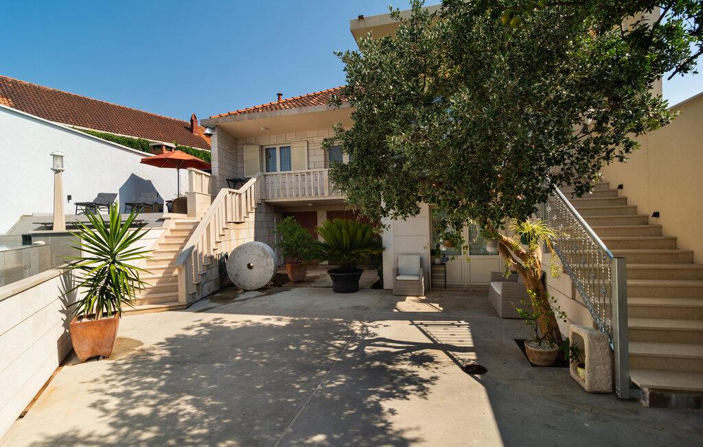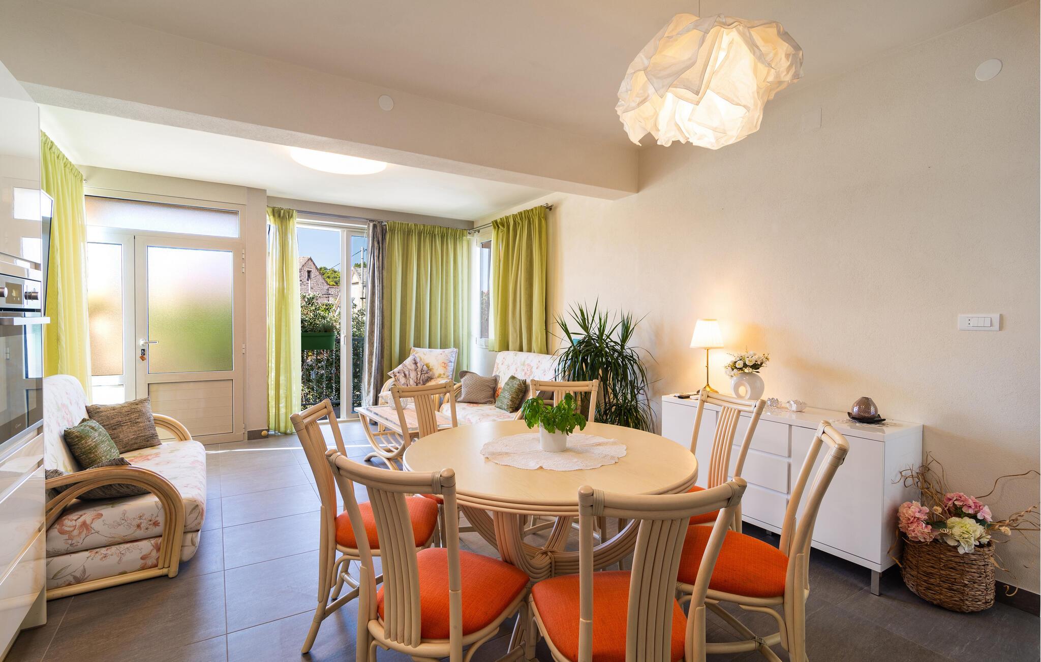 Dette dalmatiske feriehus på øen Brac, i den rolige landsby Selca, tilbyder jer en drømmende kulisse til jeres ferie. De smagfuldt indrettede indendørsrum forener traditionelle elementer med moderne komfort. Den åbne stue skaber en behagelig, afslappet atmosfære, ideel til afslappende dage.