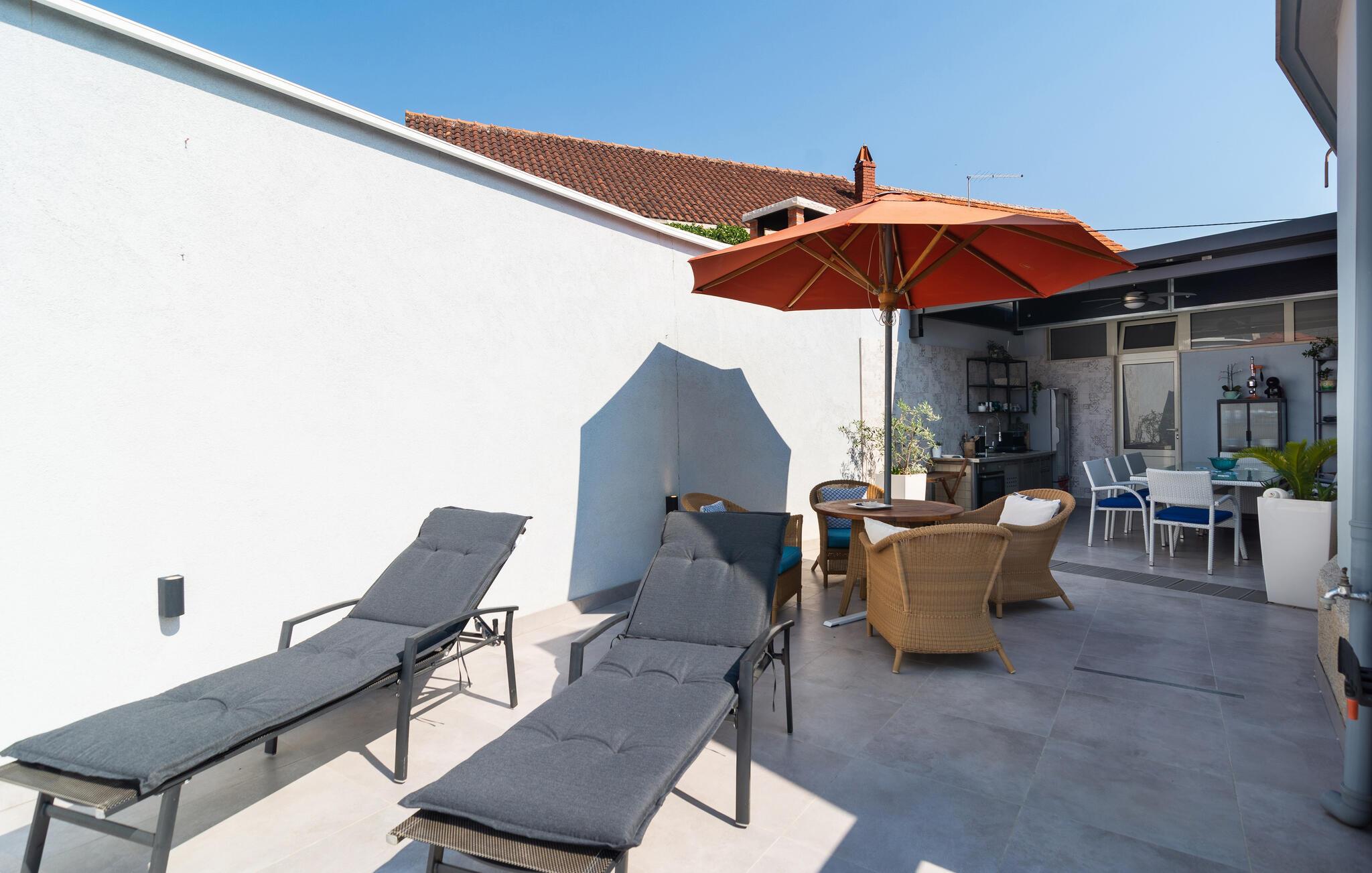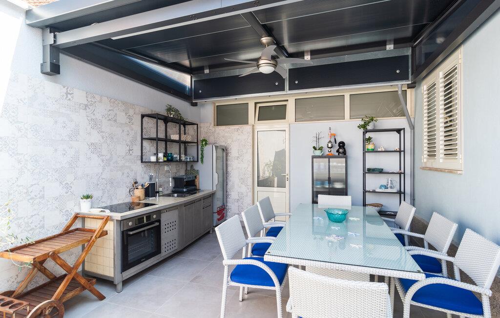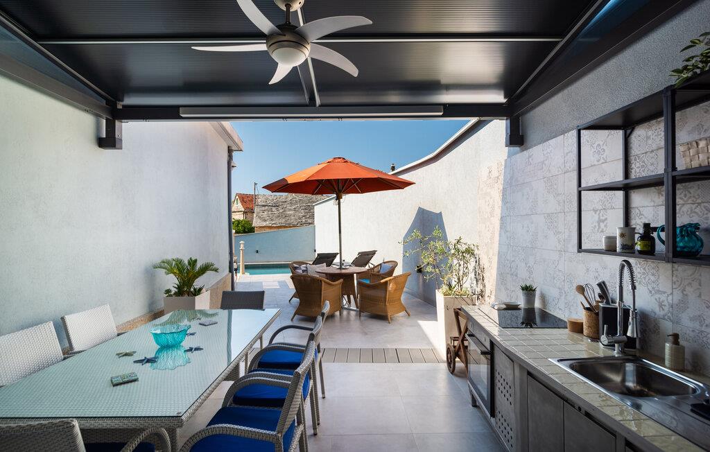 Den rummelige terrasse med udsigt over swimmingpoolen indbyder til solbadning og ophold. Her kan I nyde roen i omgivelserne og mærke den friske havbrise. Glæd jer over det udendørs køkken, hvor I kan lave lækre måltider, som I også kan nyde derude.
