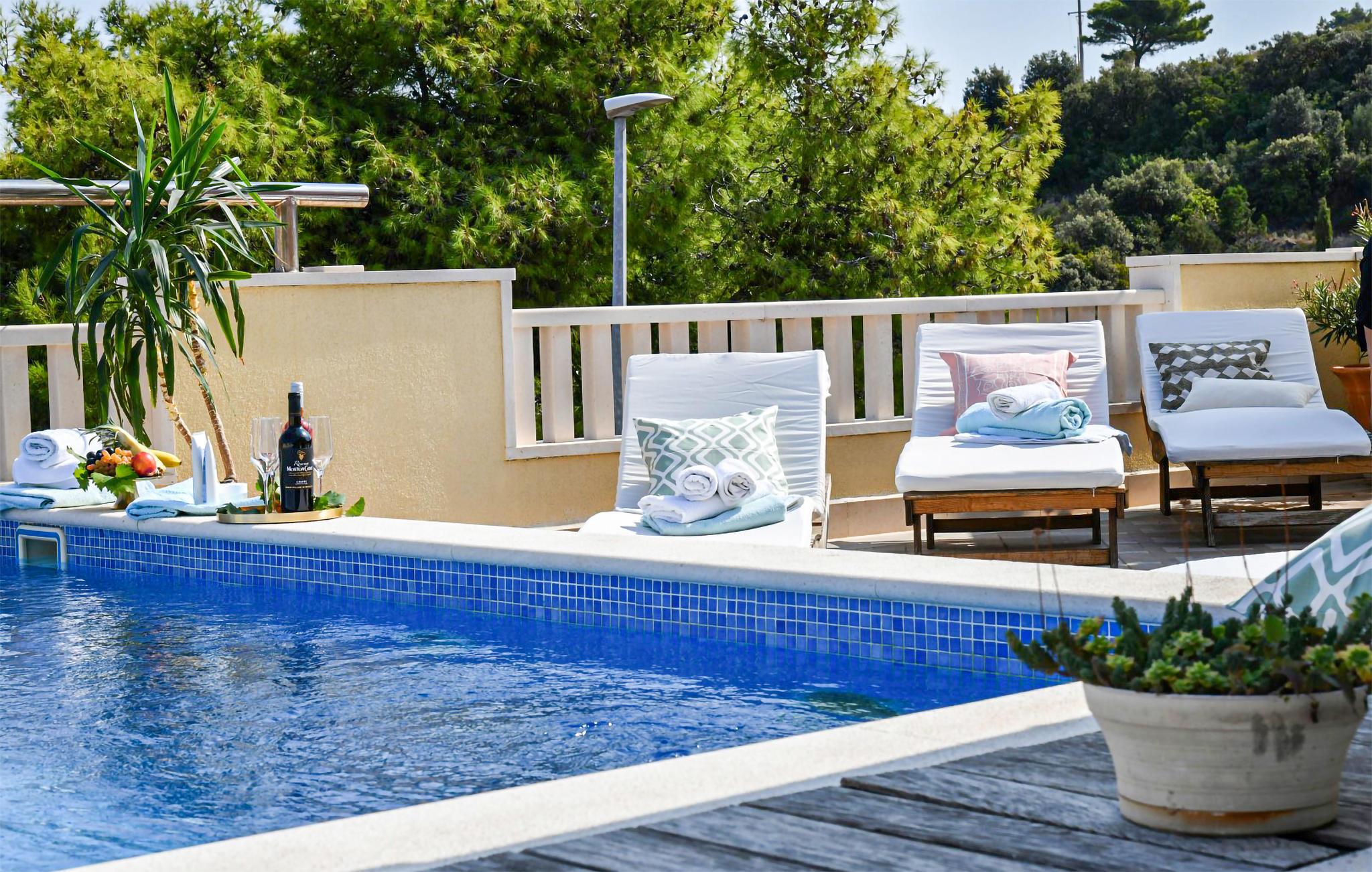 Også udendørs viser huset sin kvalitet. I har adgang til flere terrasser, åbne og overdækkede terrasser, hvor I kommer til at tilbringe mange timer med synet af udsigten over det blå vand og ind over det kroatiske festland. Spis morgenmaden på den fine, hvide veranda eller nyd et glas vin om aftenen. Hop i poolen, når I trænger til en dukkert, og nyd solen på liggestolene.