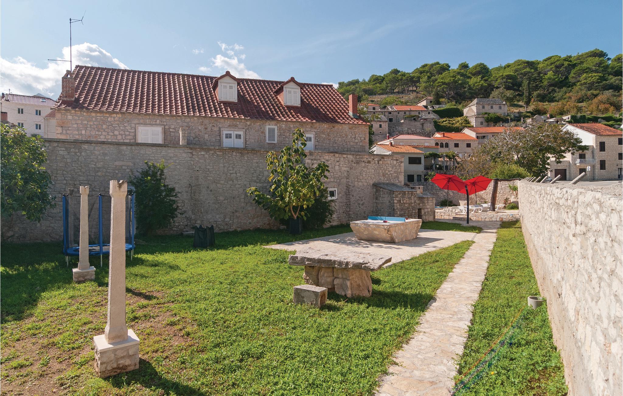 Dette typisk dalmatiske dobbeltferiehus med swimmingpool ligger i centrum af det rolige fiskerleje Pucišca på øen Brac. Huset er rustikt og enkelt indrettet. I stueetagen findes en stor opholdsstue, hvorfra der er adgang til terrassen og videre ud til swimmingpoolen. Den udendørs trappe fører op til overetagen, hvor køkkenet med spiseplads ligger sammen med et soveværelse. I nærheden af huset ligger også flere butikker samt flere strande. Grib chancen og kør en tur til den berømte strand Zlatni Rat, der også er kendt som Det gyldne horn, hvor I kan gå romantiske spadsergange i den hyggelige havneby på øen.