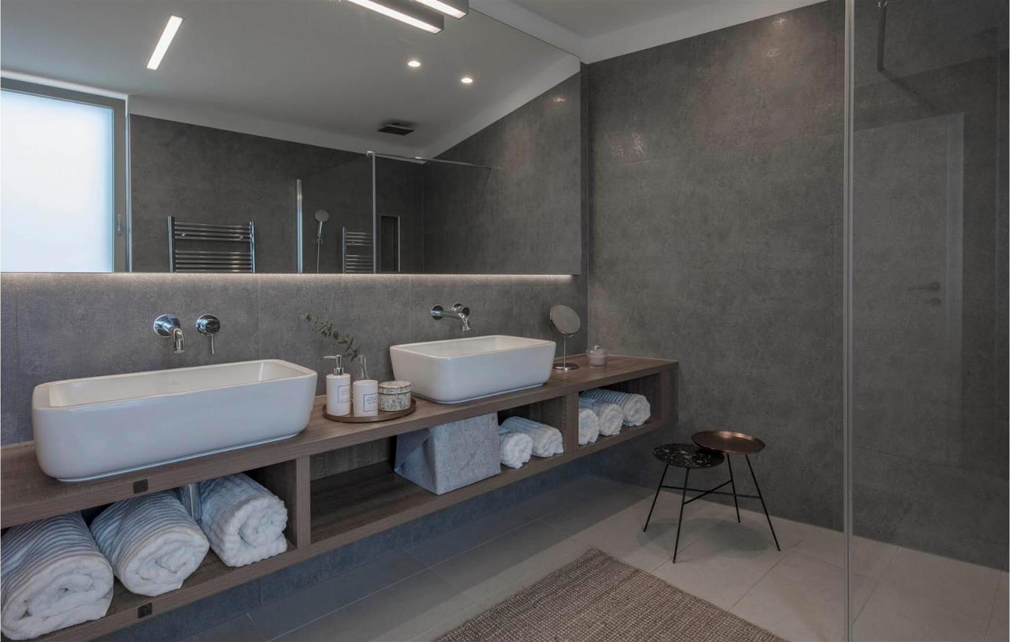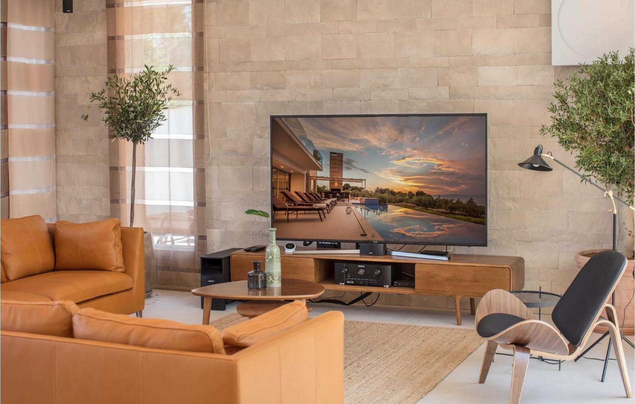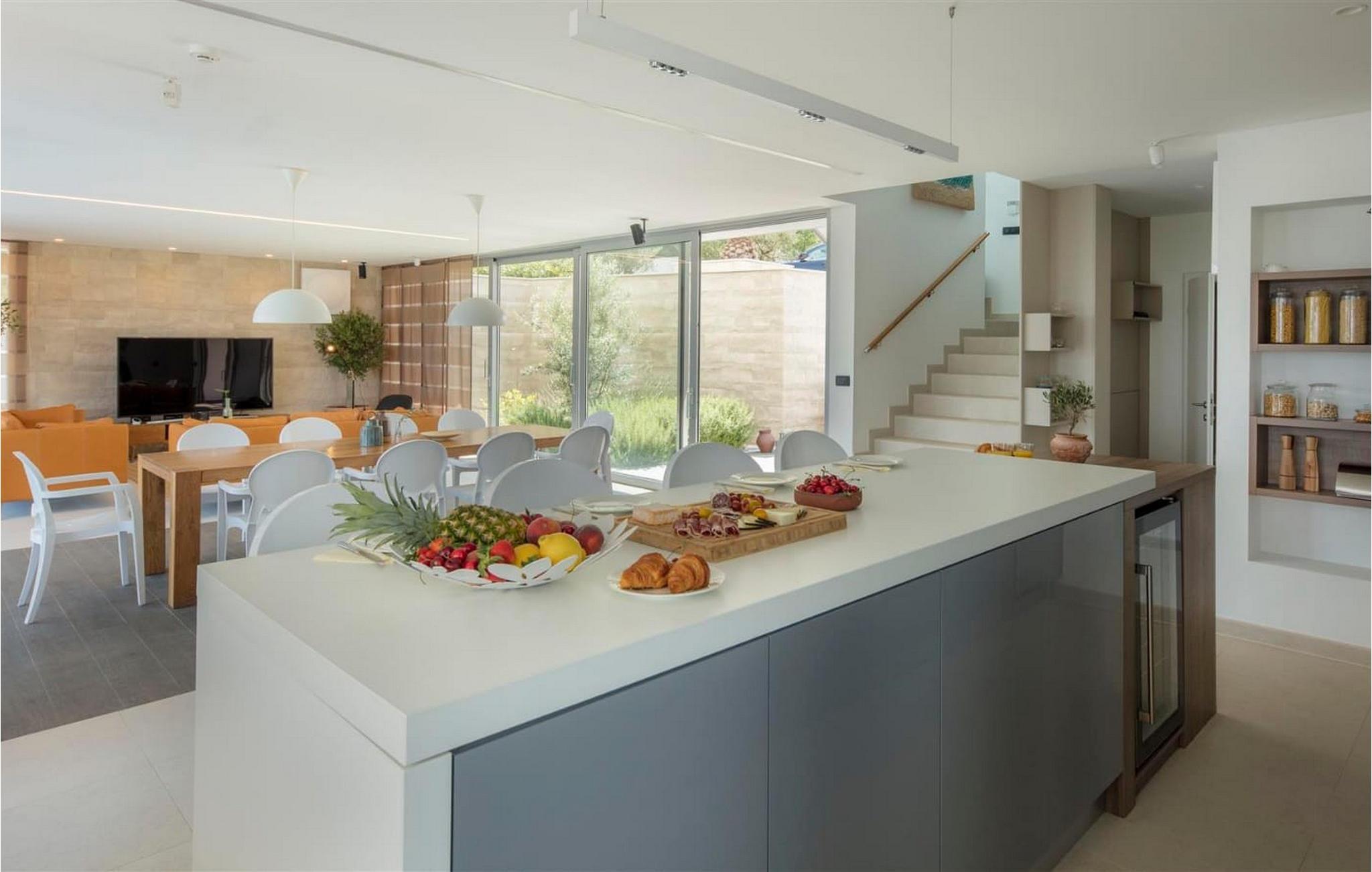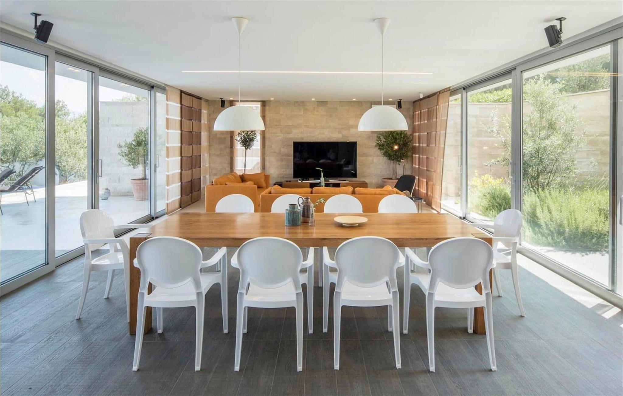 Den luksuriøse Villa Elegant har en indbydende atmosfære, hvor varme, naturlige toner og elegante materialer skaber en harmonisk boligoplevelse. Slap af i den rummelige opholdsstue og nyd udsigten over haven, poolen og havet gennem gulv-til-loft-vinduerne. Del måltider sammen ved det lange træbord eller find sammen her til en sjov spilleaften. Tag en pause på de stilfulde sofaer eller hygg jer med en filmaften foran det store fjernsyn.