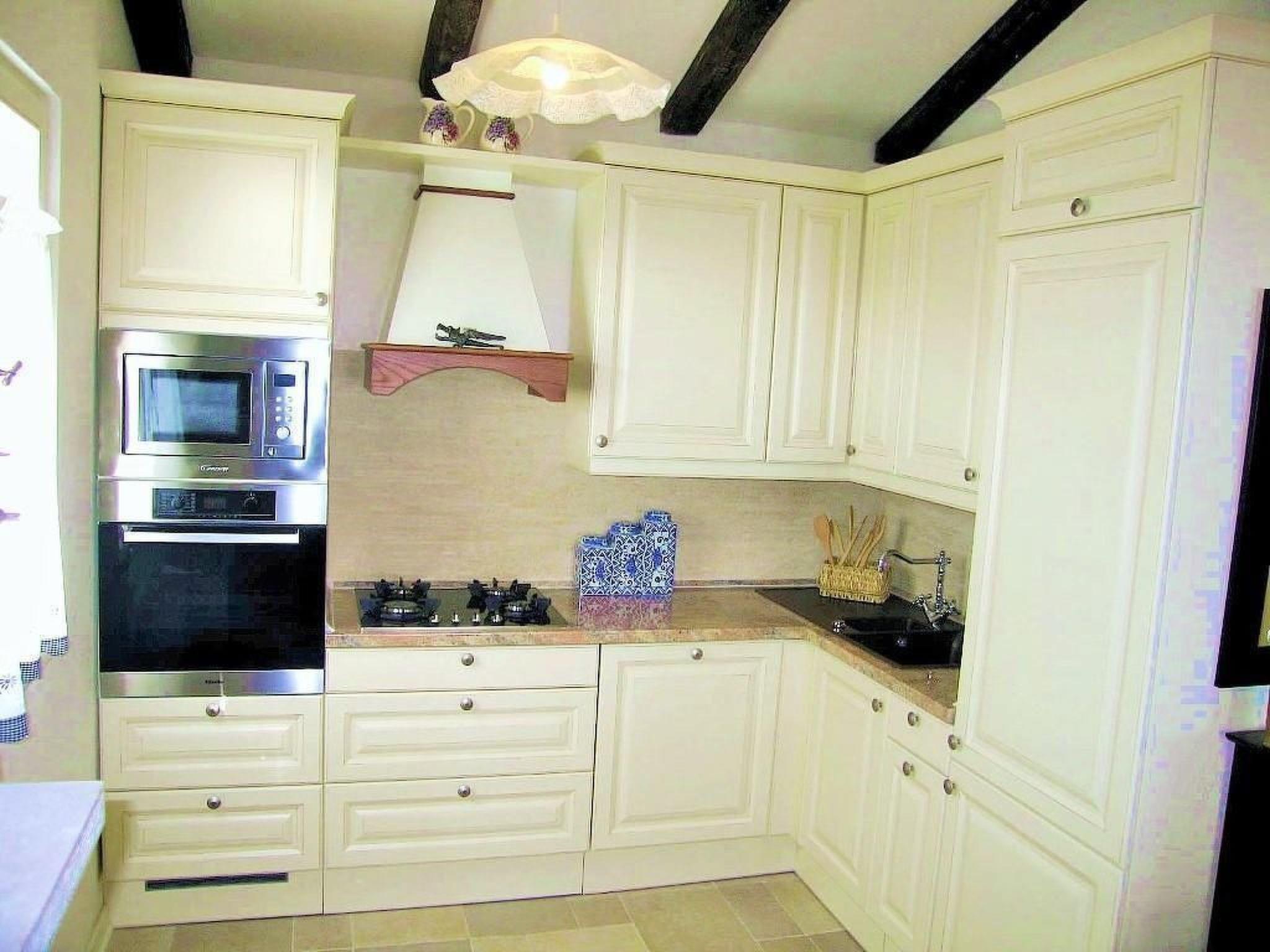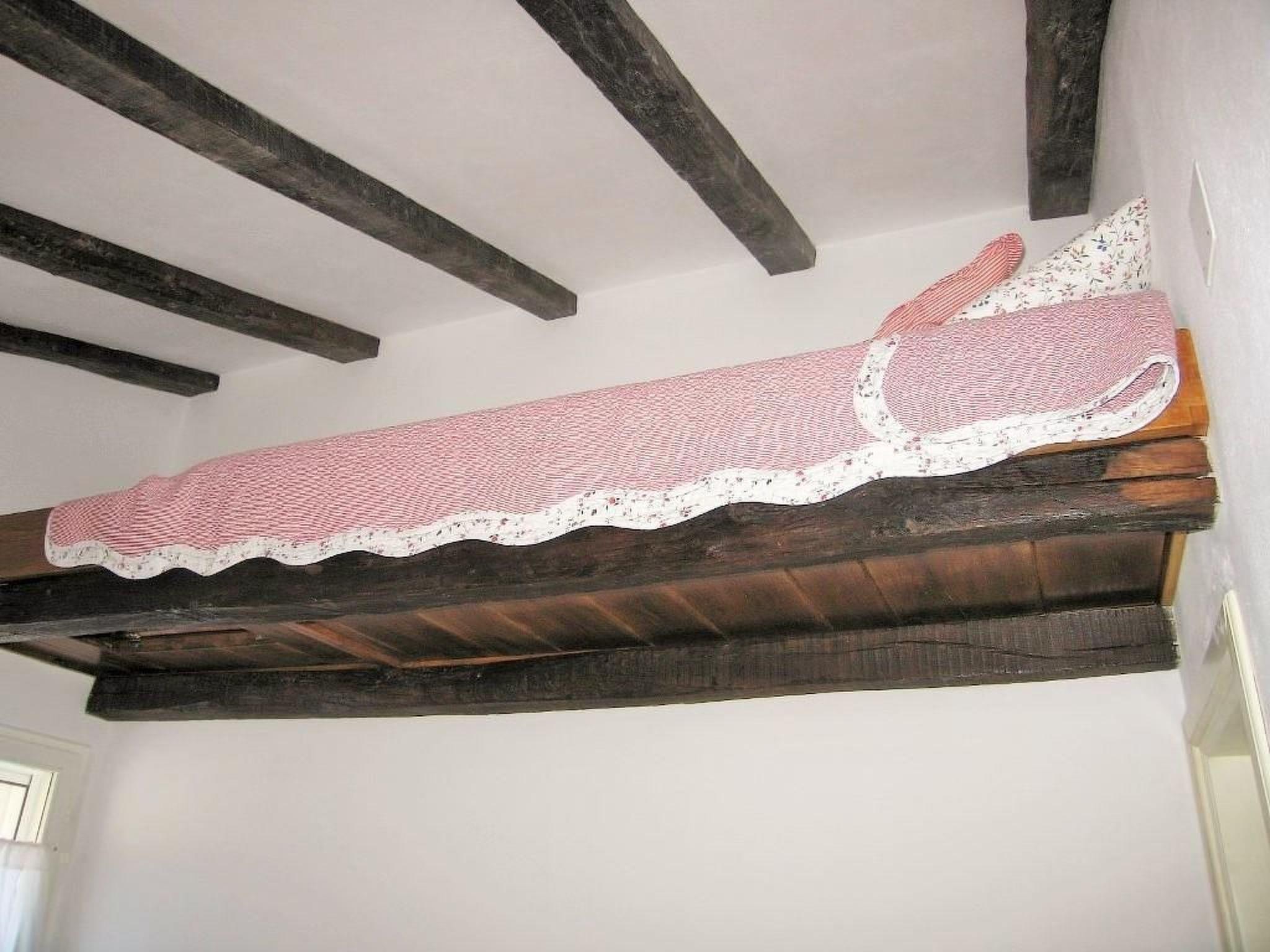 The holiday house of around 80 m² has a comfortable interior. All the rooms occupy one floor. The living room has a custom-made, upholstered sofa and a stone fireplace. The open, modern kitchen is equipped with a dishwasher, a microwave and a double sink. There is also a dining table in the living room. China tableware is available for special occasions. The floor is laid with Italian tiles and there are wooden beams on the ceiling. One of the two bedrooms has a gallery with a customized single bed. This sleeping gallery, which is accessed via a ladder, is ideal for a child. Parents, on the other hand, will enjoy their bedroom with a double bed and a view of the crystal clear sea from the bed. The second bedroom also has a double bed. The beds have fine bedlinen. There are also two folding beds that can be set up in the living room. The owner can also provide a cot. The bathroom has a toilet, washbasin and a modern walk-in shower.