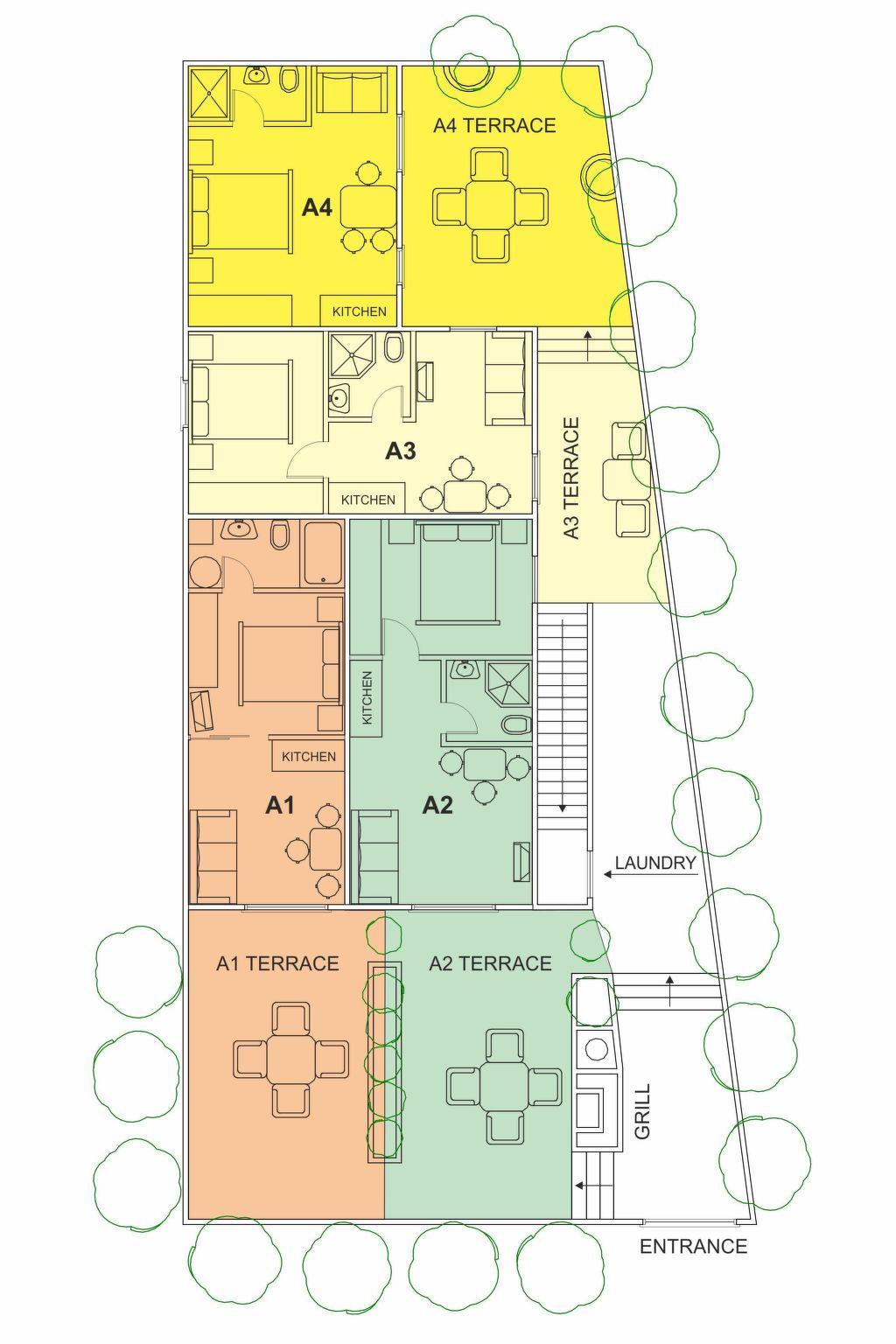 Three one-bedroom and one studio apartment (cca. 25 m2 each) are on the ground floor of the house.