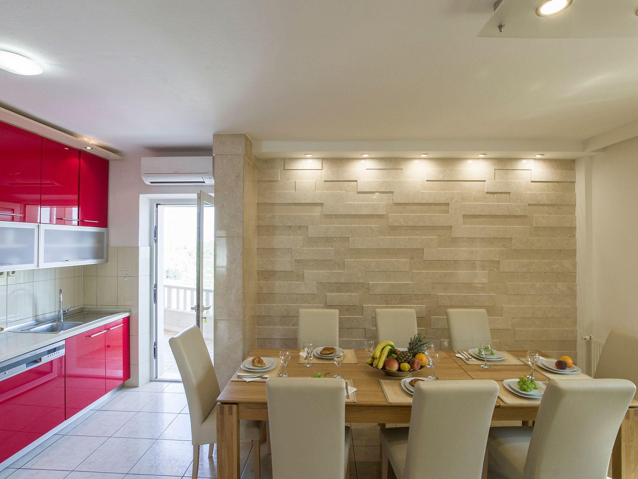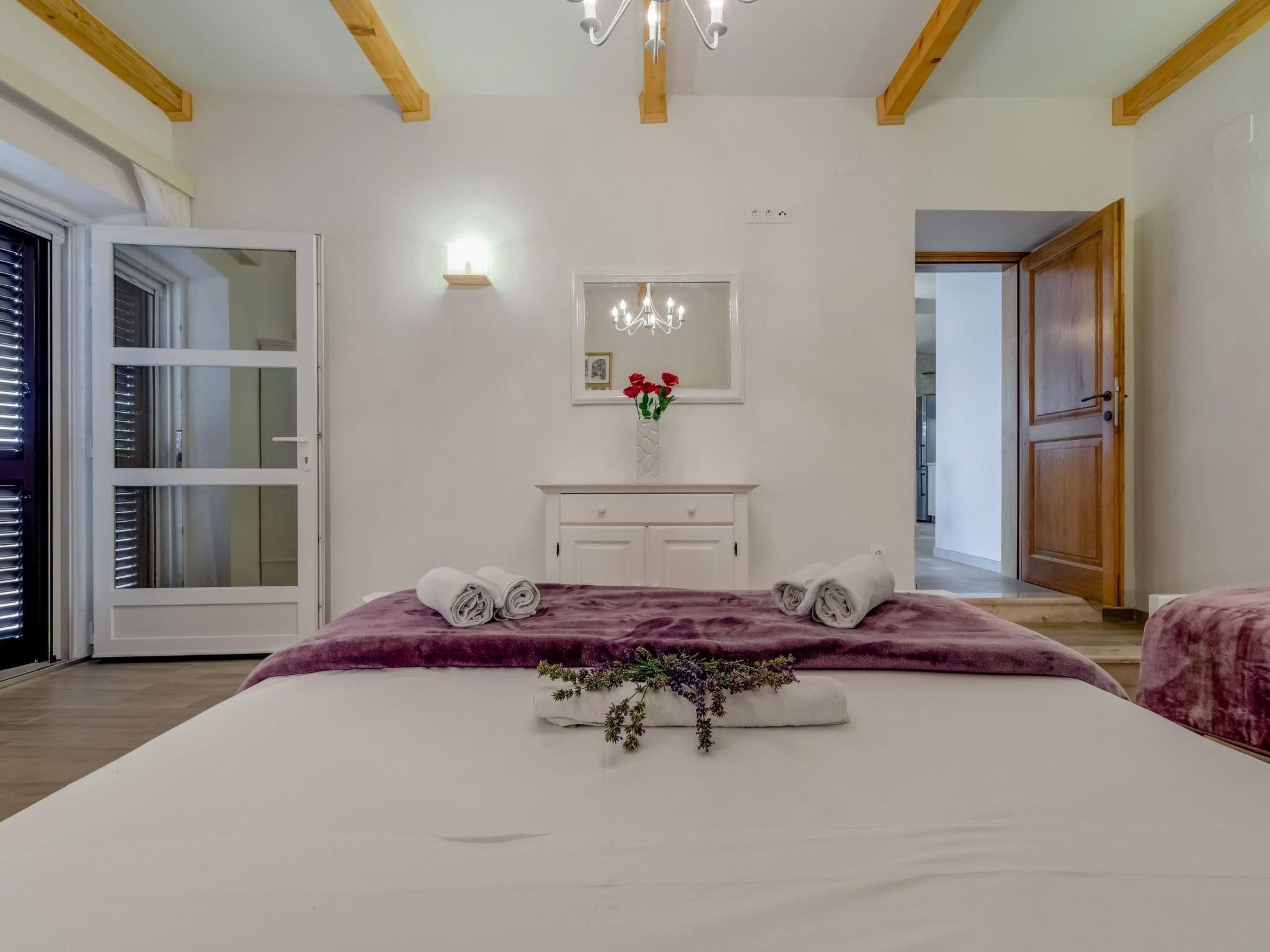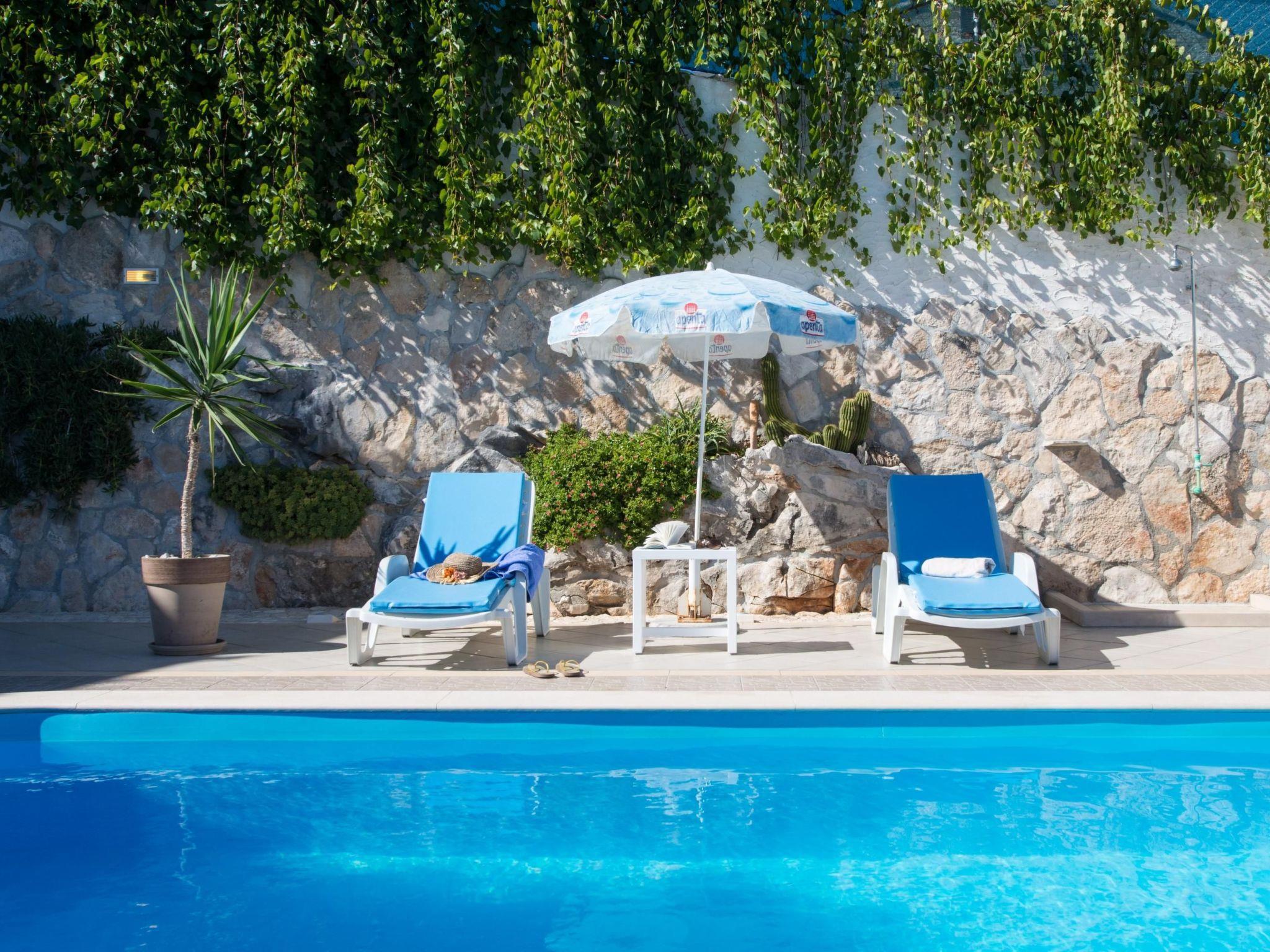 Another highlight of this villa is the generous outdoor area. It offers absolute privacy. The garden and the terrace afford a fabulous view of the mountains and the Sumartin bay. Make yourselves comfortable on the deckchairs by the pool or relax in the whirlpool. Next to the pool there is a furnished gazebo and there is also an outdoor shower. There is a grill area for sociable grill evenings with family and friends. There are five car parking spaces right by the house.
