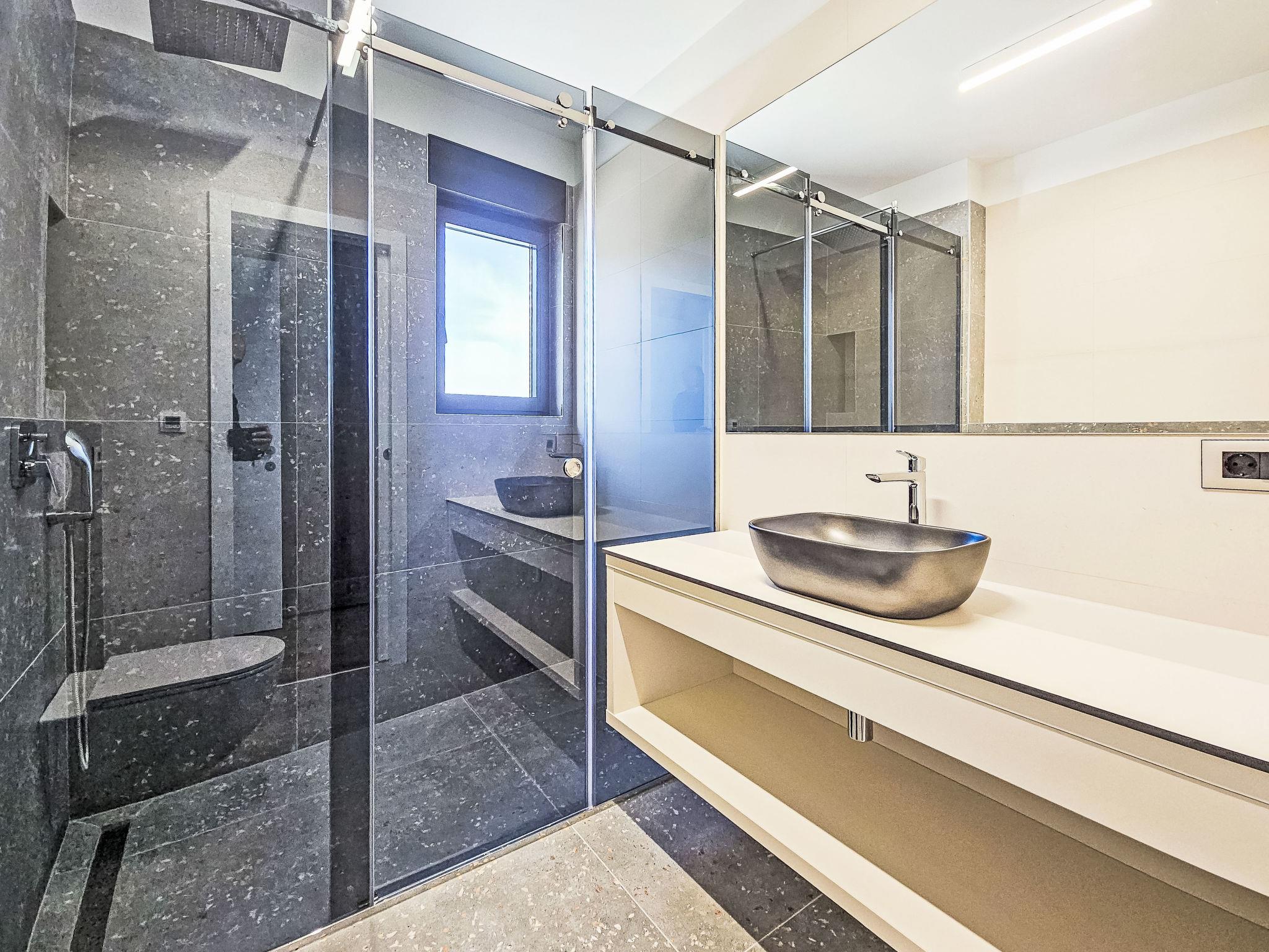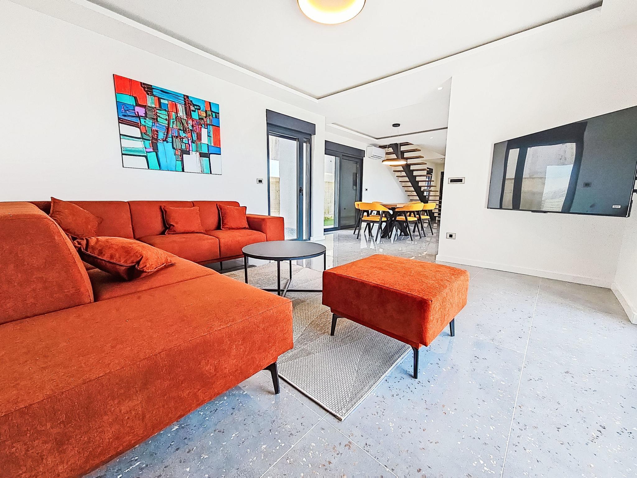 4-room villa 170 m2 on 2 levels. Living/dining room with satellite TV (flat screen), air conditioning. Exit to the terrace. 1 room with 1 french bed (160 cm, length 200 cm), shower/WC and satellite TV (flat screen), air conditioning. Exit to the terrace. Open kitchen (oven, dishwasher, 4 ceramic glass hob hotplates, microwave, freezer, electric coffee machine). Sep. WC. Upper floor: 2 rooms, each room with 1 french bed (180 cm, length 200 cm), shower/WC and satellite TV (flat screen), air conditioning. Exit to the balcony. Balcony 5 m2. Deck chairs (3). View of the sea. Facilities: children's high chair, baby cot, hair dryer. Internet (WiFi, free).