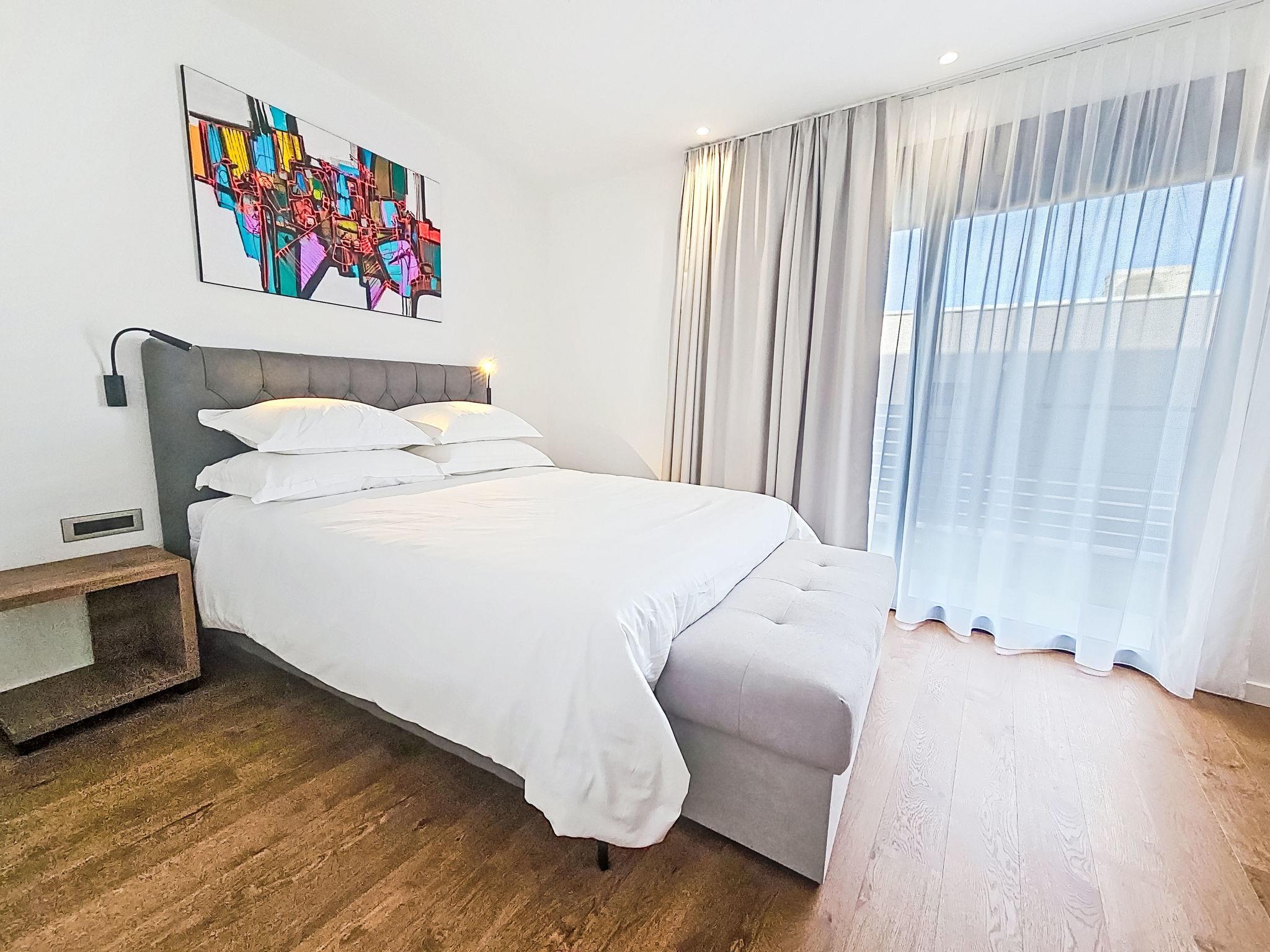 4-room villa 170 m2 on 2 levels. Living/dining room with satellite TV (flat screen), air conditioning. Exit to the terrace. 1 room with 1 french bed (160 cm, length 200 cm), shower/WC and satellite TV (flat screen), air conditioning. Exit to the terrace. Open kitchen (oven, dishwasher, 4 ceramic glass hob hotplates, microwave, freezer, electric coffee machine). Sep. WC. Upper floor: 2 rooms, each room with 1 french bed (180 cm, length 200 cm), shower/WC and satellite TV (flat screen), air conditioning. Exit to the balcony. Balcony 5 m2. Deck chairs (3). View of the sea. Facilities: children's high chair, baby cot, hair dryer. Internet (WiFi, free).