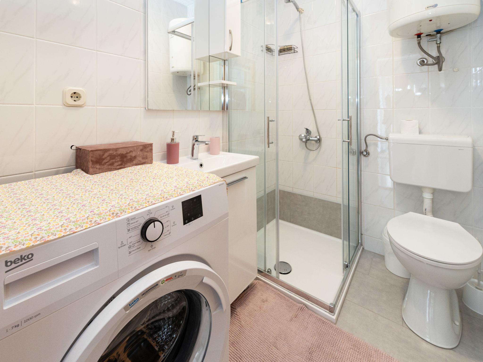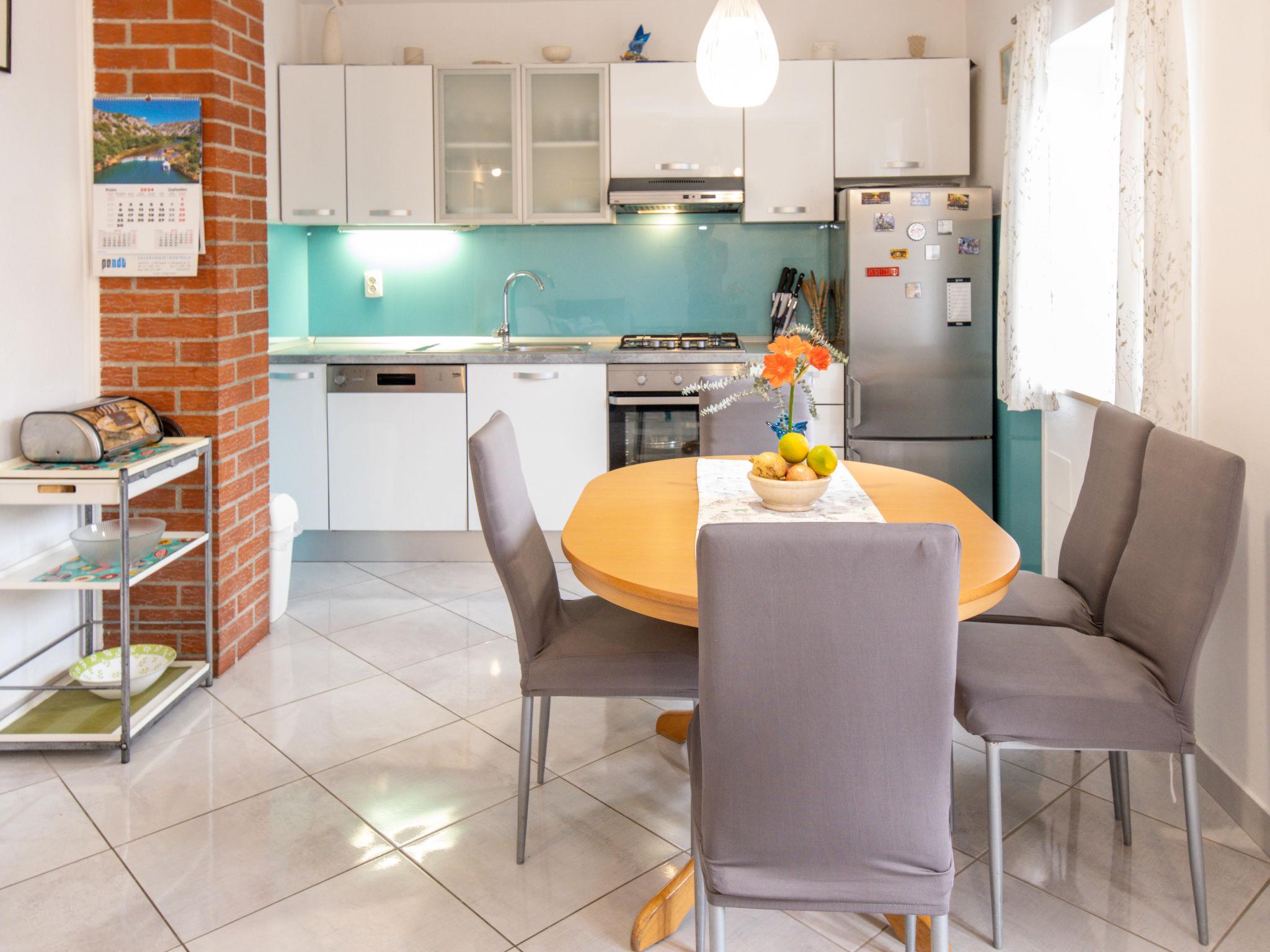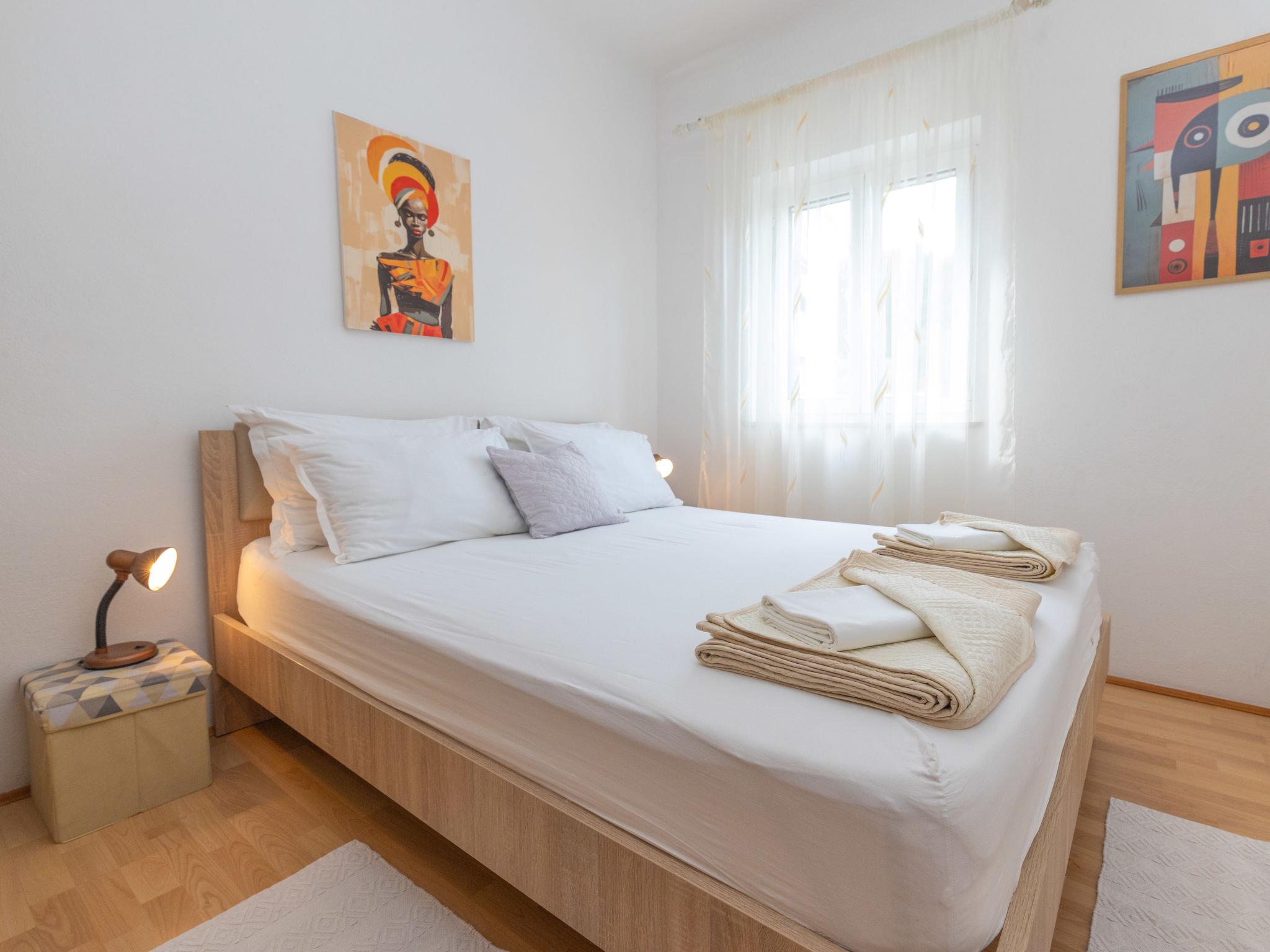 "Ana", 6-room semi-detached house 100 m2 on 2 levels. Living/dining room with 1 sofabed, satellite TV and air conditioning. 1 room with 1 double bed. 1 room with 2 beds. Open kitchen (4 hot plates, oven, dishwasher, toaster, electric coffee machine). Shower/WC. Upper floor: (exterior staircase) living/dining room with 1 sofabed, satellite TV and air conditioning. Exit to the balcony. 1 room with 1 double bed. 1 room with 2 beds. Open kitchen (4 hot plates, oven, toaster, electric coffee machine). Shower/WC. No heating option. 2 balconies, terrace. Terrace furniture, balcony furniture. View of the sea. Facilities: Internet (WiFi, free). Please note: non-smoking house. The house consists of 2 apartments rented as one unit. The first apartment on the ground floor with living/dining area, open kitchen and 2 bedrooms. the second apartment on the upper floor with living/dining area, open kitchen and 2 bedrooms. The propety with all of its content is for private use.