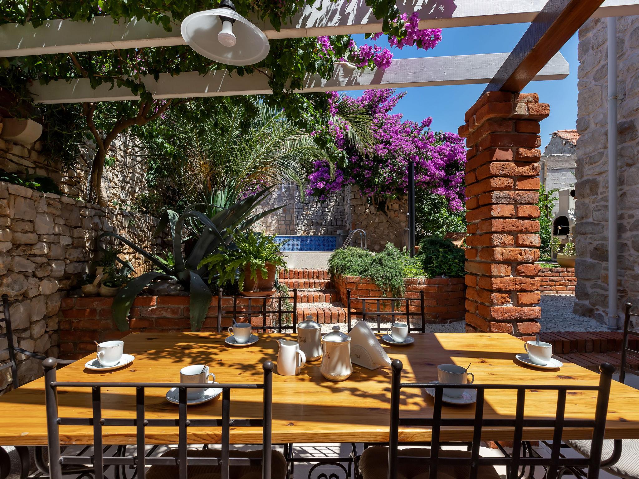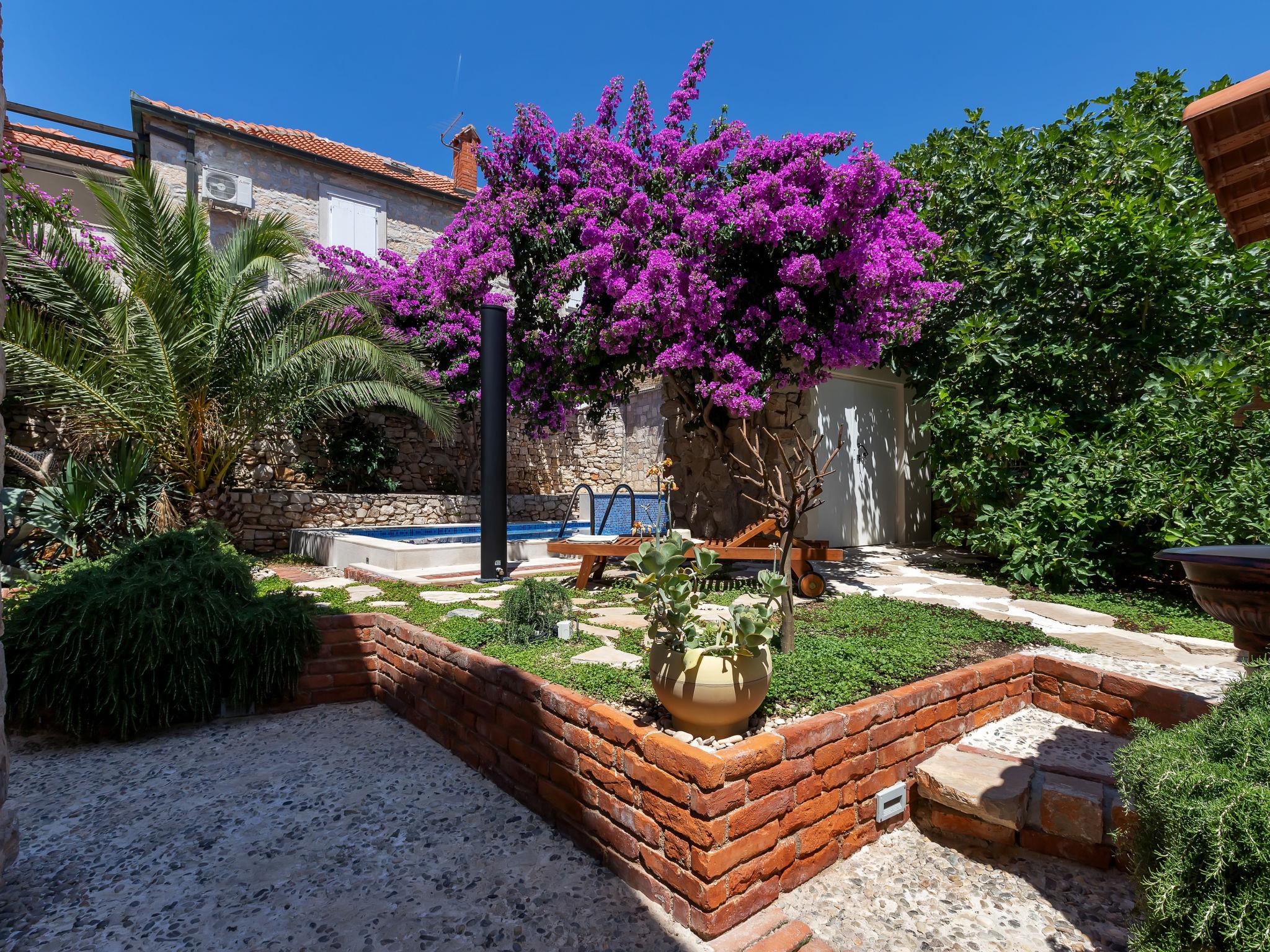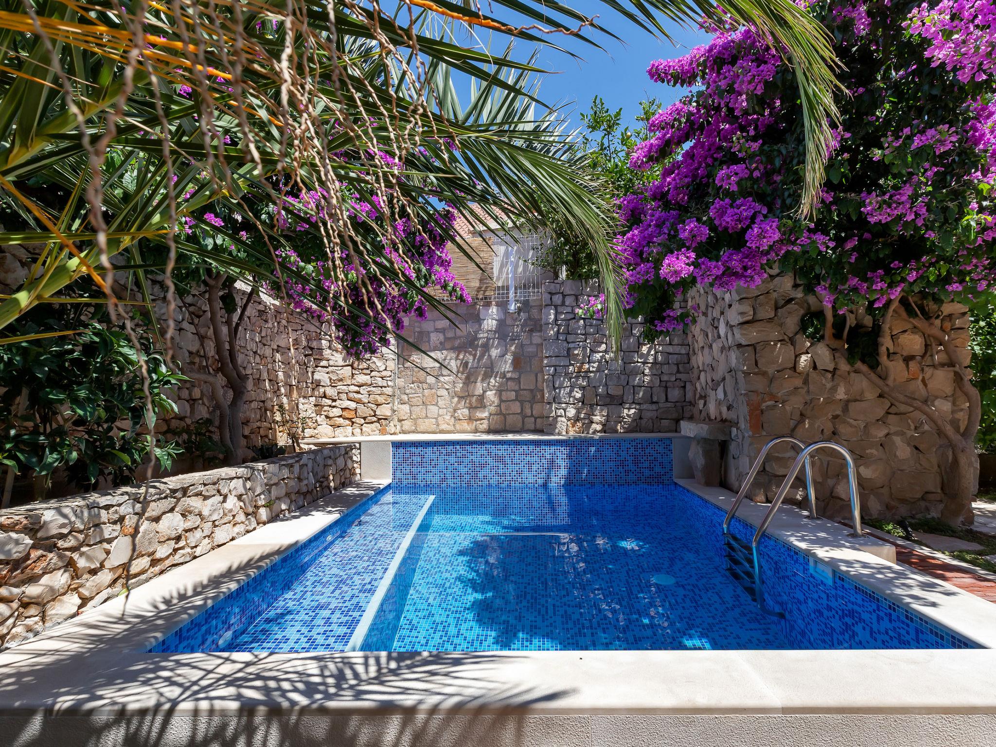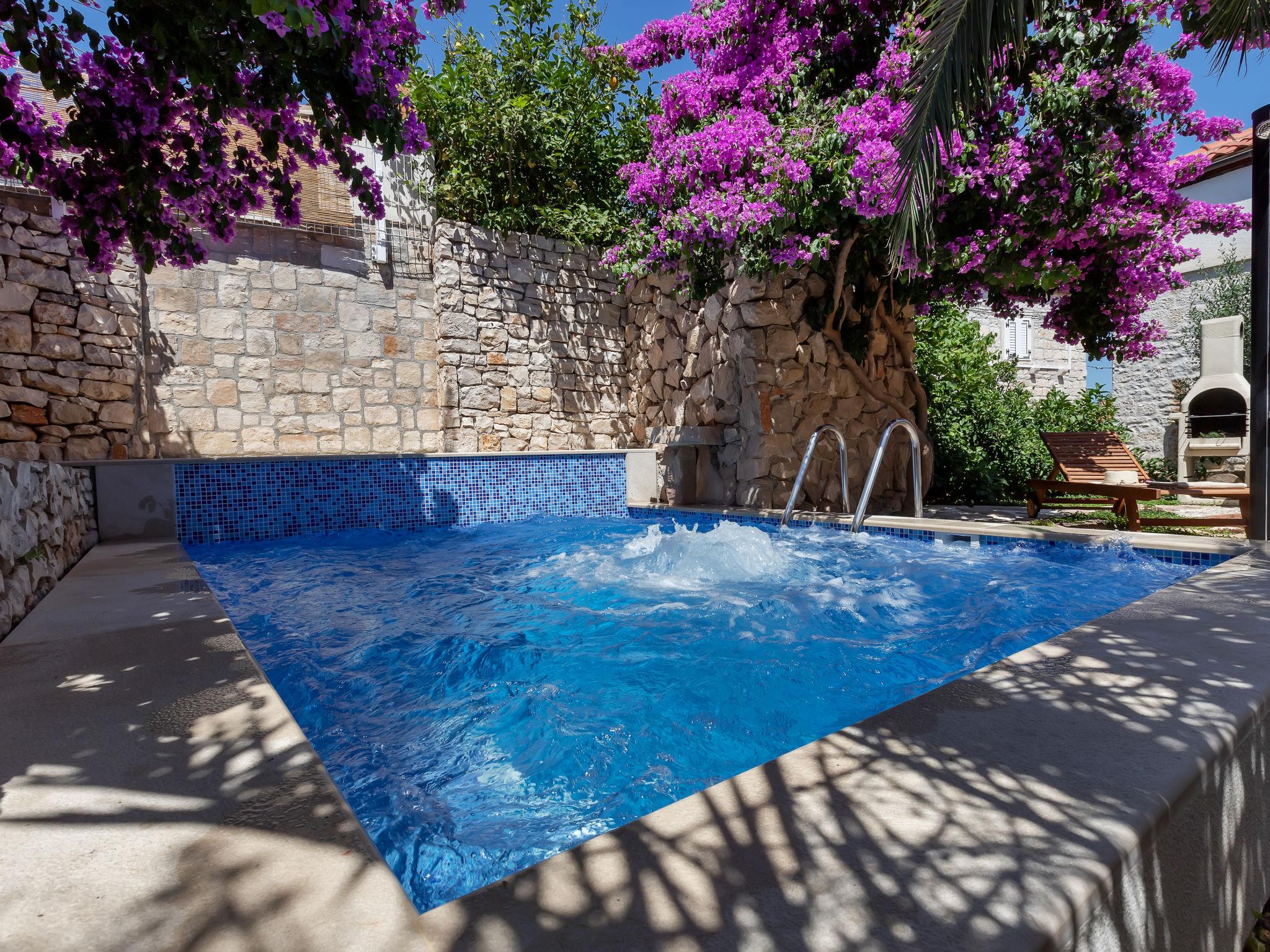 Single-family house "Marijan", 2 storeys. In a sunny position, excellent location: right in the centre but still quiet, in the heart of the city, 50 m from the sea, 50 m from the beach. Private: property 120 m2 (fenced), well-kept terraced garden, swimming pool angular, heated (4 x 3 m, 14 m2, depth 150 cm, seasonal availability: 10.Apr. - 10.Oct.) with salt-electrolysis pool-cleaning system. Outdoor shower, barbecue. In the house: internet access, roof terrace, washing machine. Parking (for 2 cars) at the house on the premises. Shop, restaurant 400 m, bus stop 1 km, pebble beach 50 m. Swimming pool with hydromassage. Parking space for 2 small cars.