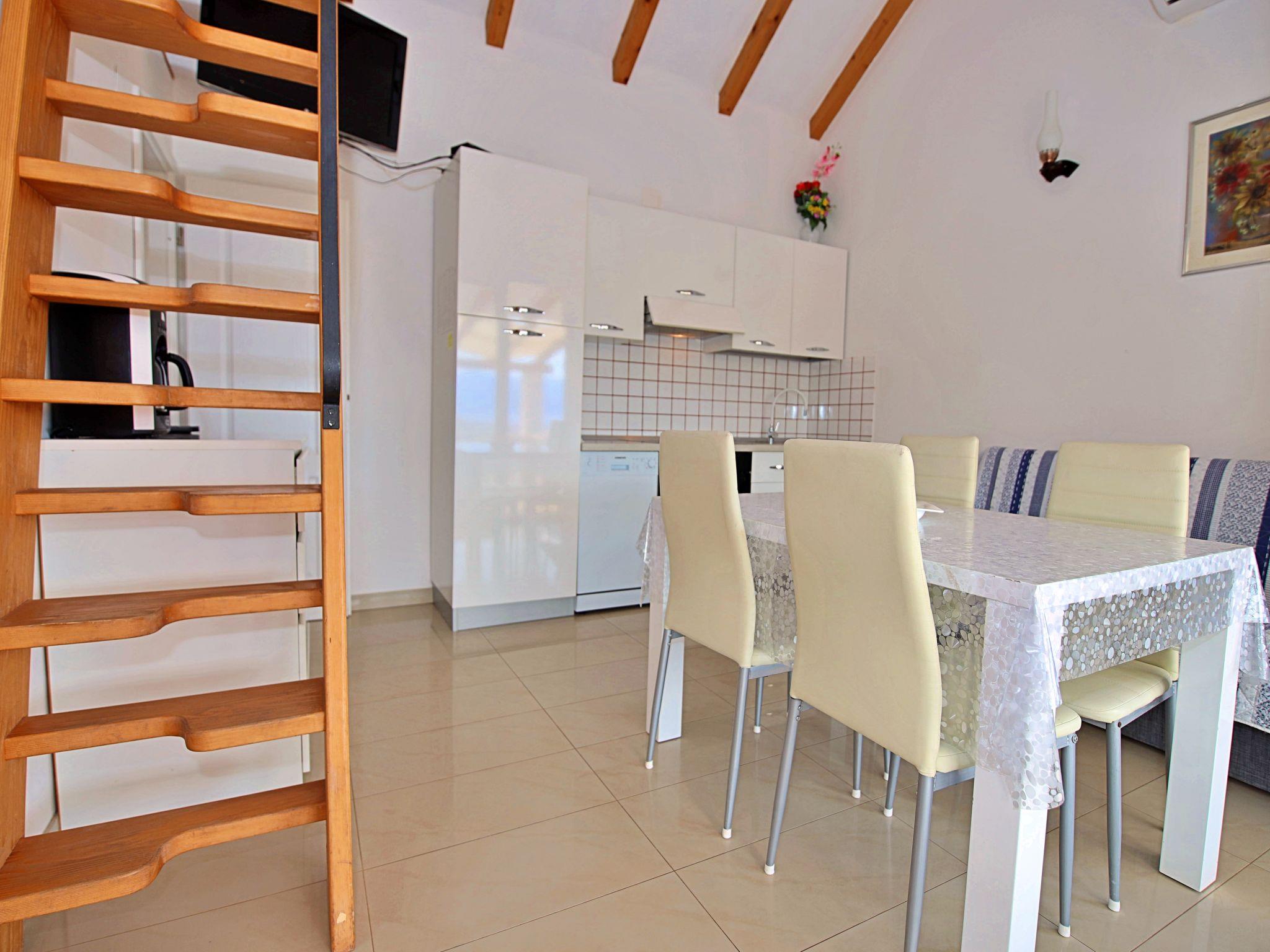 2-room house 29 m2 on 2 levels. Living/dining room with satellite TV (flat screen), air conditioning. Exit to the terrace. 1 room with 1 french bed (160 cm, length 200 cm). Open kitchen (4 hot plates, oven, dishwasher, freezer). Shower/WC. Top floor: (ladder) open gallery, with sloping ceilings, ceiling height 100 - 200 cm with 1 french bed (150 cm, length 200 cm). Terrace 22 m2, roofed. Terrace furniture, deck chairs. Beautiful view of the sea. Facilities: Internet (WiFi, free). Maximum 1 pet/ dog allowed.