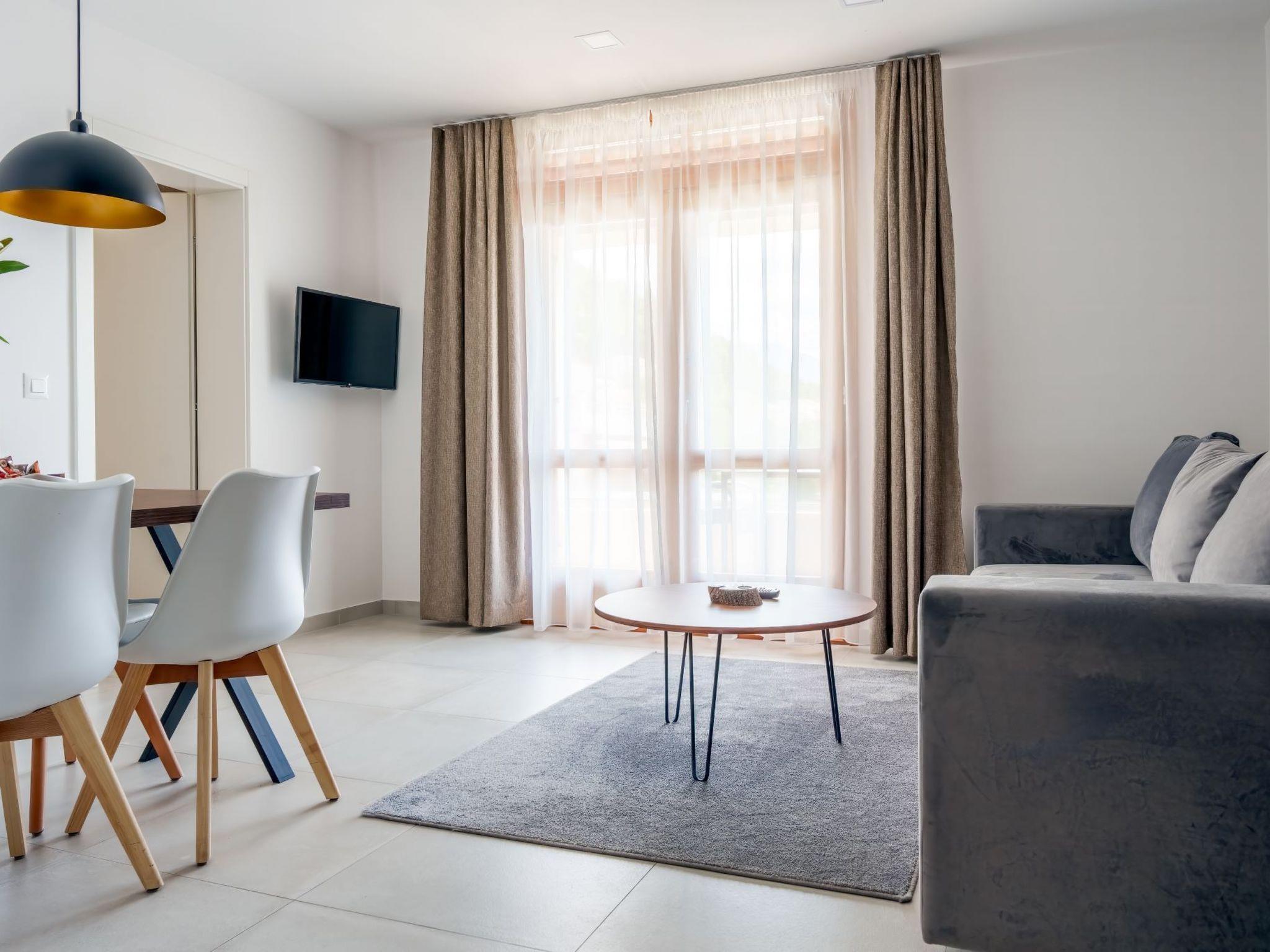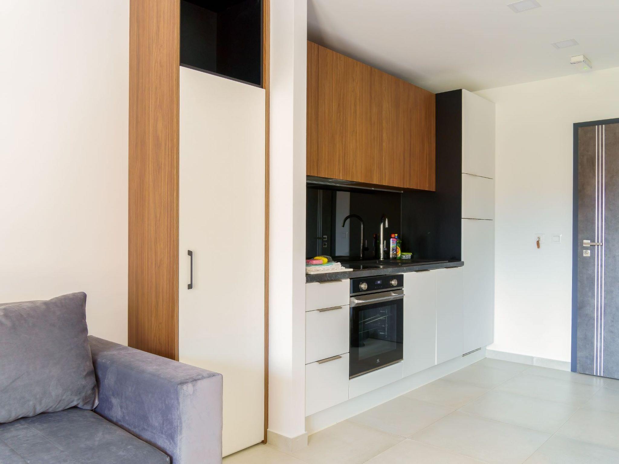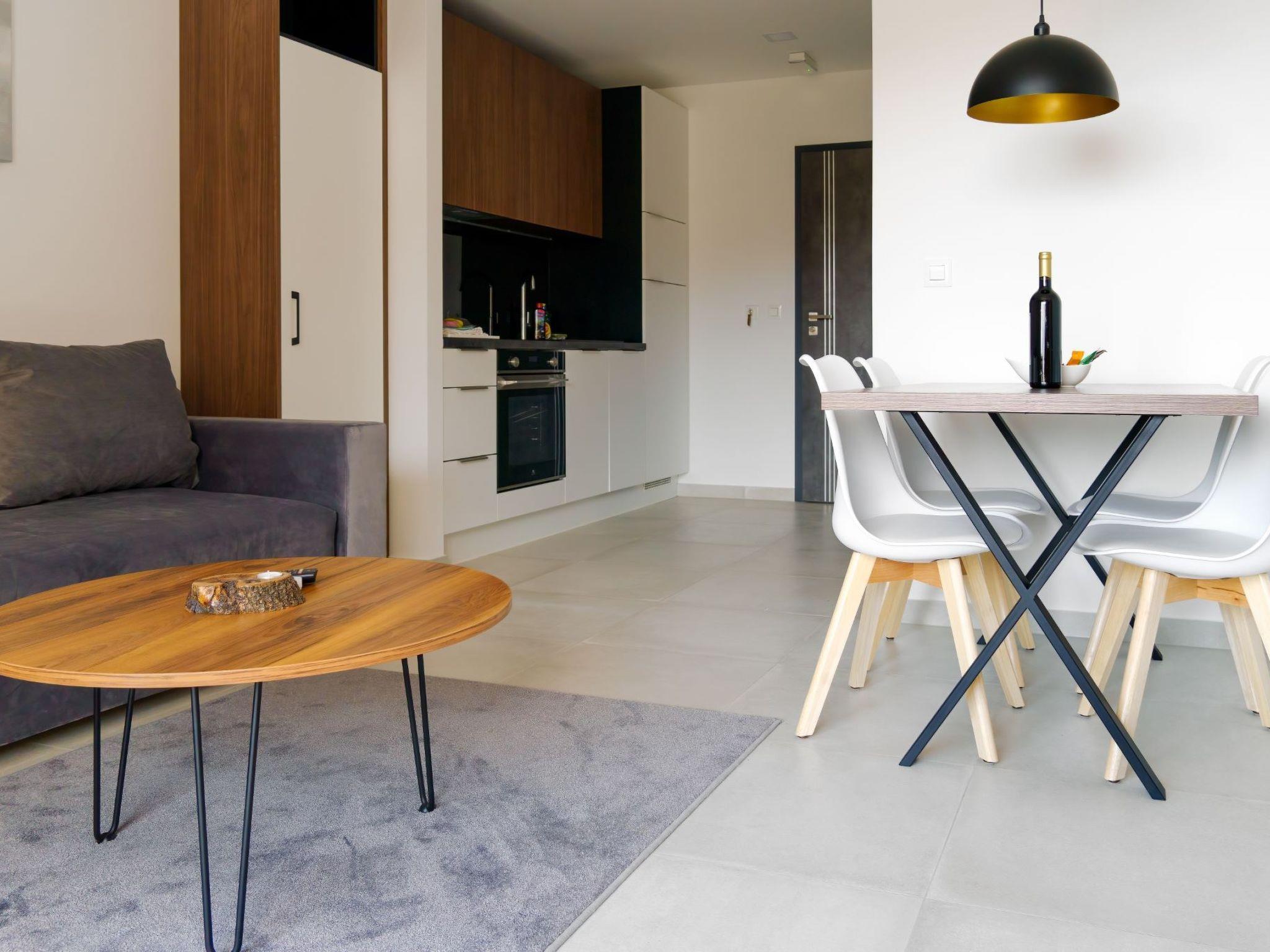 The fully air conditioned holiday apartment is on the first floor of the apartment building. It offers an open plan seating and dining area with a fully fitted kitchen complete with a dishwasher. An oven, a microwave and fridge are also provided, as well as a coffee machine and a kettle. The bright and airy bathroom has a modern shower cabin and provides bathrobes and free toiletries. The bedroom is furnished with a double bed. The sofa bed in the living room can accommodate two more persons. Bed linen is available. WiFi is free of charge.