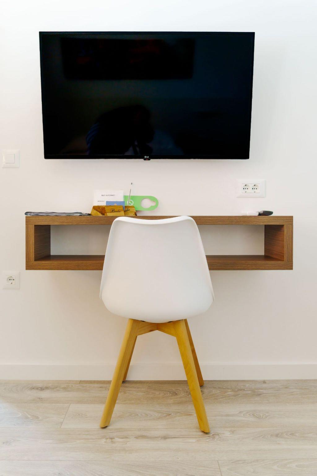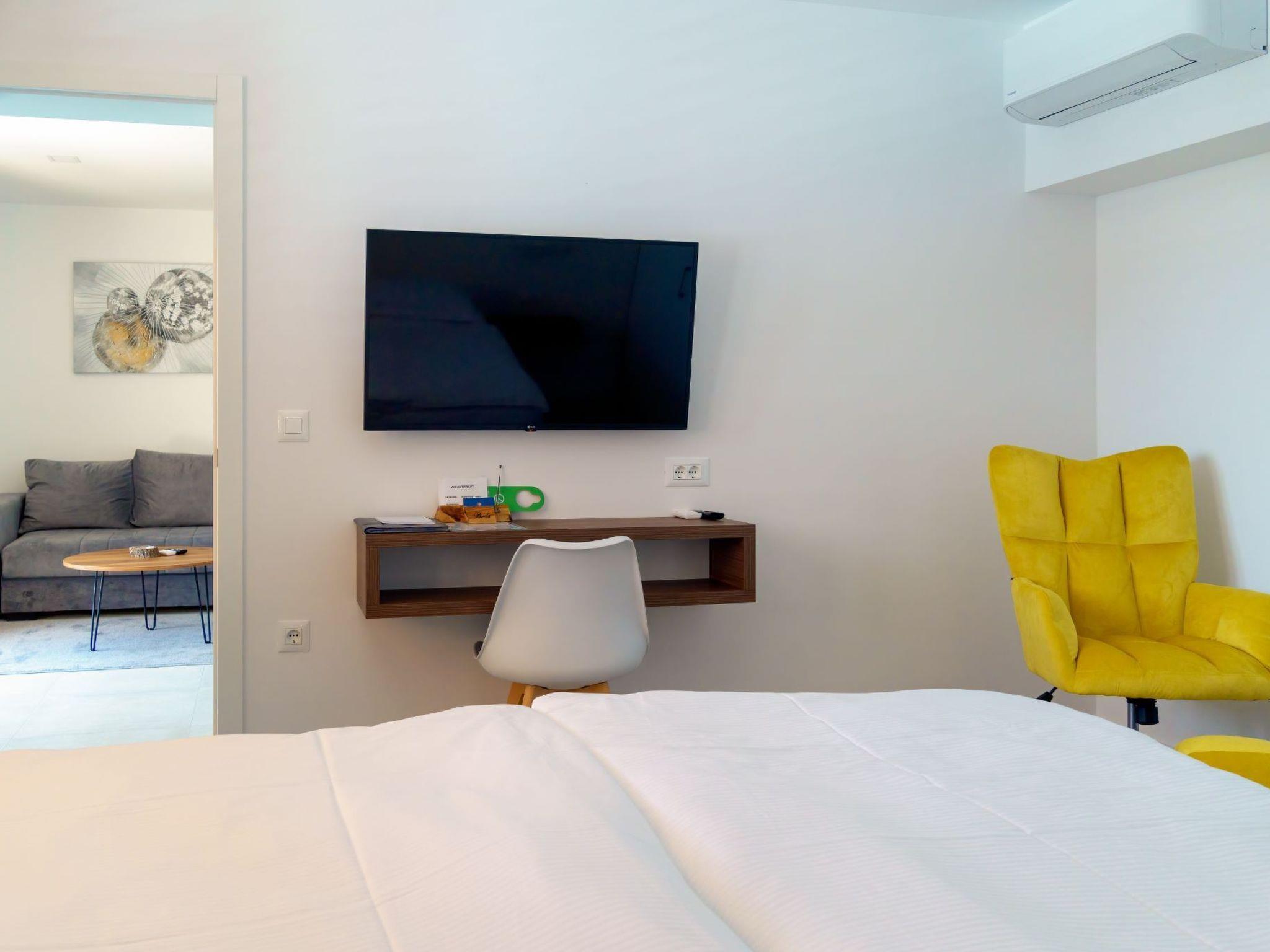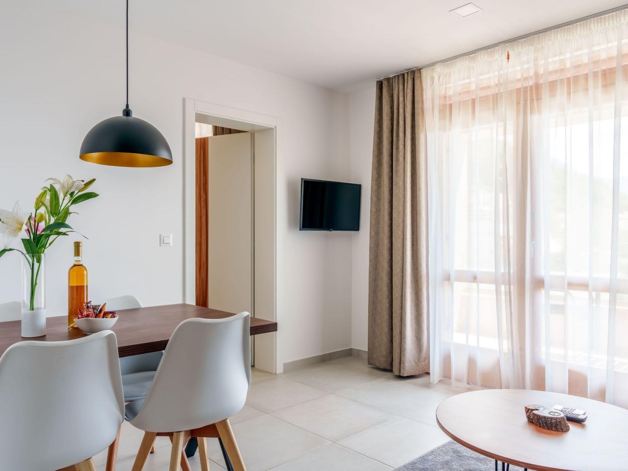 The fully air conditioned holiday apartment is on the first floor of the apartment building. It offers an open plan seating and dining area with a fully fitted kitchen complete with a dishwasher. An oven, a microwave and fridge are also provided, as well as a coffee machine and a kettle. The bright and airy bathroom has a modern shower cabin and provides bathrobes and free toiletries. The bedroom is furnished with a double bed. The sofa bed in the living room can accommodate two more persons. Bed linen is available. WiFi is free of charge.