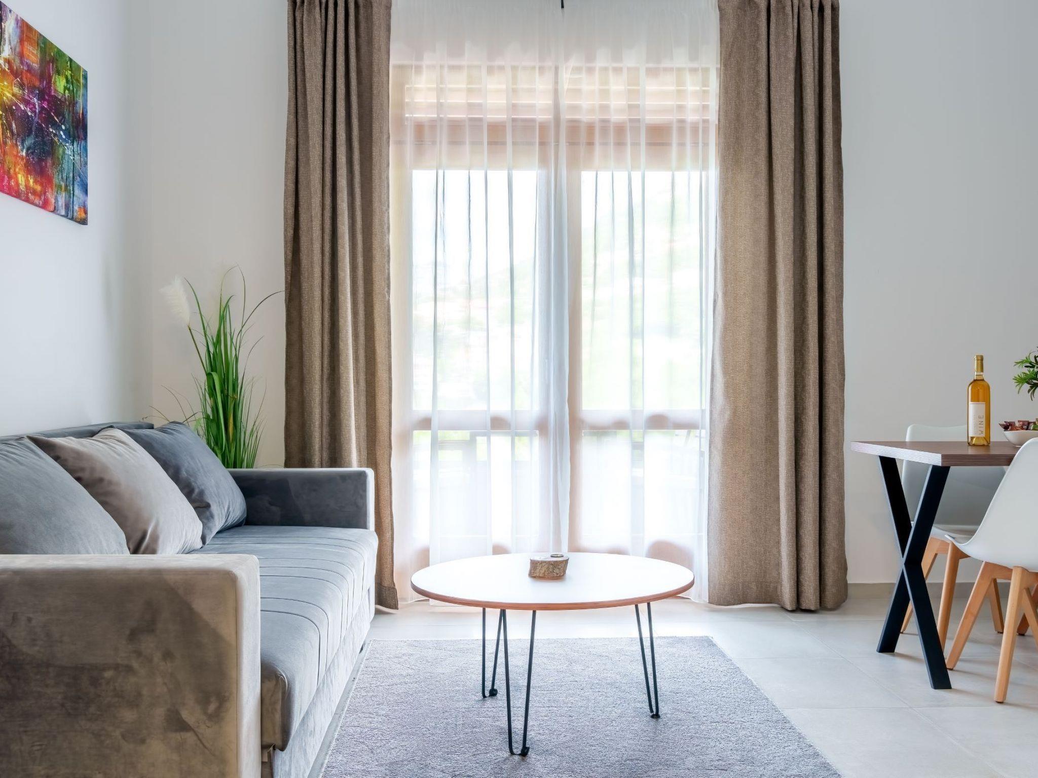The fully air conditioned holiday apartment is on the first floor of the apartment building. It offers an open plan seating and dining area with a fully fitted kitchen complete with a dishwasher. An oven, a microwave and fridge are also provided, as well as a coffee machine and a kettle. The two bright and airy bathrooms have a modern shower cabin and provide bathrobes and free toiletries. The bedrooms are furnished with a double bed each. Bed linen is available. WiFi is free of charge.