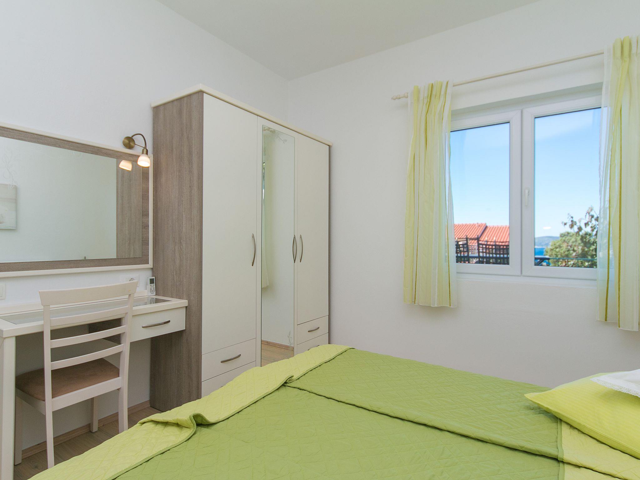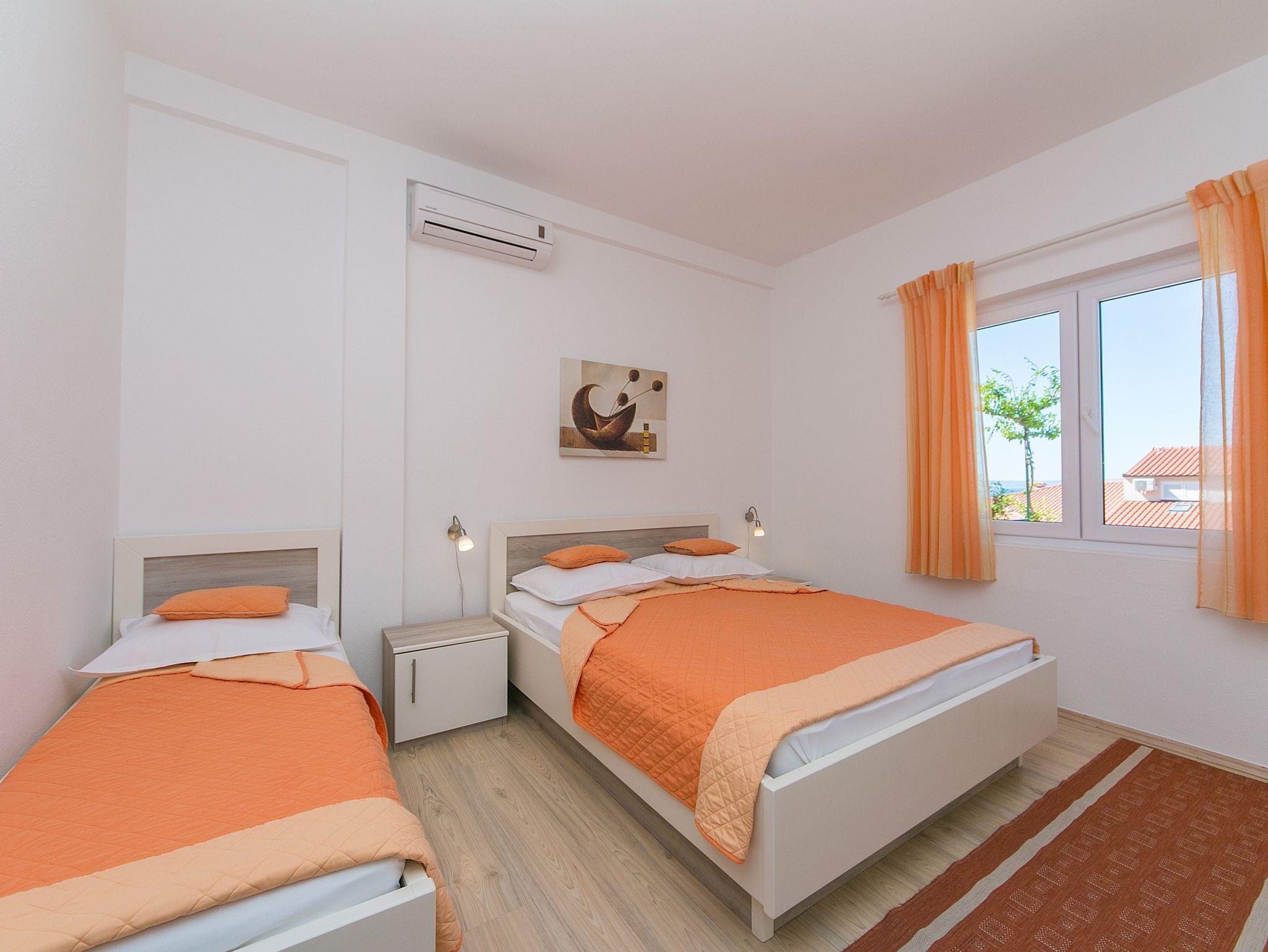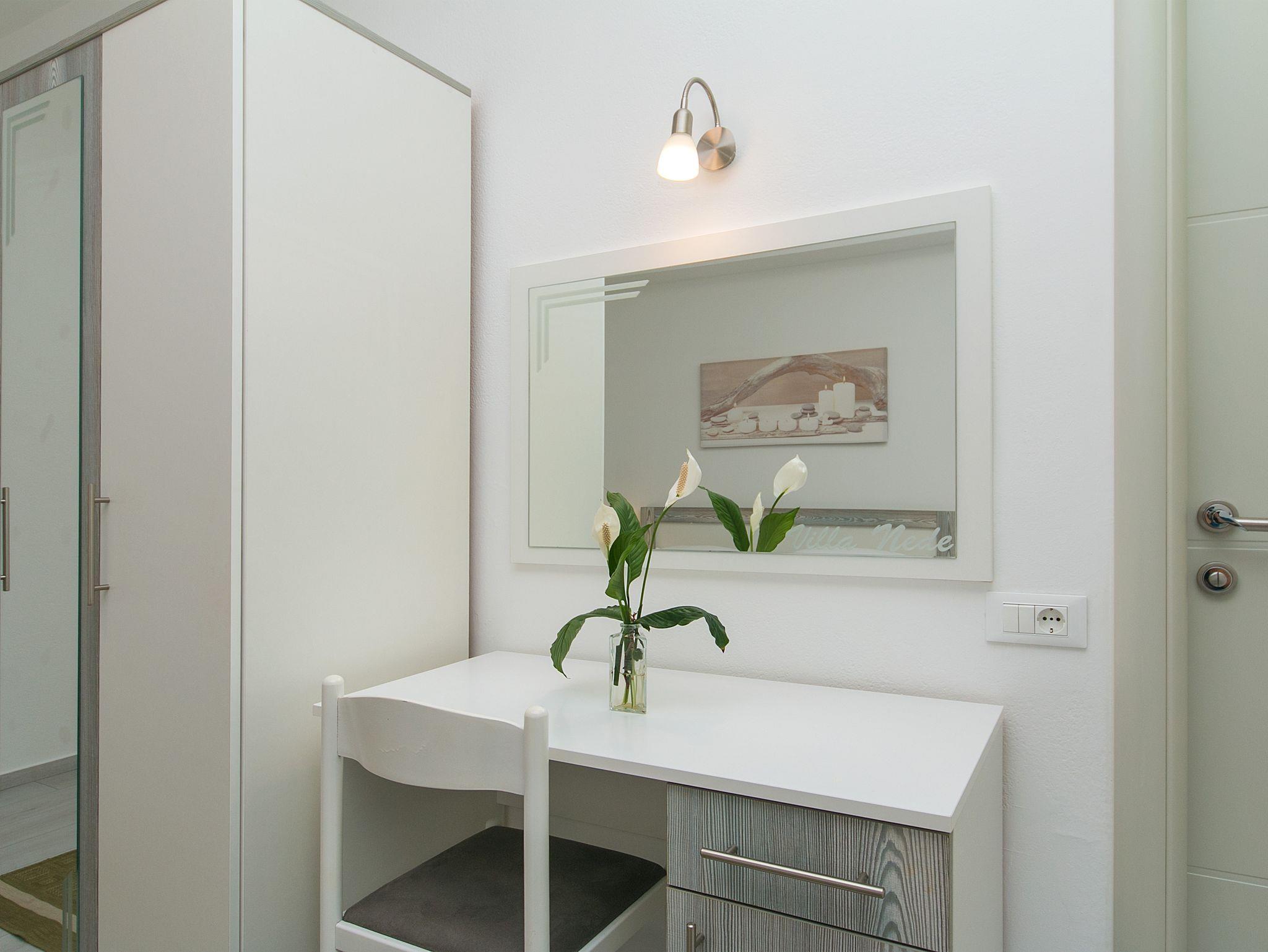 Ferienwohnung bietet Platz für 8 Gäste. Die Betten sind in Schlafzimmern, die es 3 gibt, innerhalb einer Gesamtfläche von 74m2, angeordnet. Die Gäste haben eine eigene Terrasse zur Verfügung, auf der sie in warmen Sommernächten genießen können. Das Apartment bietet Meerblick. IM PREIS INBEGRIFFEN: Kurtaxe, Endreinigung, Parkplatz, Internet, Föhn. VERBINDLICHE ZUSÄTZLICHE KOSTEN: Aufzahlung für Kurzaufenthalte (prozentualer Zuschlag pro Nächtigungsanzahl: 30% - 1, 20% - 2, 10% - 3). UNVERBINDLICHE ZUSÄTZLICHE KOSTEN: Klimatisierung (5,00 € pro Nacht), Wäschewaschen (10,00 € Waschen). Die Verfügbarkeit zusätzlicher Dienstleistungen in Ihrem reservierten Termin und die Preise derselben (falls nicht aufgeführt) müssen im Voraus überprüft werden. Zusätzliche Dienstleistungen die in der Zahlungsaufforderung nicht aufgeführt sind werden direkt beim Vermieter bezahlt, angenommen der Gast nutzt auch diese.