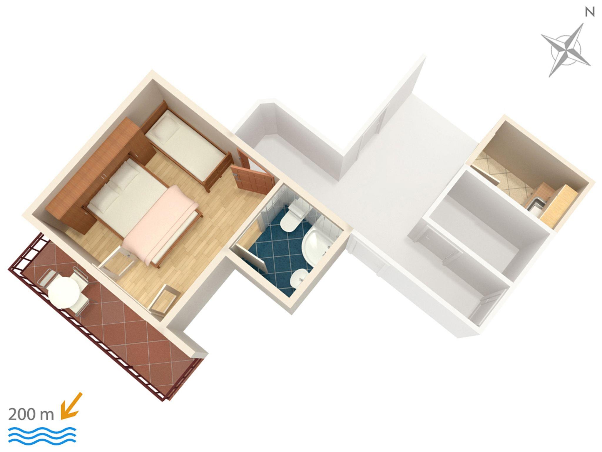 Studio bietet Platz für 3 Gäste. Die Betten sind in Schlafzimmern, die es 1 gibt, innerhalb einer Gesamtfläche von 20m2, angeordnet. Die Gäste haben einen eigenen Balkon zur Verfügung, auf der sie in warmen Sommernächten genießen können. Das Studio-Apartment bietet Meerblick. Es ist erlaubt, Speisen auf dem Gemeinschafts-Grill vorzubereiten. Unterkunftseinheit hat Räume, die von dem Rest der Einheit abgetrennt werden. IM PREIS INBEGRIFFEN: Kurtaxe, Endreinigung, Klimatisierung, Parkplatz, Internet, Bügeleisen, Bügelbrett, Föhn. VERBINDLICHE ZUSÄTZLICHE KOSTEN: Aufzahlung für Kurzaufenthalte (prozentualer Zuschlag pro Nächtigungsanzahl: 30% - 1, 20% - 2, 10% - 3). Die Verfügbarkeit zusätzlicher Dienstleistungen in Ihrem reservierten Termin und die Preise derselben (falls nicht aufgeführt) müssen im Voraus überprüft werden. Zusätzliche Dienstleistungen die in der Zahlungsaufforderung nicht aufgeführt sind werden direkt beim Vermieter bezahlt, angenommen der Gast nutzt auch diese.